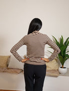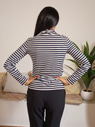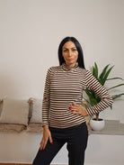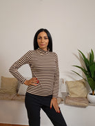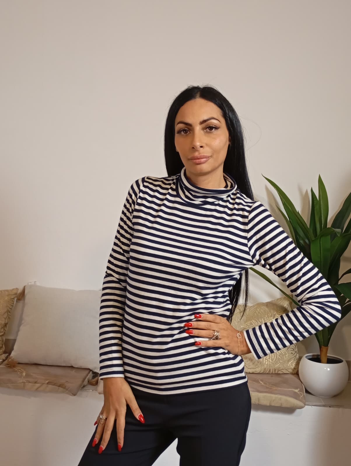 Maglia Katrika: maglia lupetto a righe garzate con collo alto che arriva fino alla vita. Realizzata in un tessuto morbido e caldo composto da 62% poliestere, 34% viscosa e 4% elastan. La modella indossa una taglia adatta per un’altezza di 175 cm e un peso di 54 kg.