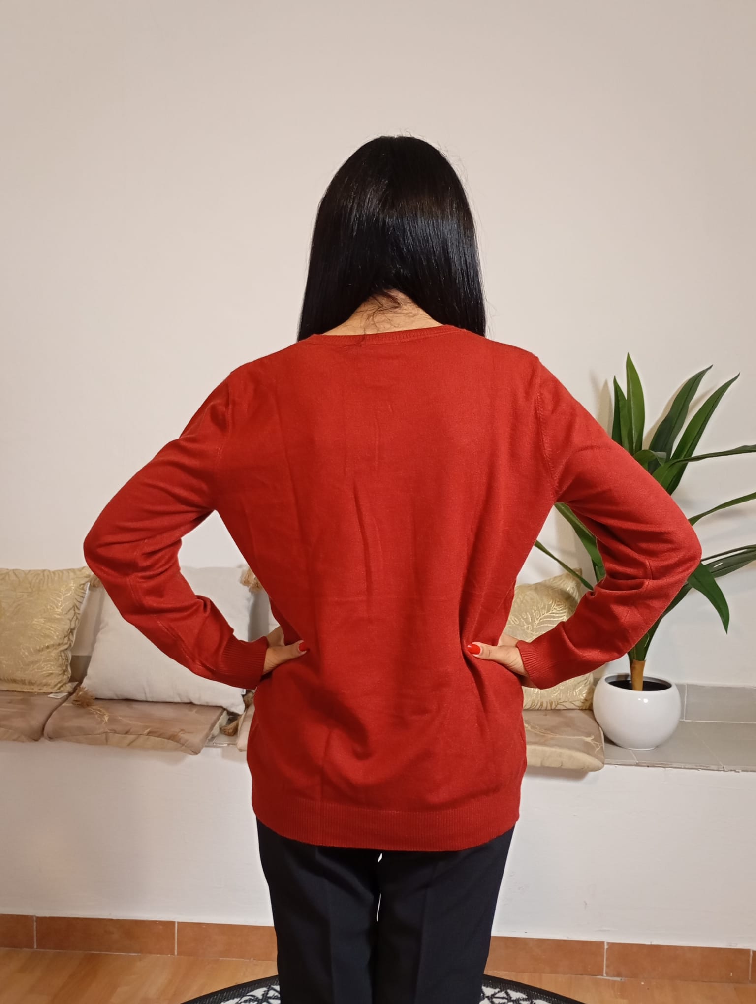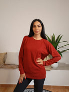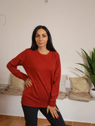 MAGLIA MAISON FORM ELLE. Maglia Bordeaux realizzata in tessuto semilucido e confortevole, con una lunghezza leggermente estesa. Presenta un dettaglio distintivo: una medaglietta con il logo del brand. La modella che la indossa è alta 175 cm e pesa 54 kg.