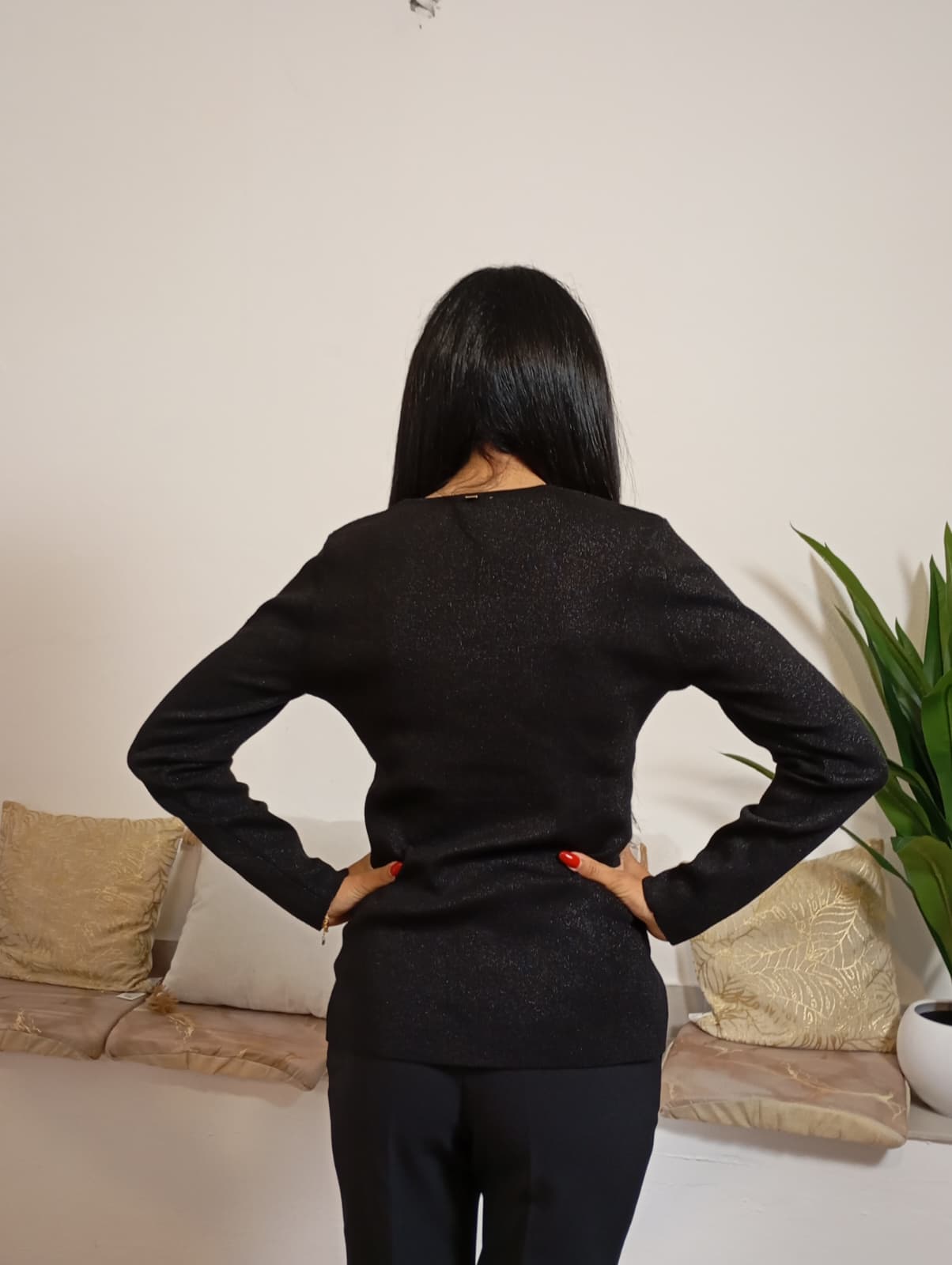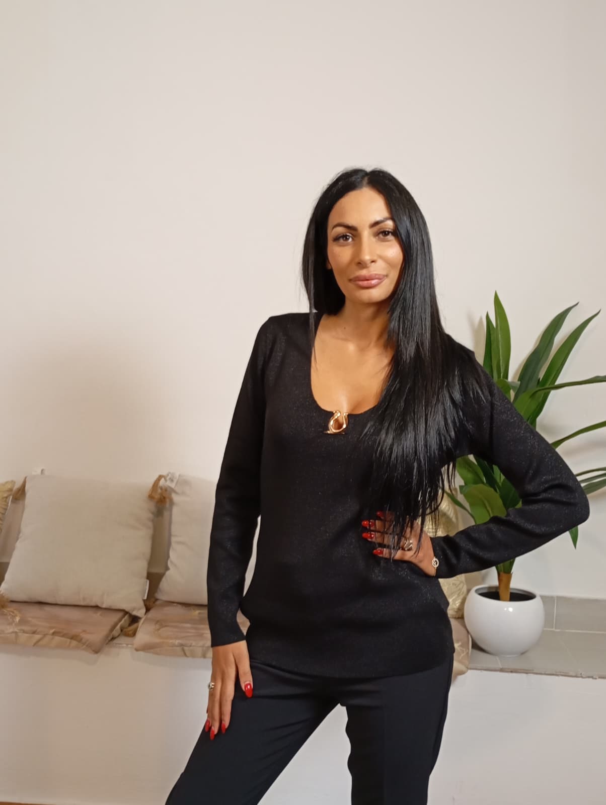 La maglia Maison Form Elle si distingue per il suo ampio scollo e l’elegante anello dorato centrale che ne caratterizza il design. L’intera superficie è decorata con brillantini, aggiungendo un tocco di luminosità raffinata. Realizzata in un mix di materiali di alta qualità: 50% viscosa, 20% poliammide, 20% poliestere e 10% lurex, offre comfort e un leggero effetto scintillante. La modella ritratta è alta 175 cm e pesa 54 kg.