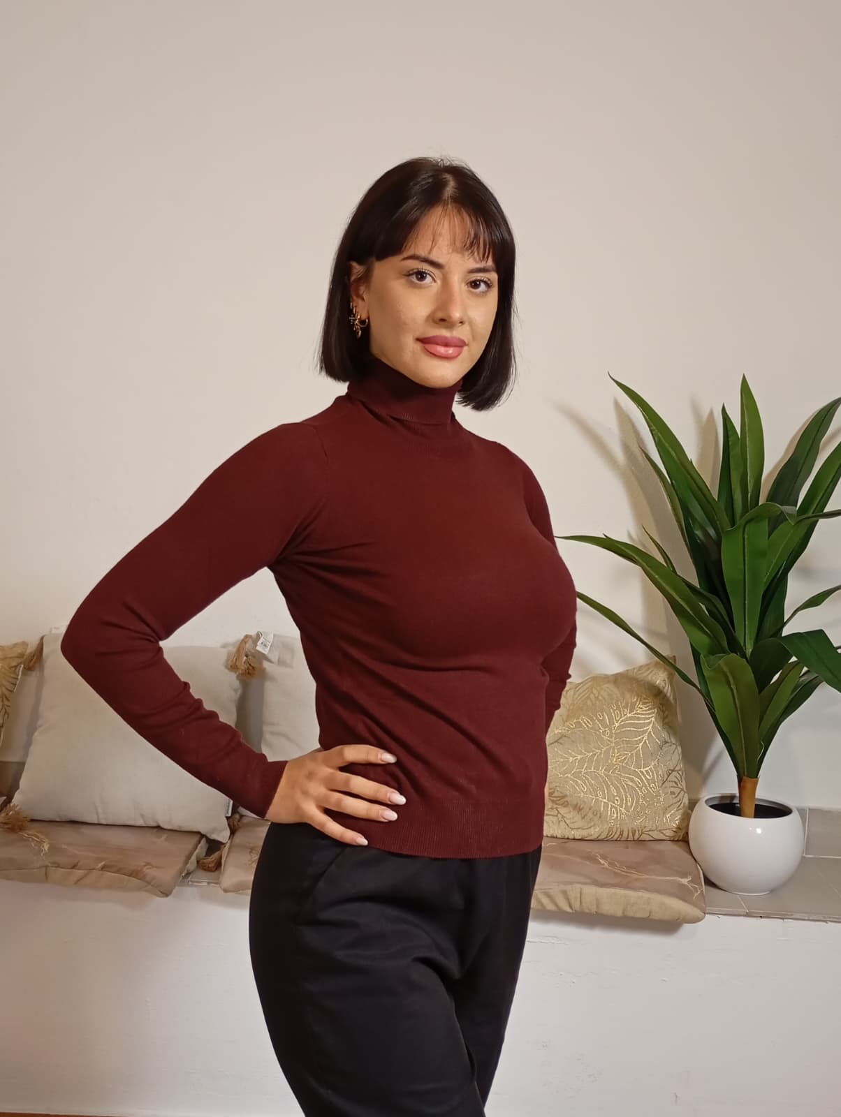 MAGLIA VITTORIA KEY. MAGLIA CLASSICA CON COLLO ALTO NEL COLORE BORDEAUX, CALDA E MORBIDA, PERFETTA PER L’INVERNO. LA MODELLA È ALTA 170 CM E PESA 62 KG.