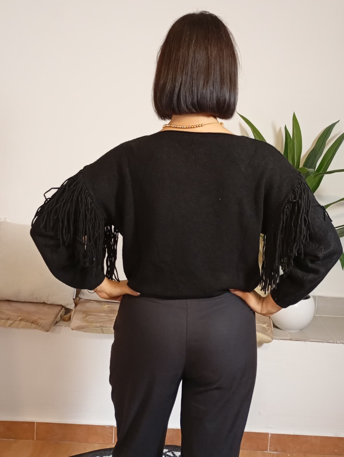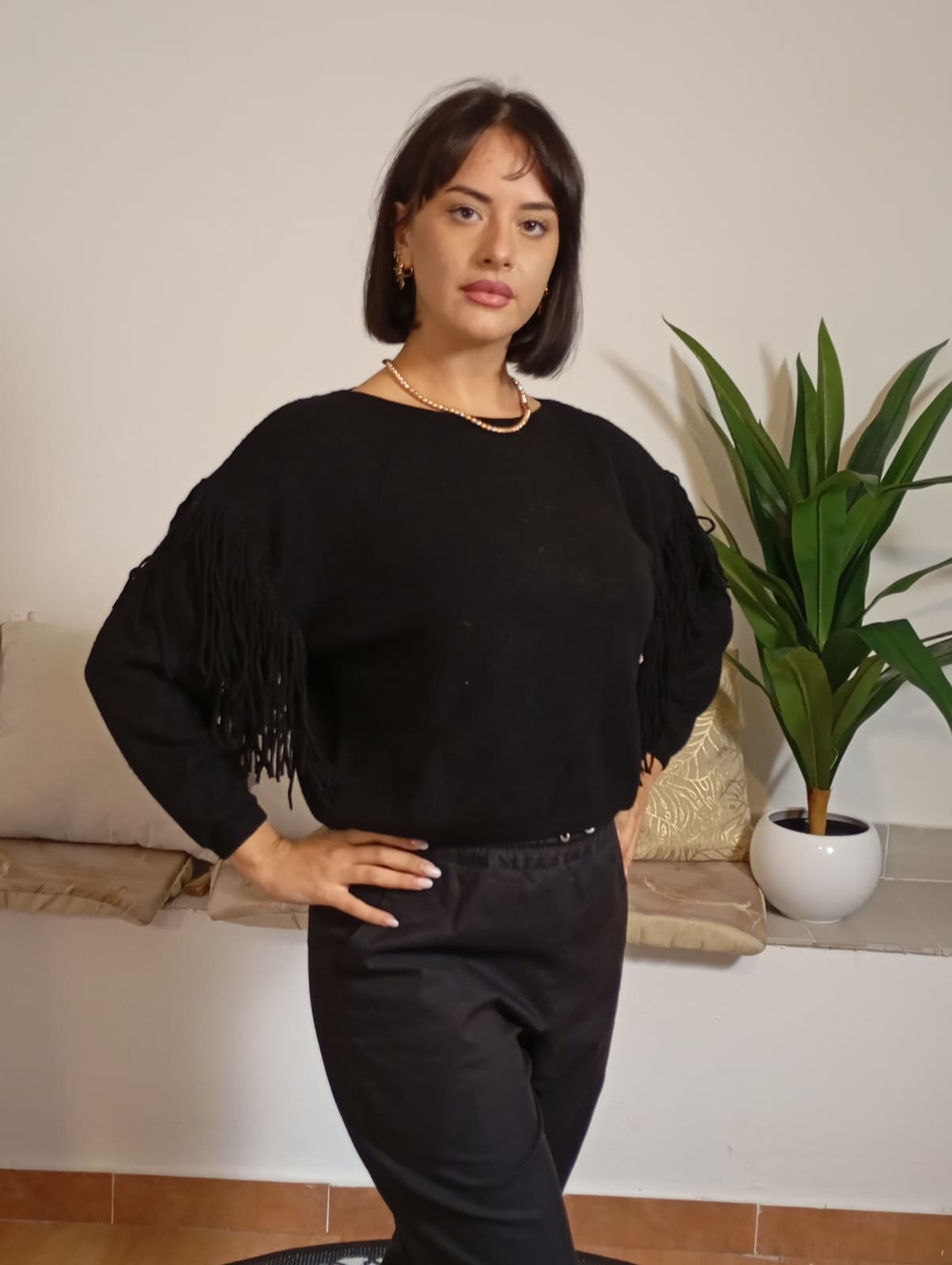 MAGLIA VITTORIA KEY. Maglia nera dalla consistenza morbida, caratterizzata da un dettaglio unico di frange sulle maniche. La modella che la indossa è alta 170 cm e pesa 62 kg.