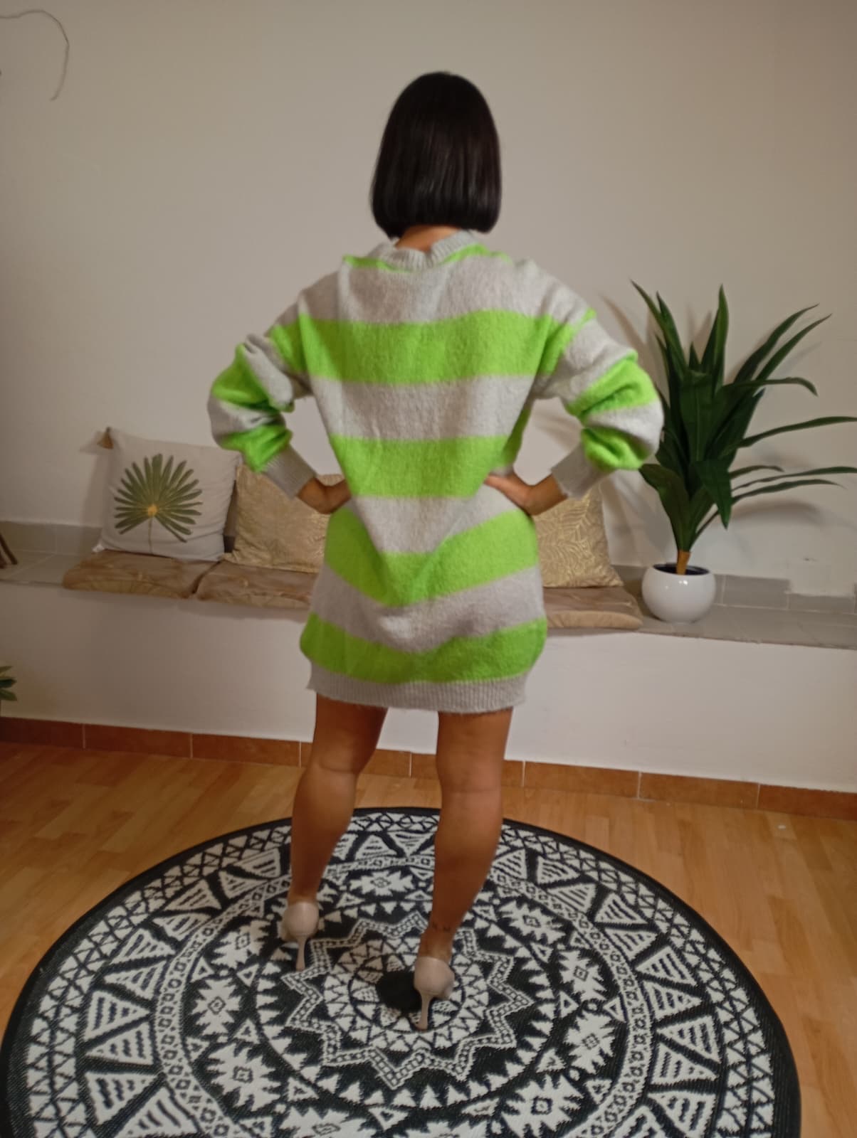 Vicolo ha creato un maxipull di grande qualità, con un tessuto particolarmente morbido al tatto. L’accostamento di questi due colori è distintivo e versatile, abbinabile facilmente a diversi look. Questo capo si adatta perfettamente sia a collant che a leggings. La modella, alta 170 cm e con un peso di 62 kg, indossa una taglia unica.
