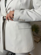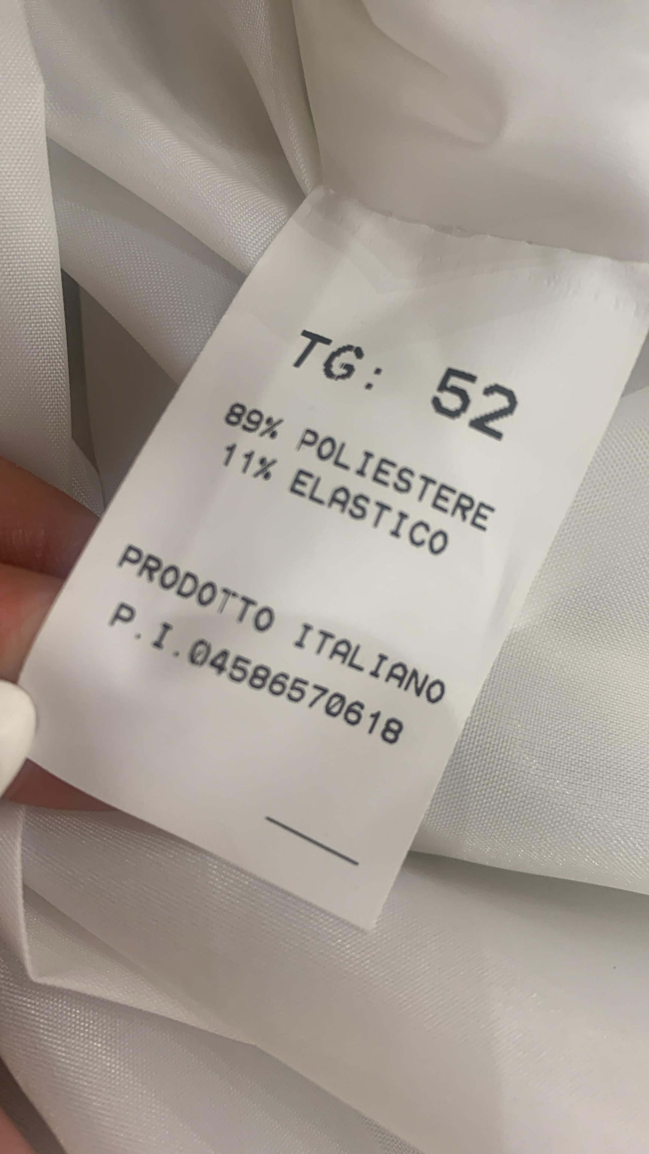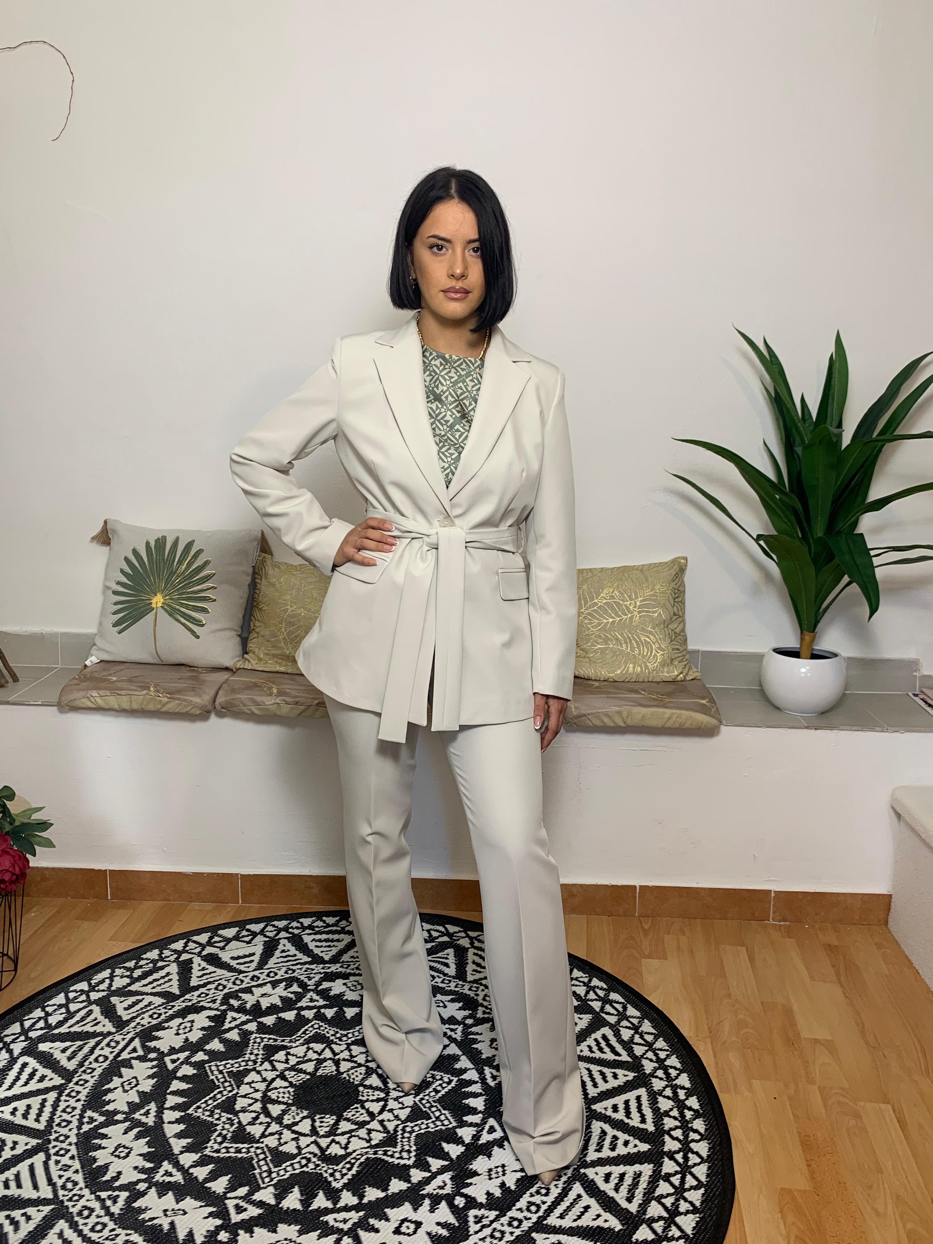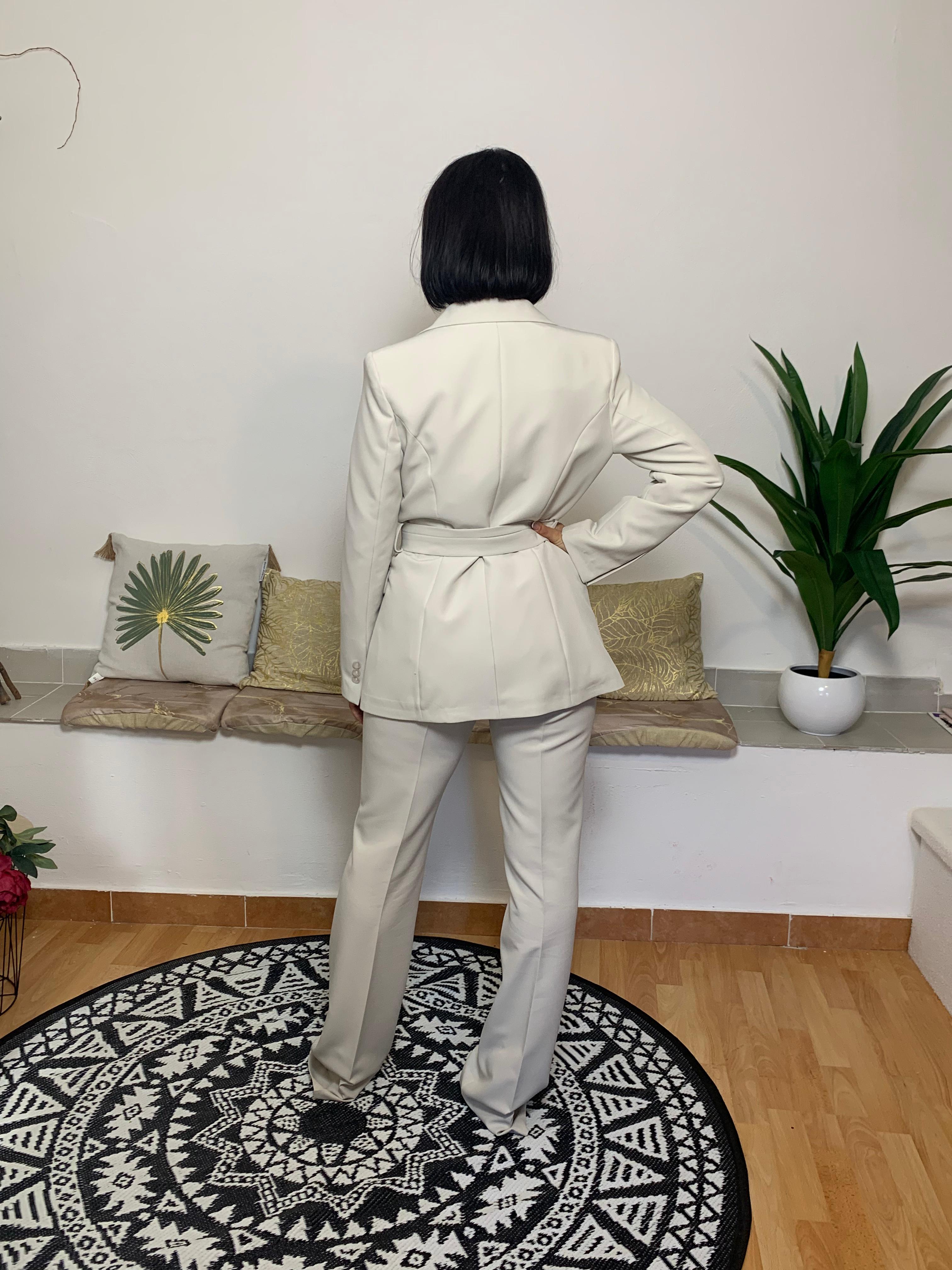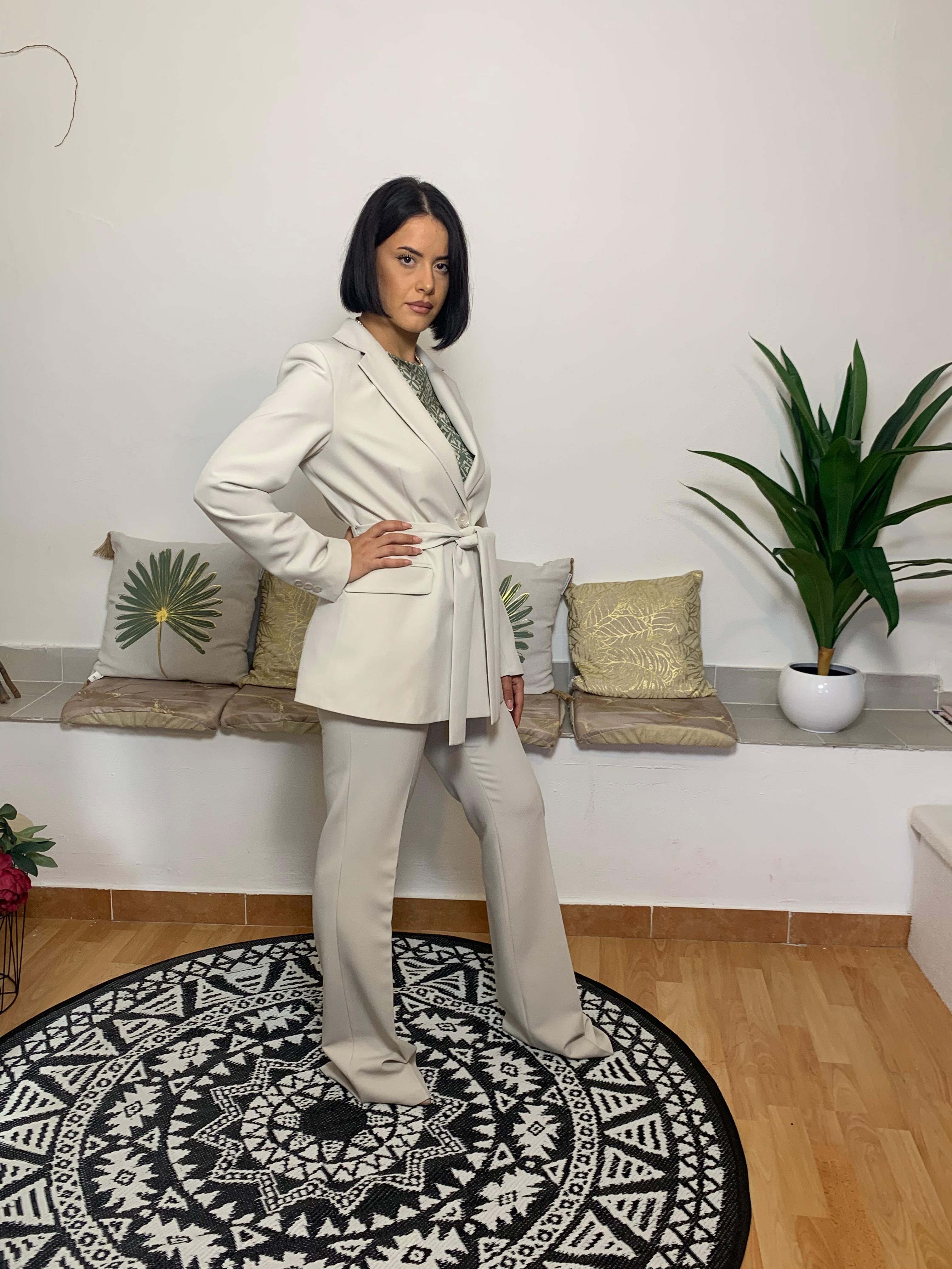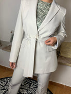 ALESSIA D'ERRICO COUTURE propone un tailleur di grande versatilità, apprezzabile sia nella linea che nel tessuto. La giacca si caratterizza per un unico grande bottone e una cintura sottile, mentre il pantalone presenta una leggera svasatura. La modella, alta 170 cm e dal peso di 62 kg, indossa una taglia 48. Composizione: 89% poliestere, 11% elastan.