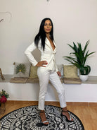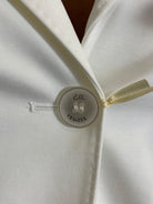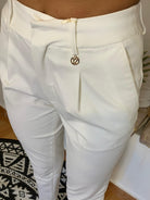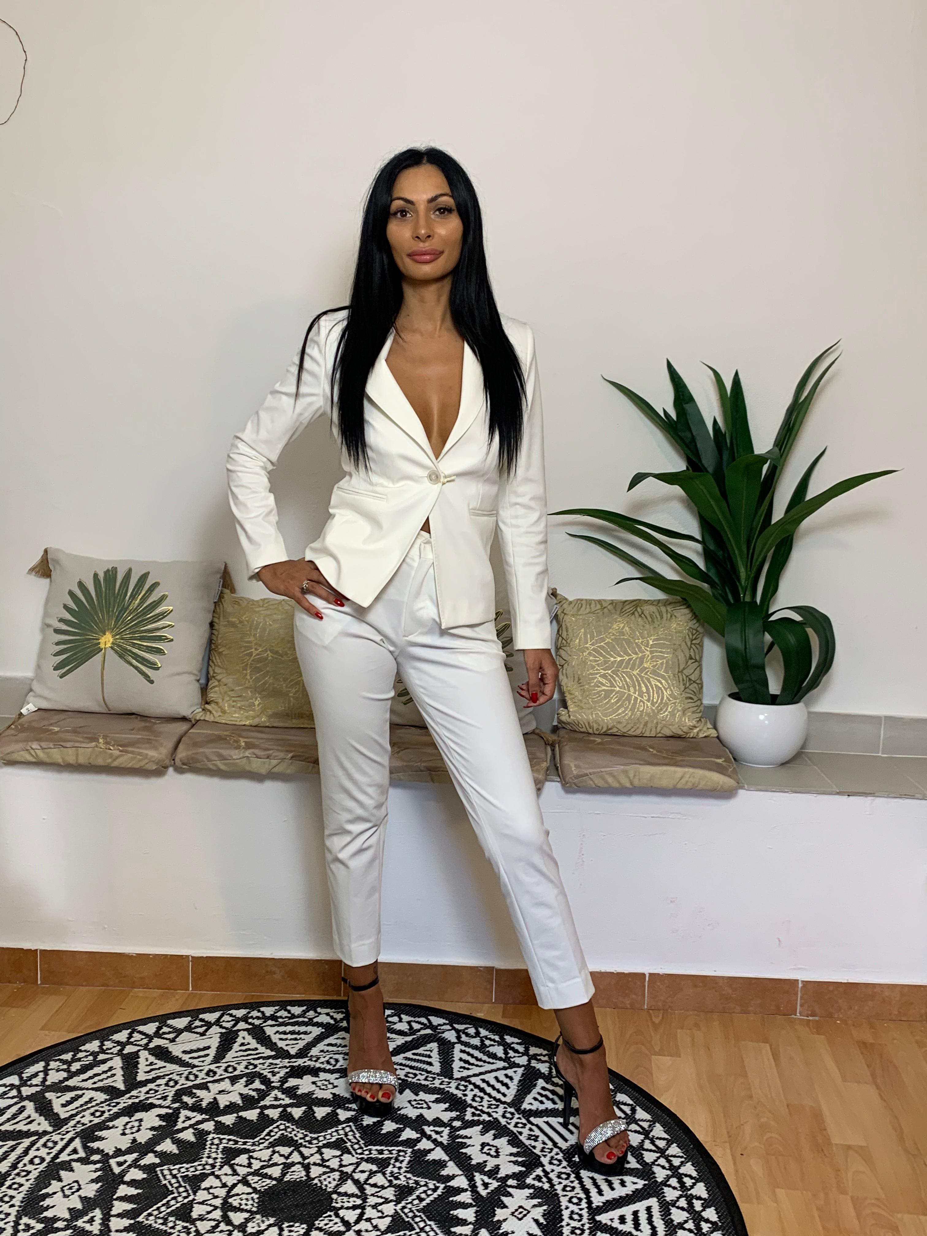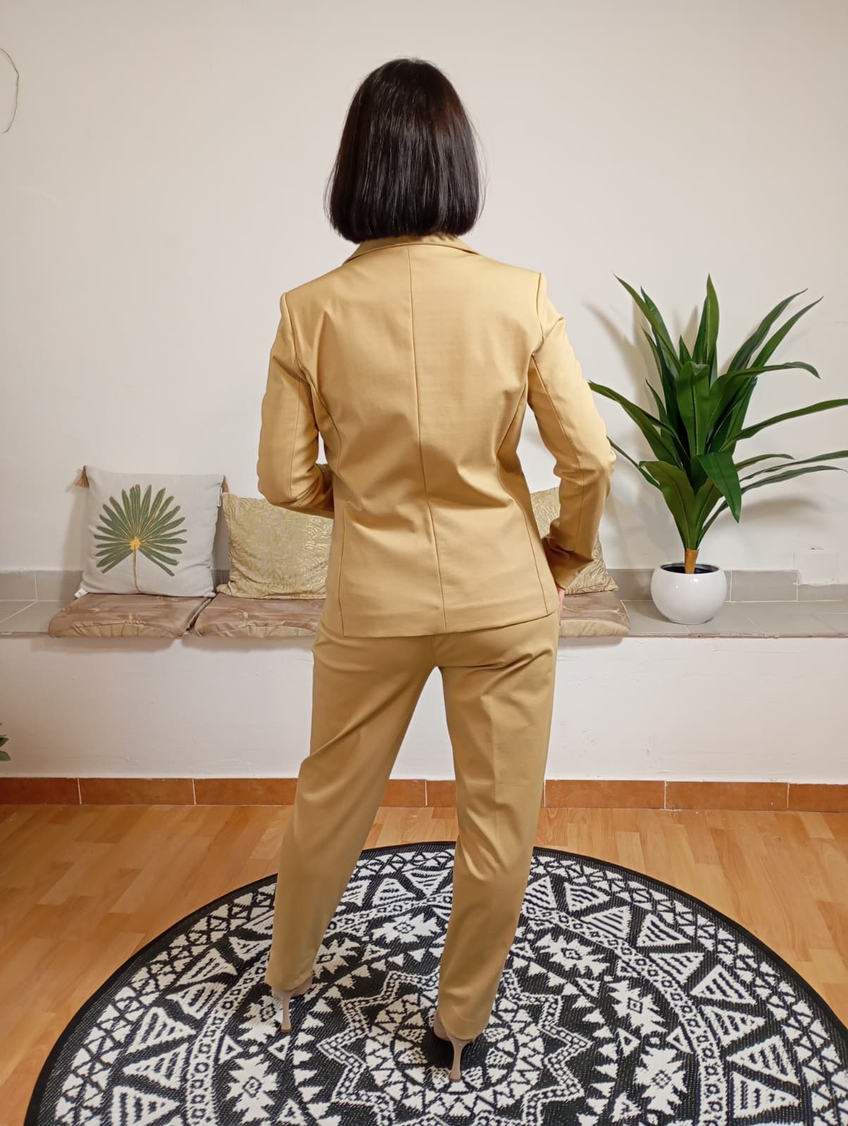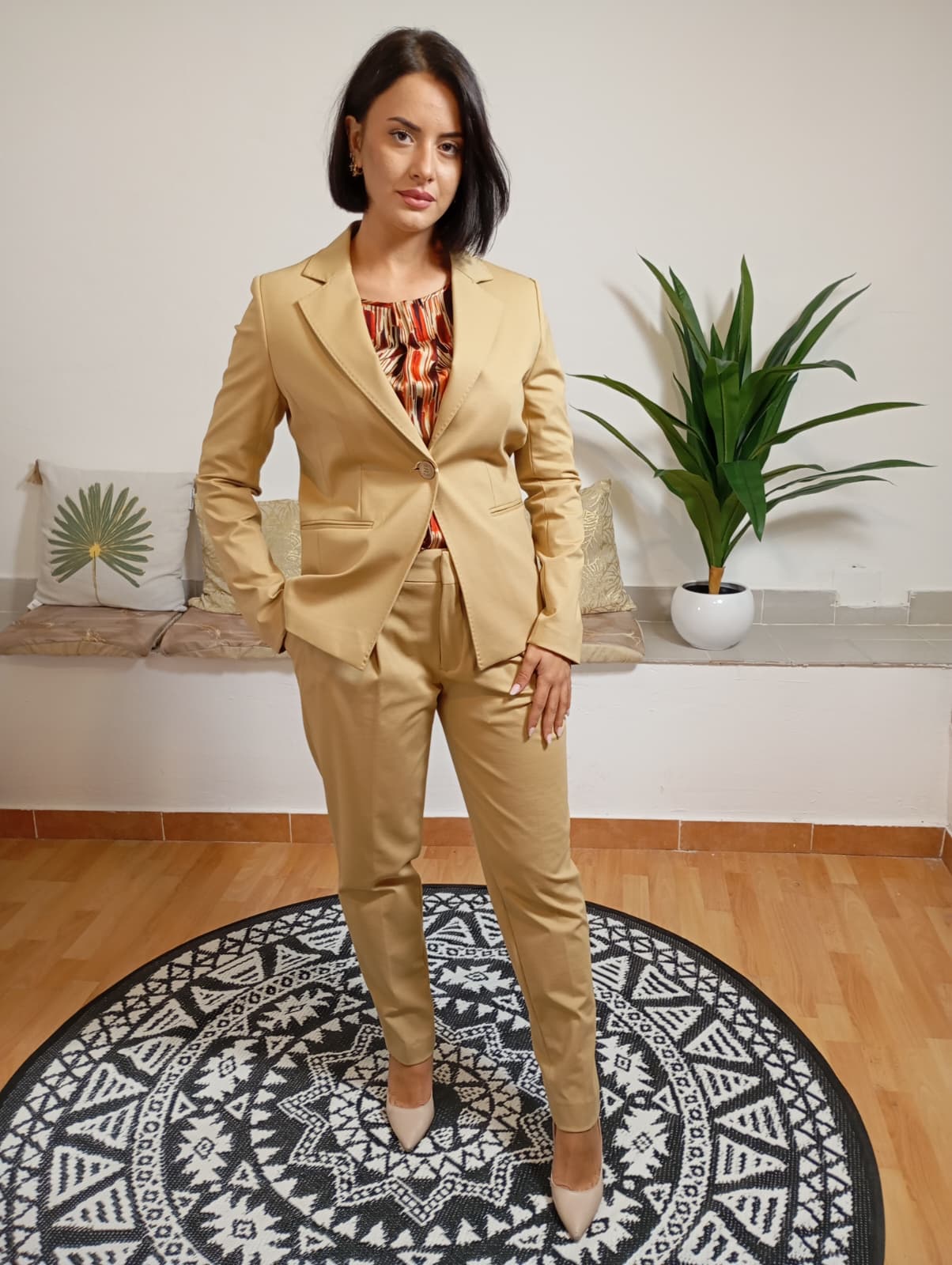 YES ZEE propone un tailleur essenziale formato da una giacca slim monopetto e pantaloni sigaretta con pinces, impreziositi da un ciondolo con logo posizionato vicino al passante. La modella nel colore bianco è alta 175 cm, pesa 54 kg e indossa una taglia XS, mentre quella nel beige è alta 170 cm, pesa 62 kg e porta una taglia L. Composizione: 48% nylon, 45% cotone, 7% elastan.