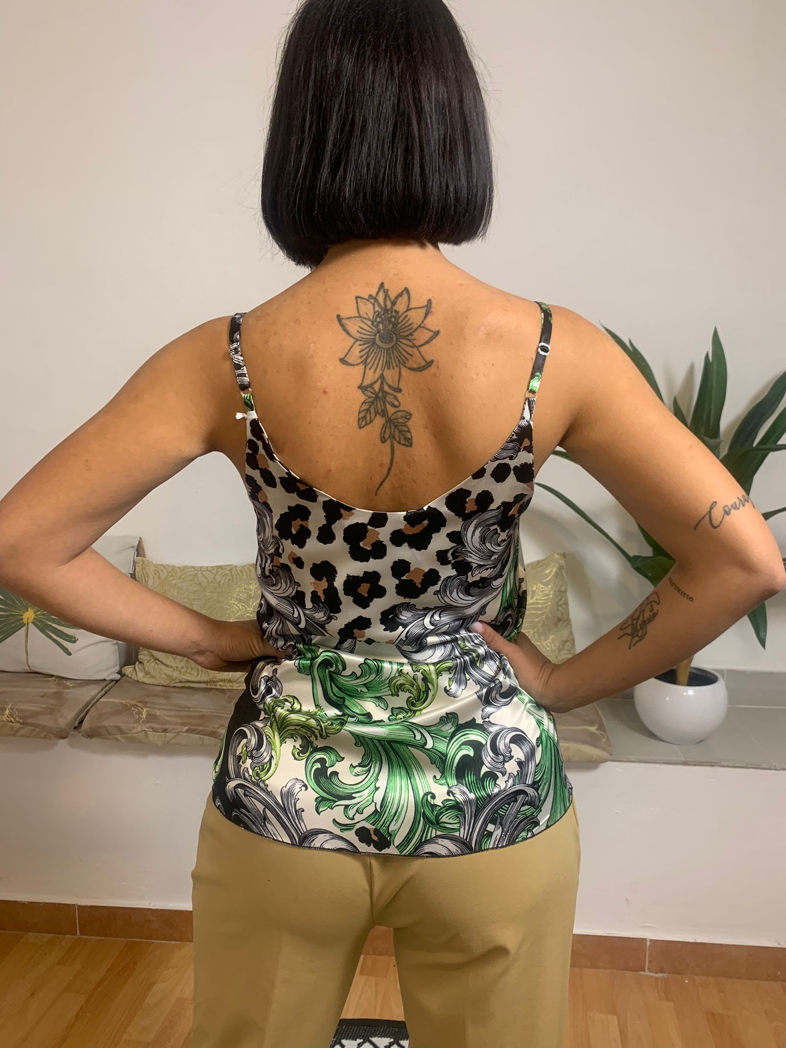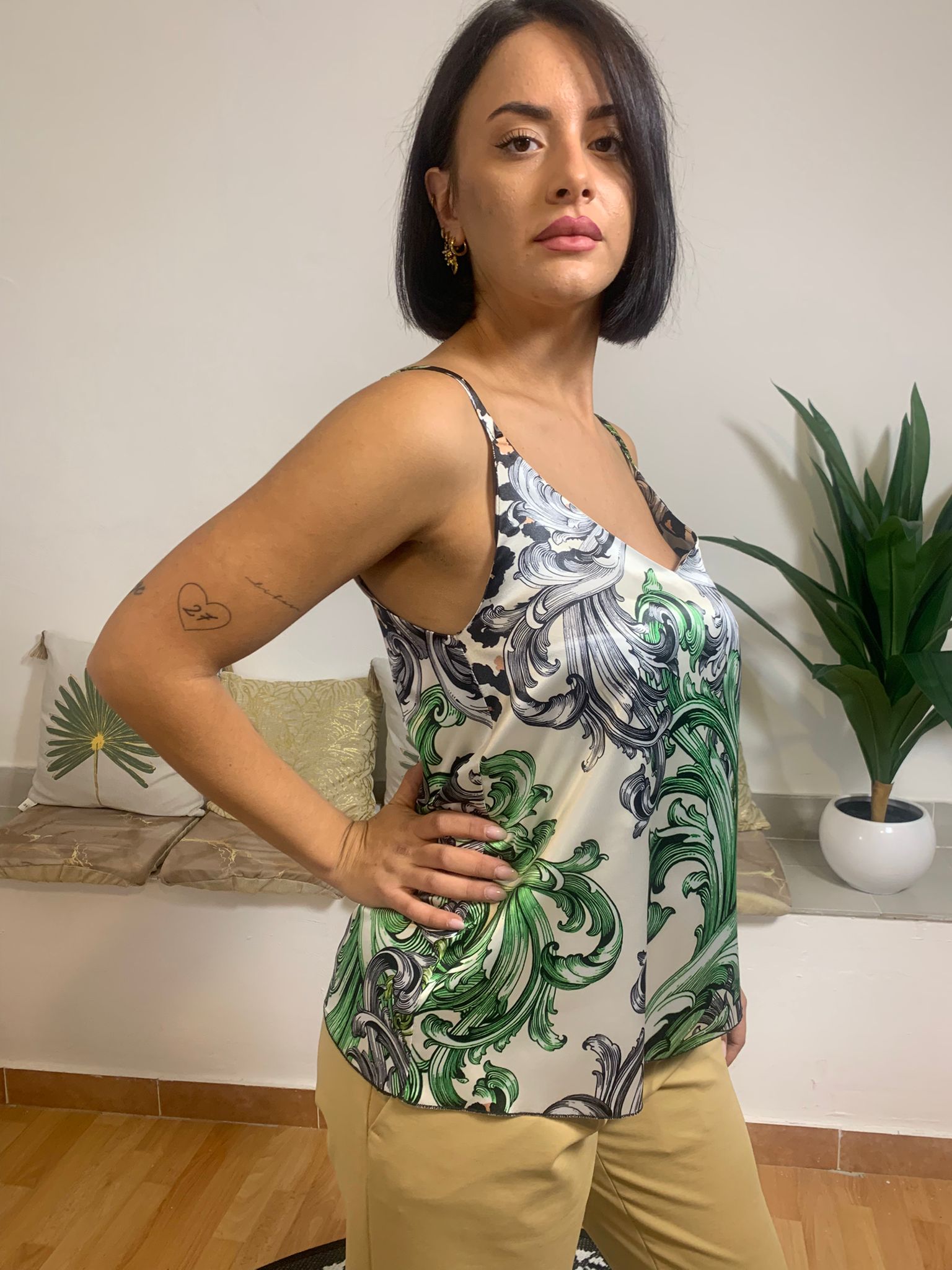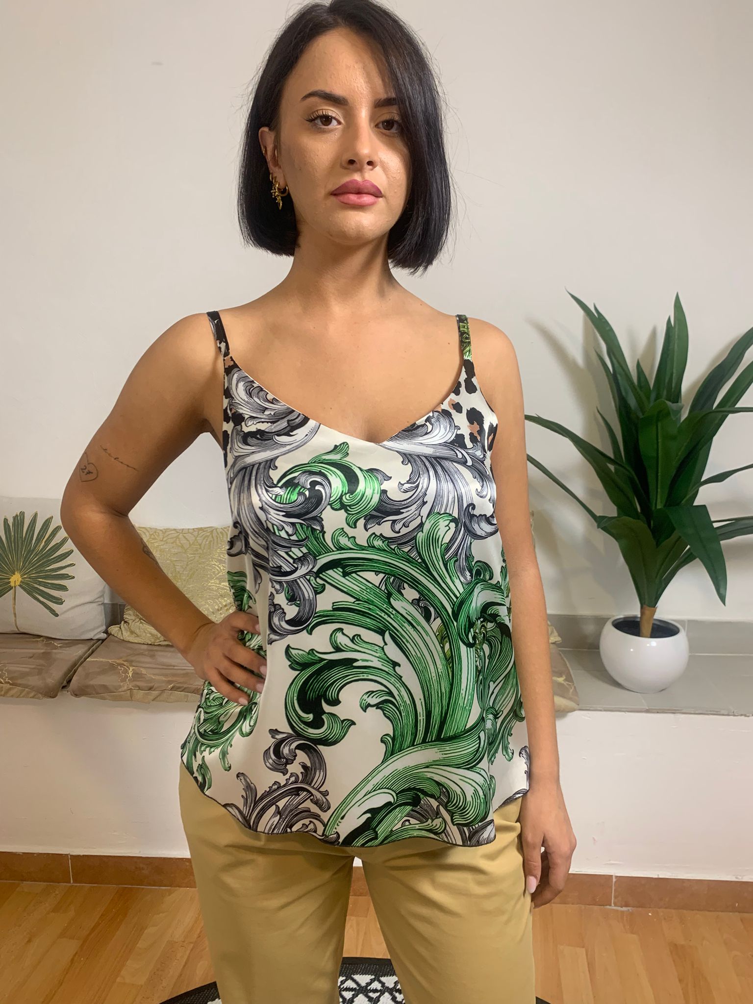 PRENIU' crea questo top in tessuto satinato con una fantasia classica e colori versatili, facilmente abbinabili a qualsiasi tonalità. Dotato di spalline regolabili e di una linea morbida, garantisce comfort e stile. La modella alta 170 cm e dal peso di 62 kg indossa una taglia 42. Realizzato interamente in poliestere.