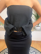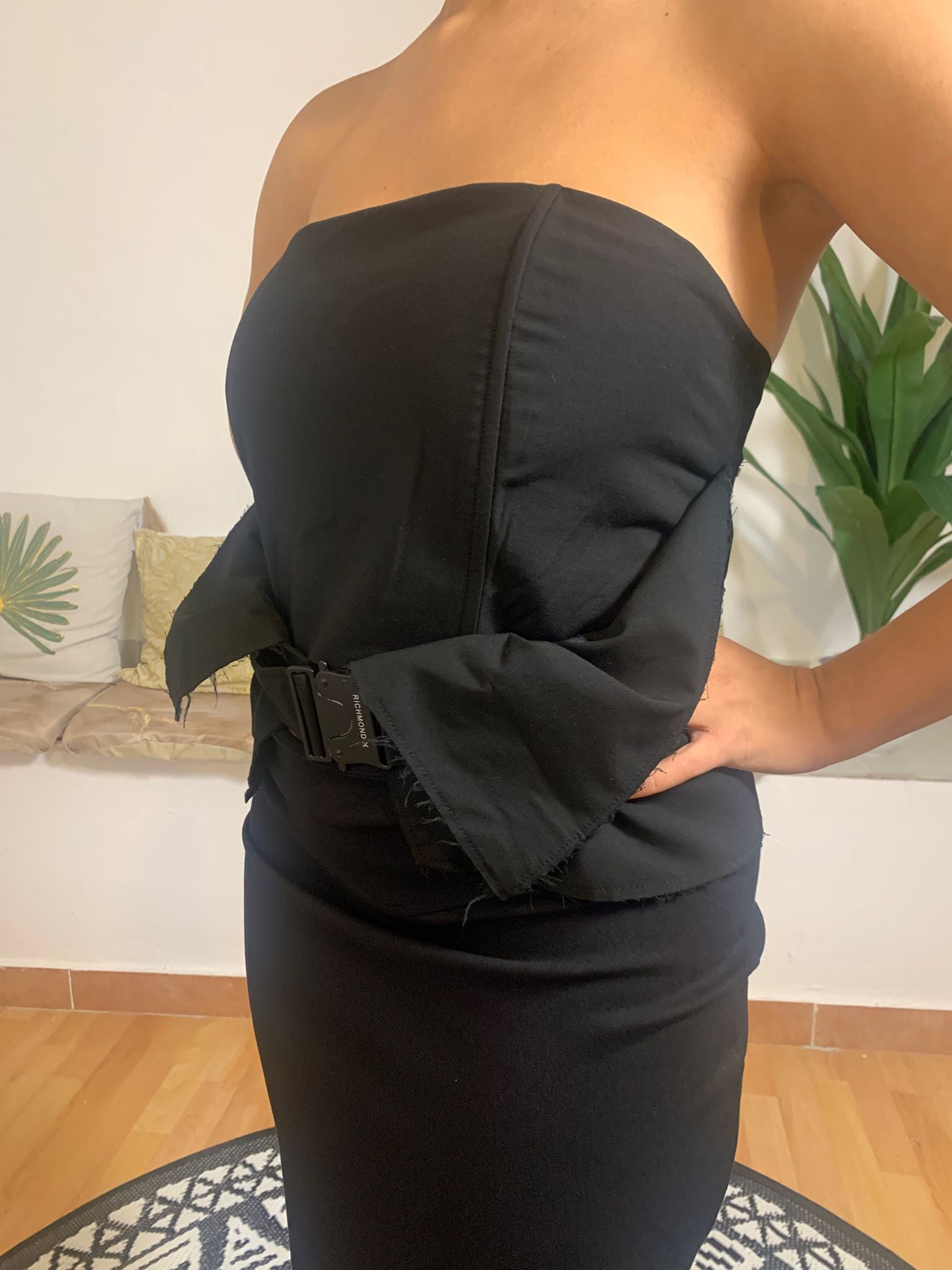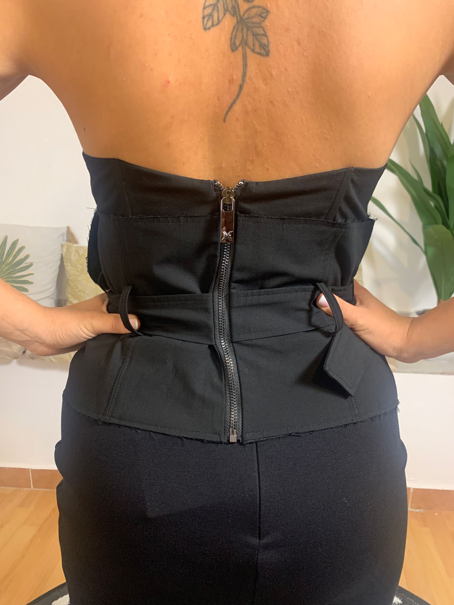 Top Richmond nero con design distintivo, caratterizzato da cintura e zip posteriore. Realizzato al 100% in viscosa. La modella indossa una taglia adatta a chi pesa 62 kg e misura 170 cm di altezza.
