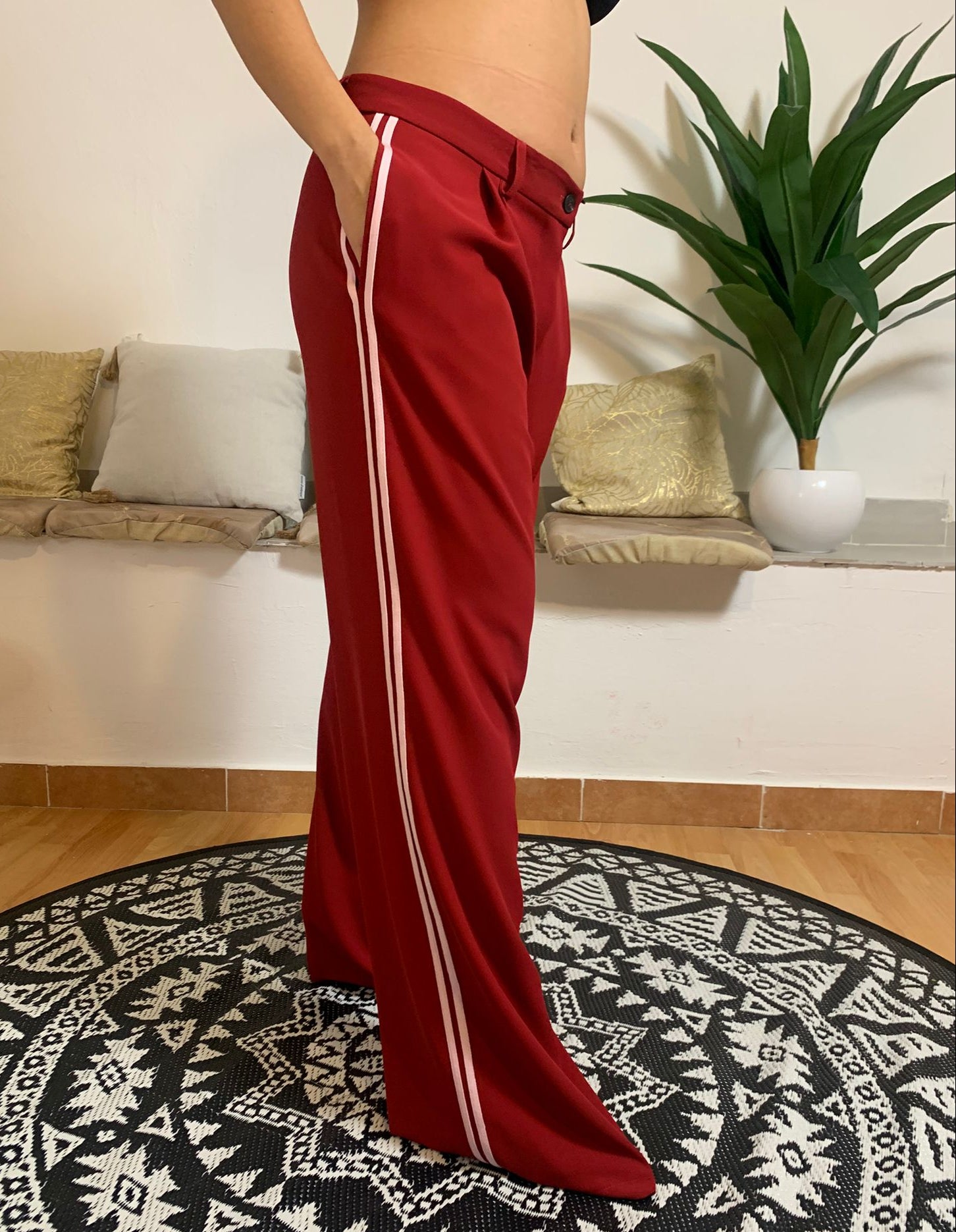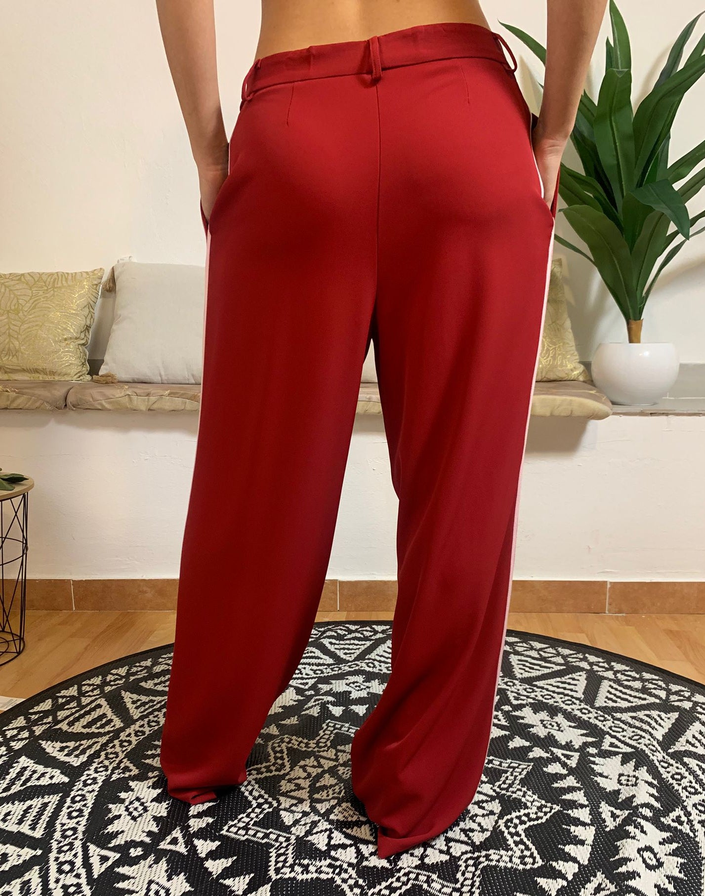 Pantalone dalla silhouette contemporanea che unisce eleganza classica e dettagli sportivi. Realizzato in tessuto fluido e leggero, presenta due bande laterali che caratterizzano il design con un tocco dinamico. Tasche frontali e chiusura con zip e bottone completano la struttura. Composizione: 96% poliestere, 4% elastan. La modella di 170 cm e 62 kg indossa la taglia 46.