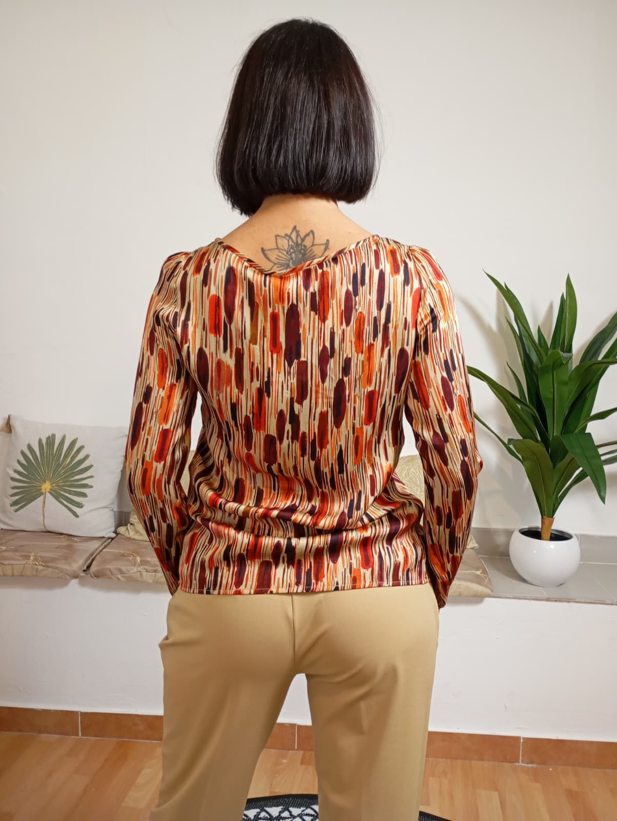 Caractere offre una blusa raffinata in tessuto morbido, con un delicato pieghettato che parte dallo scollo rotondo. La fantasia stampata le conferisce eleganza e la rende versatile per diverse occasioni. Il modello, alto 170 cm e dal peso di 62 kg, indossa una taglia 40.
