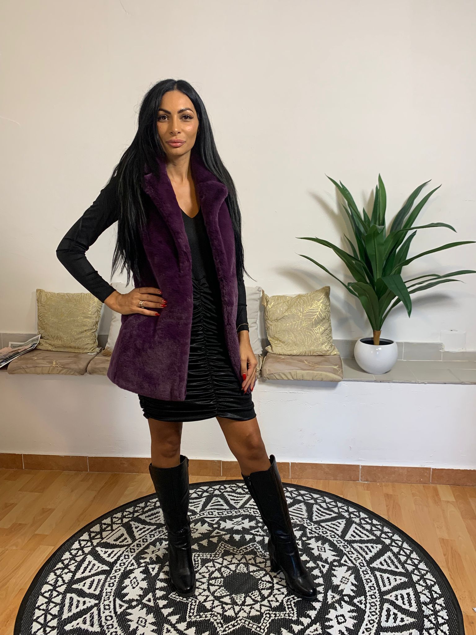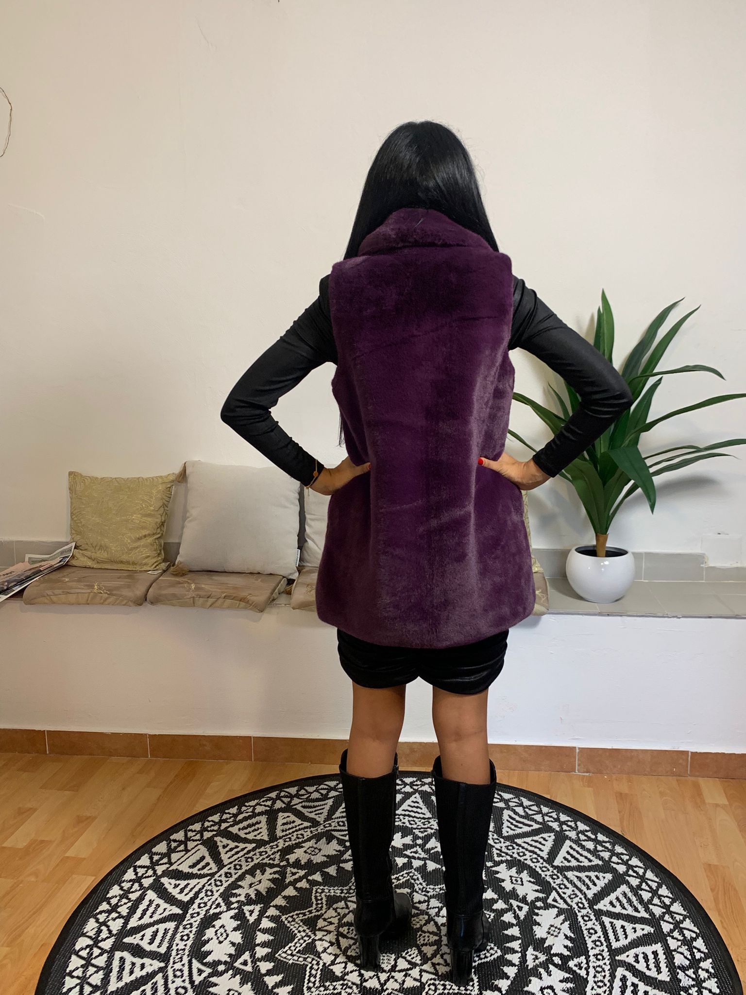 Cappotto smanicato in similpelle viola firmato Sun68, realizzato al 100% in poliestere. Il capo presenta un colletto doppio e un tessuto soffice e caldo, che garantisce comfort durante le stagioni più fresche. La giacca arriva sopra le ginocchia; il modello che la indossa pesa 54 kg ed è alto 175 cm.