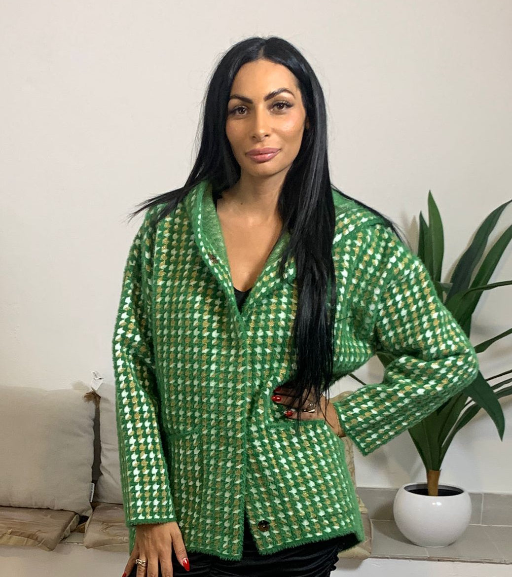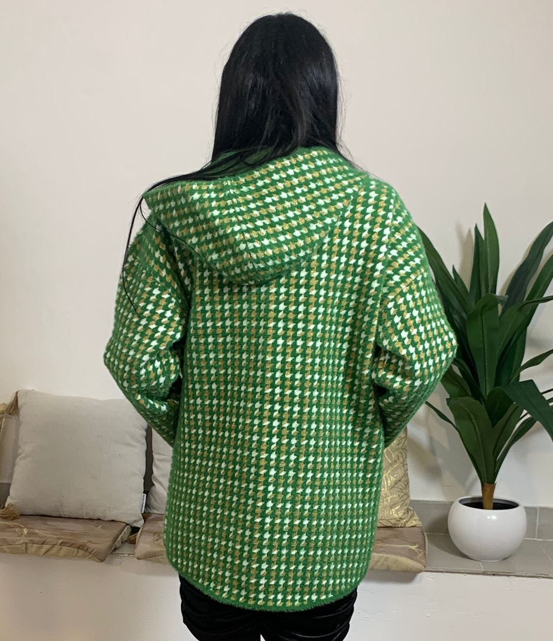 PEGGY HO. propone un giubbino in maglia con una raffinata fantasia a quadretti spezzati, che richiama il motivo pied de poule. Ideale per chi cerca un capo confortevole, caldo e funzionale, il giubbino presenta un cappuccio pratico, due tasche anteriori e una chiusura con bottoni a pressione. La modella indossa una taglia S ed è alta 175 cm con un peso di 54 kg. La composizione del tessuto è 70% nylon, 20% poliestere e 10% fibra metallica, per un mix di resistenza e stile contemporaneo.