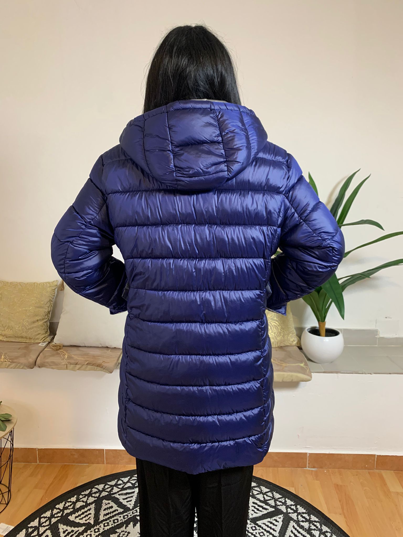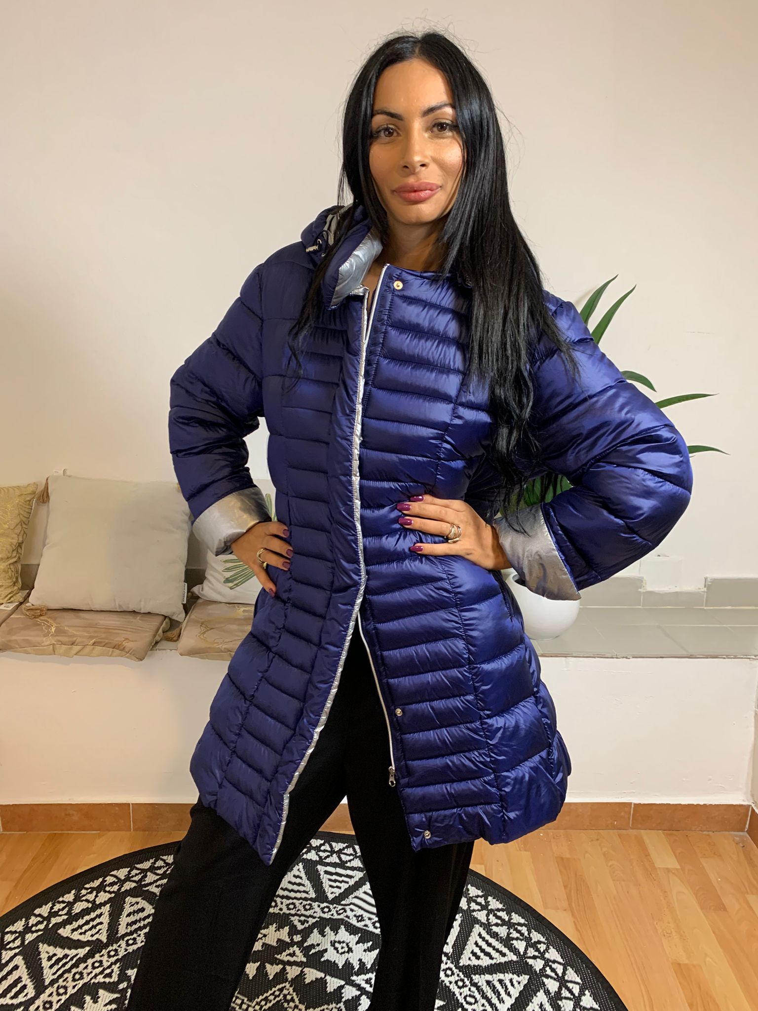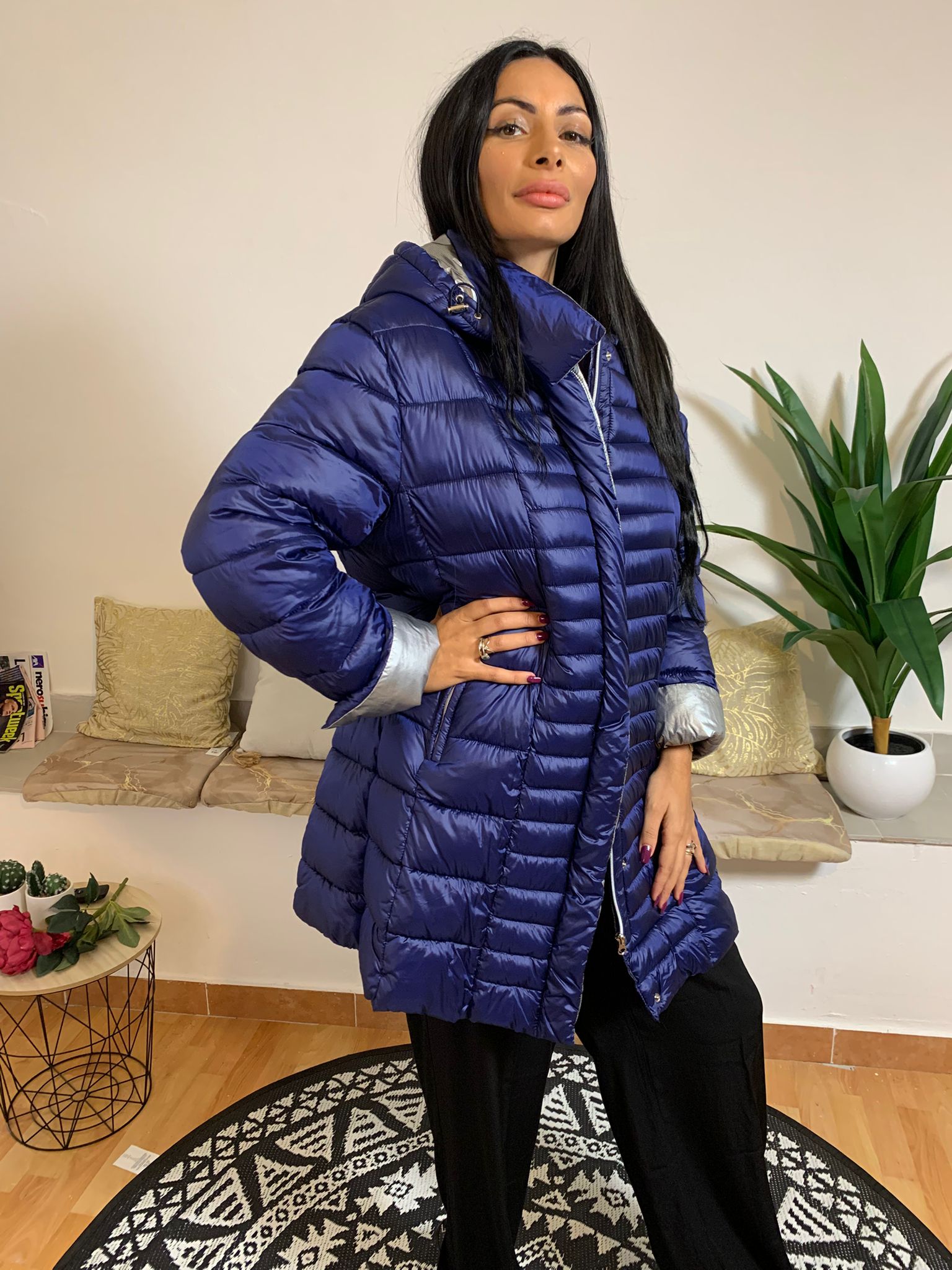 Giubbino TOY G in poliestere 100%, caratterizzato da una finitura blu metallizzato con interno argento. Dotato di chiusura a bottone sul collo e cerniera centrale, offre praticità e versatilità. Tasche funzionali e capuccio sagomabile completano il design. La modella nella foto indossa la taglia 51, è alta 175 cm e pesa 54 kg.