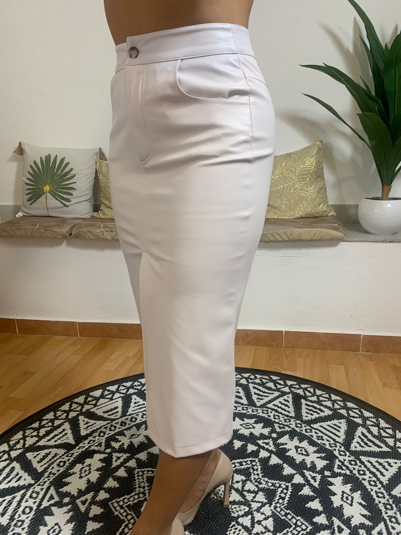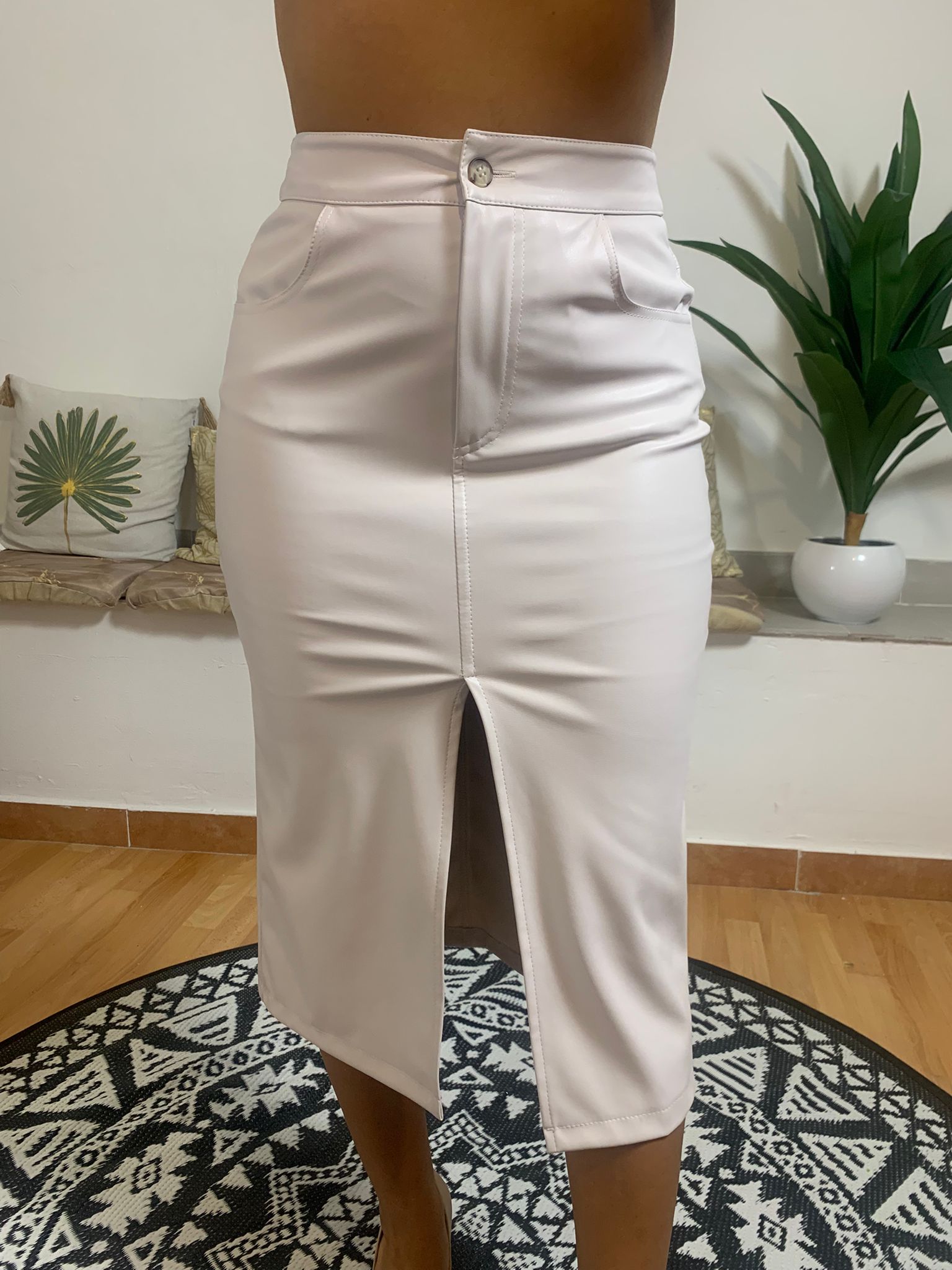 GONNA VICOLO SIMILPELLE. Gonna bianca con spacco frontale, caratterizzata da un design semplice ed elegante. Realizzata in un mix di materiali: 50% poliestere, 50% poliuretanica, 60% acetato e 40% viscosa. La modella indossa una taglia adatta alla sua altezza di 170 cm e peso di 62 kg.