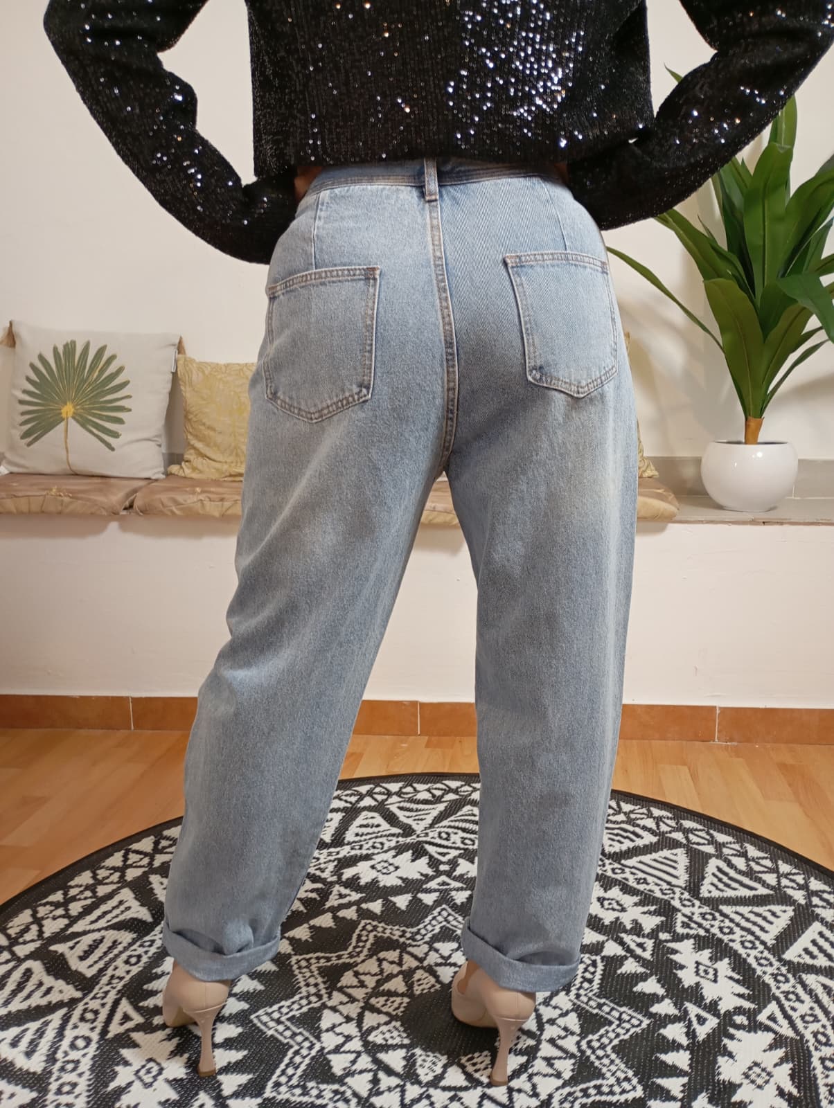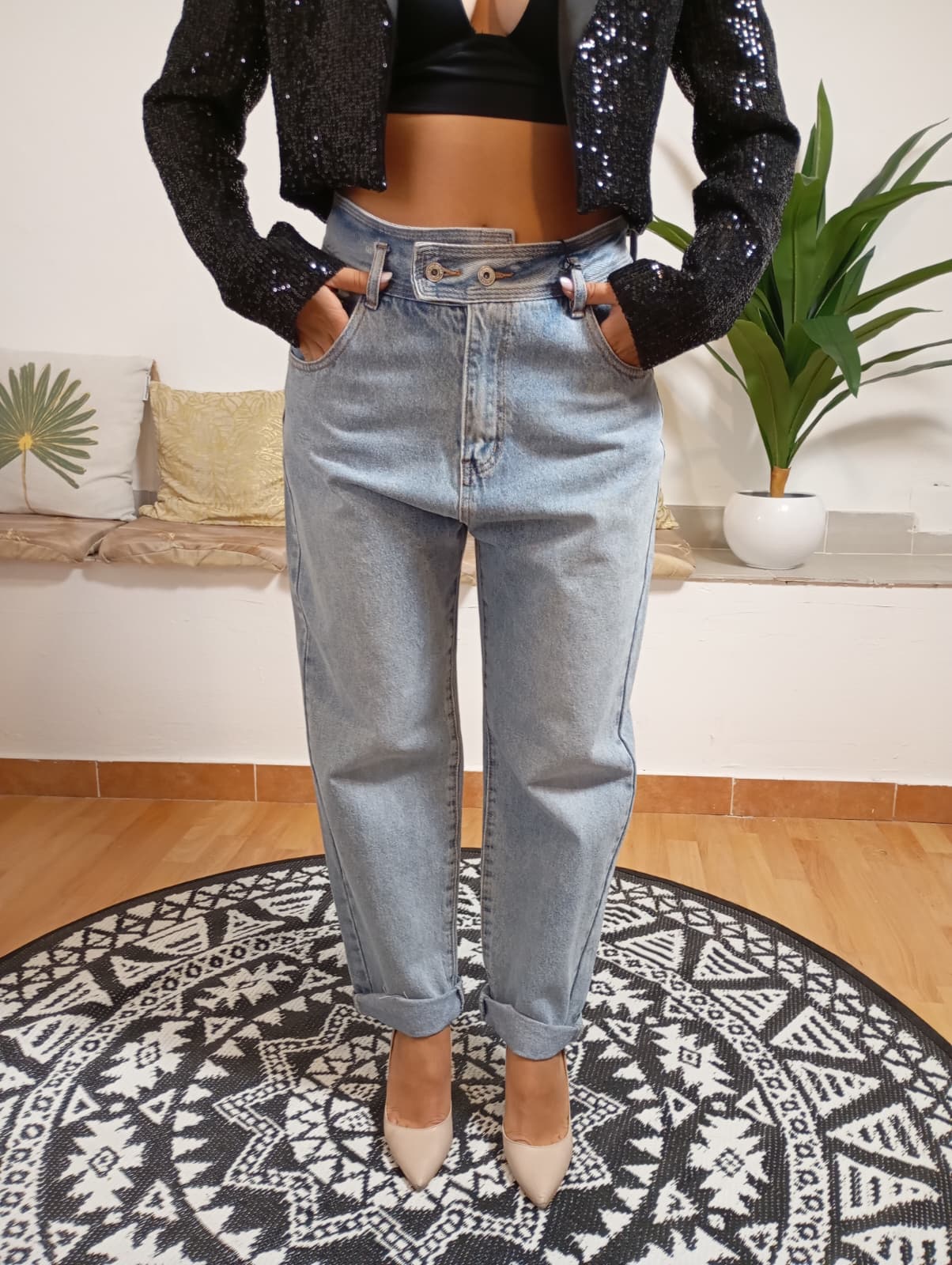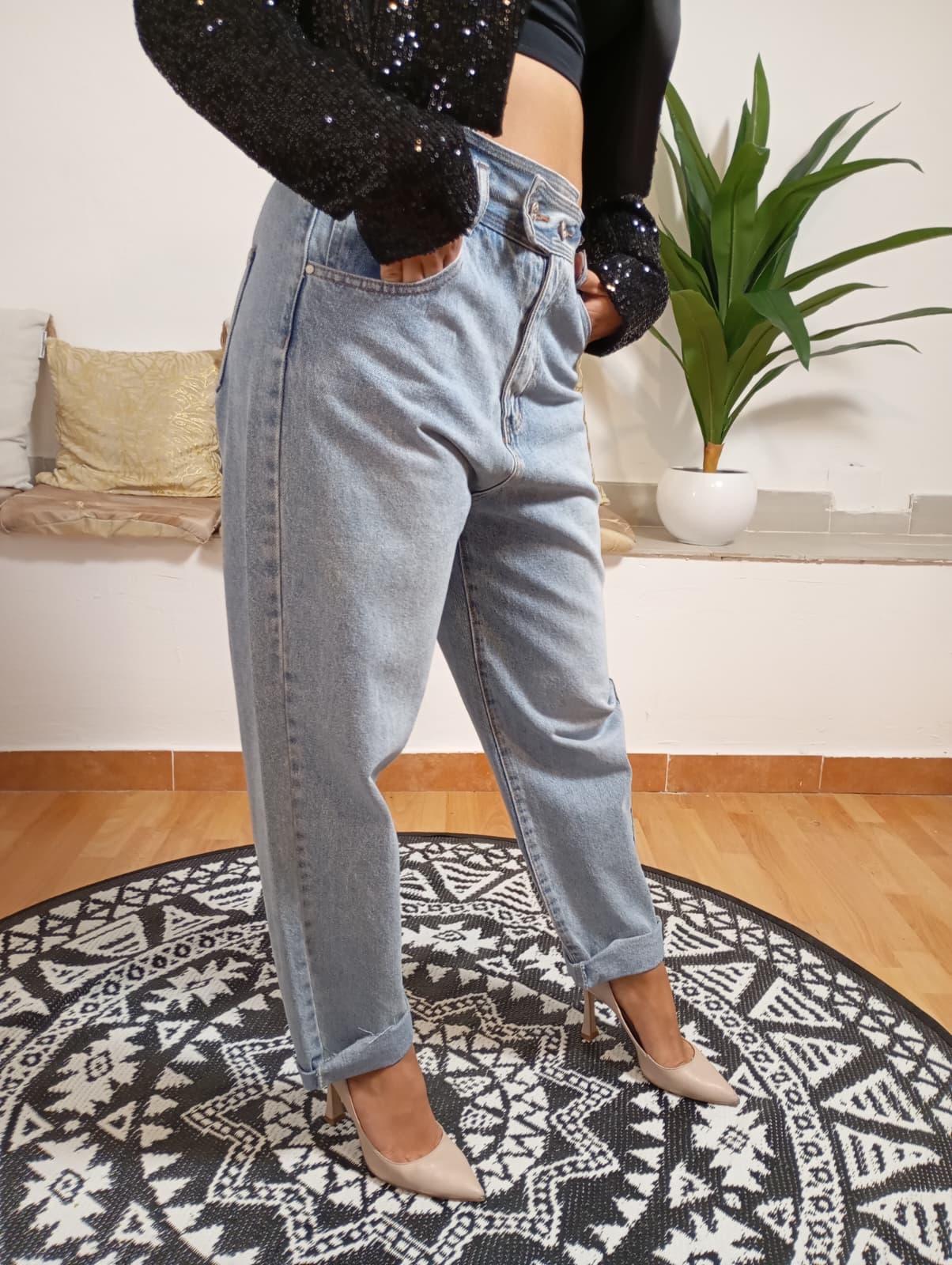 Jeans modello Mom marchio INFLUENCER, dalla vestibilità morbida e design unico, con chiusura a bottone distintiva. Il lavaggio chiaro garantisce un'ampia versatilità e facilità di abbinamento. La modella, alta 170 cm e di 62 kg, indossa una taglia 48. Composizione: 97% cotone, 3% poliestere.