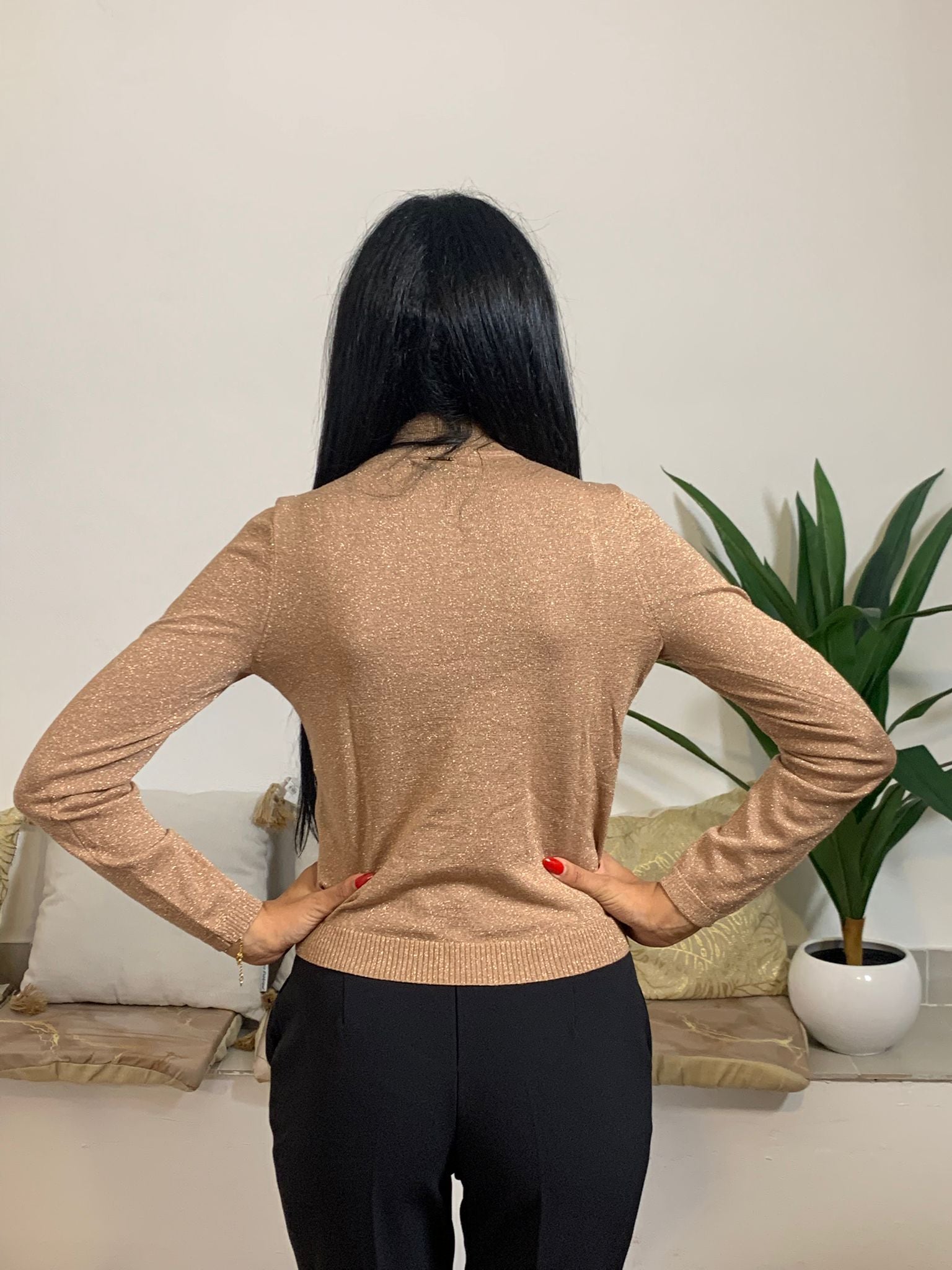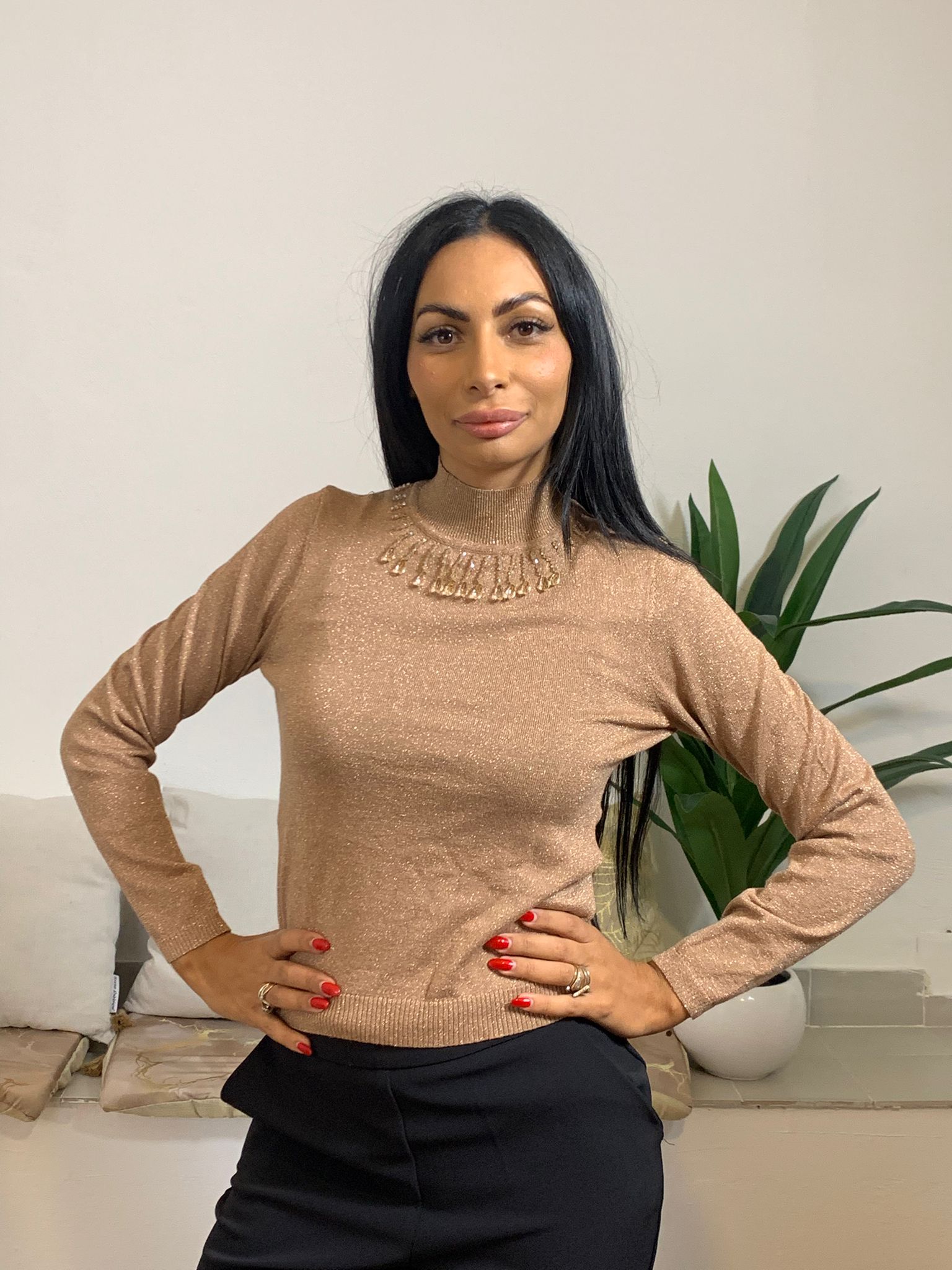 La maglia influencer si distingue per l’intera superficie ricoperta di brillantini, che aggiungono un tocco luminoso ed elegante. Presenta un collo alto e maniche lunghe, arricchita da una finta collana di brillantini più grandi e di forme diverse. Composta da 72% viscosa, 18% poliestere e 10% lurex, garantisce comfort e fascino. La modella in foto è alta 175 cm e pesa 54 kg.