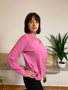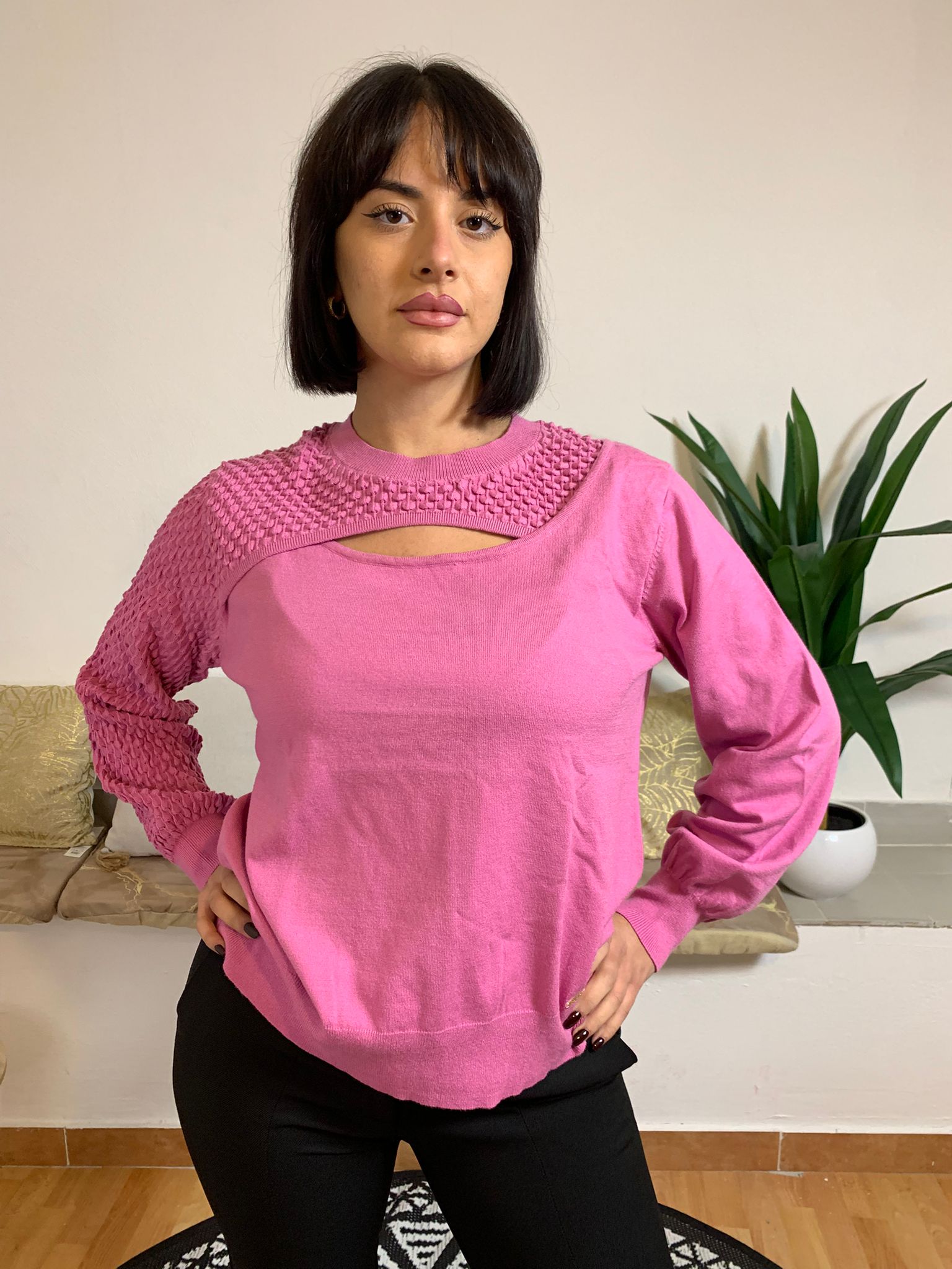 Maglia Influencer con scollo centrale divisorio che separa la parte superiore a effetto coprispalle dalla parte inferiore. La sezione superiore si distingue per dettagli grafici unici, mentre quella inferiore è caratterizzata da un design semplice arricchito da costine su girocollo, bordi delle maniche e orlo. Realizzata in 50% viscosa, 30% poliammide e 20% poliestere. Il capo è indossato da una modella alta 170 cm e dal peso di 62 kg
