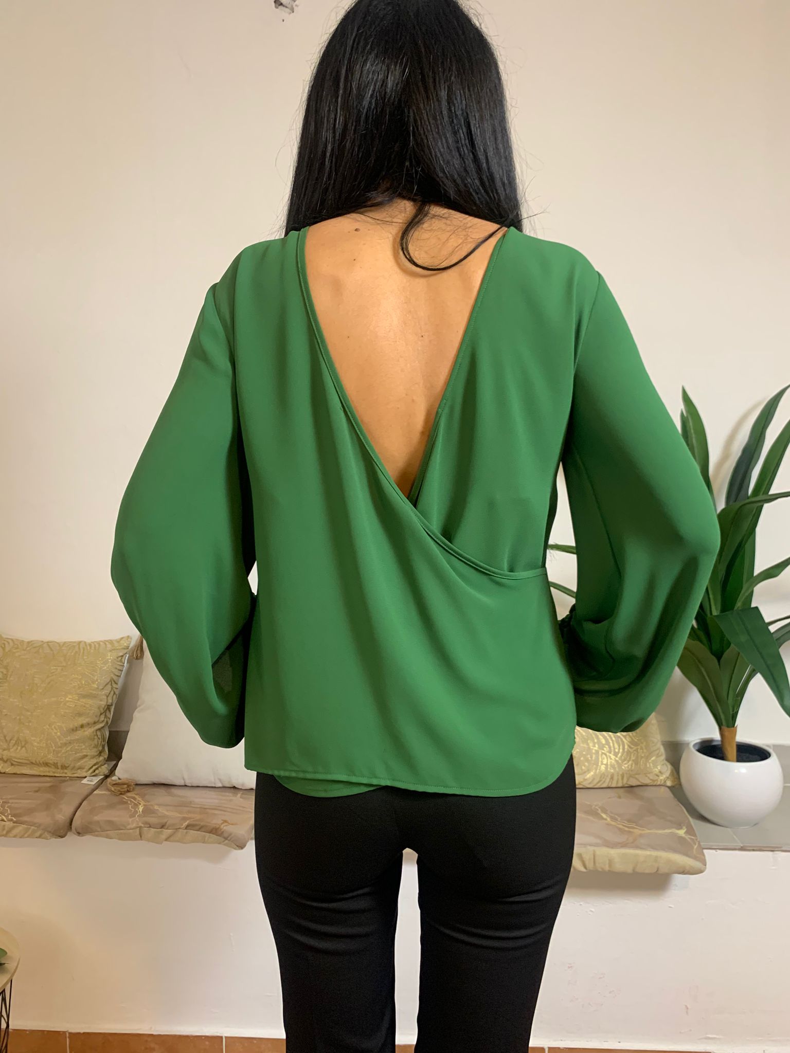 Elegante maglia in poliestere 100% che combina stile e comfort. Caratterizzata da maniche lunghe con dettaglio arriccio e uno scollo ampio che si apre sulla schiena, creando un'esilità sofisticata. La tonalità verde suoli conferisce un'eleganza naturale e versatile. Taglia 42. Indossata dalla modella di 175 cm e 54 kg per una visione accurata della vestibilità.