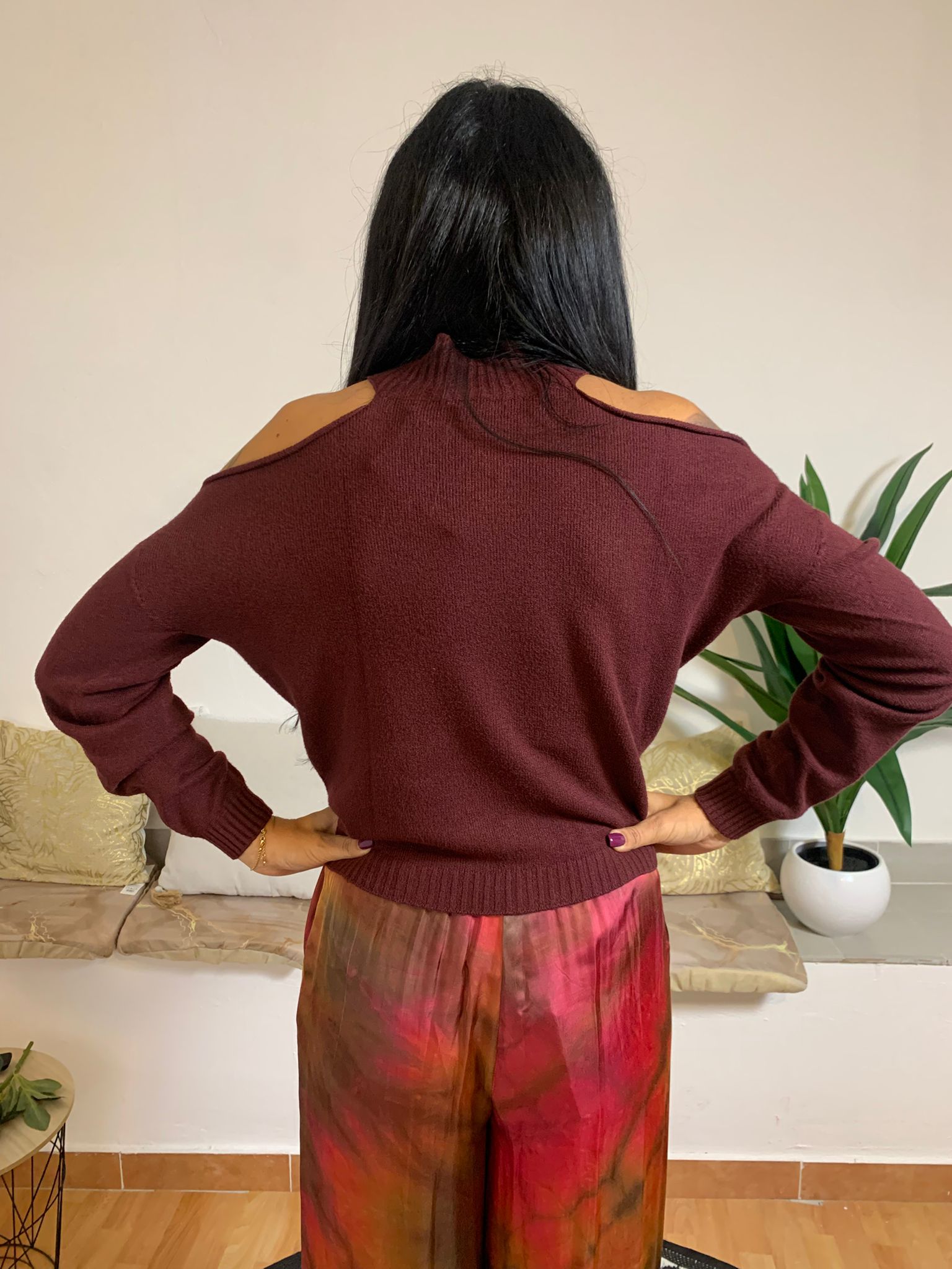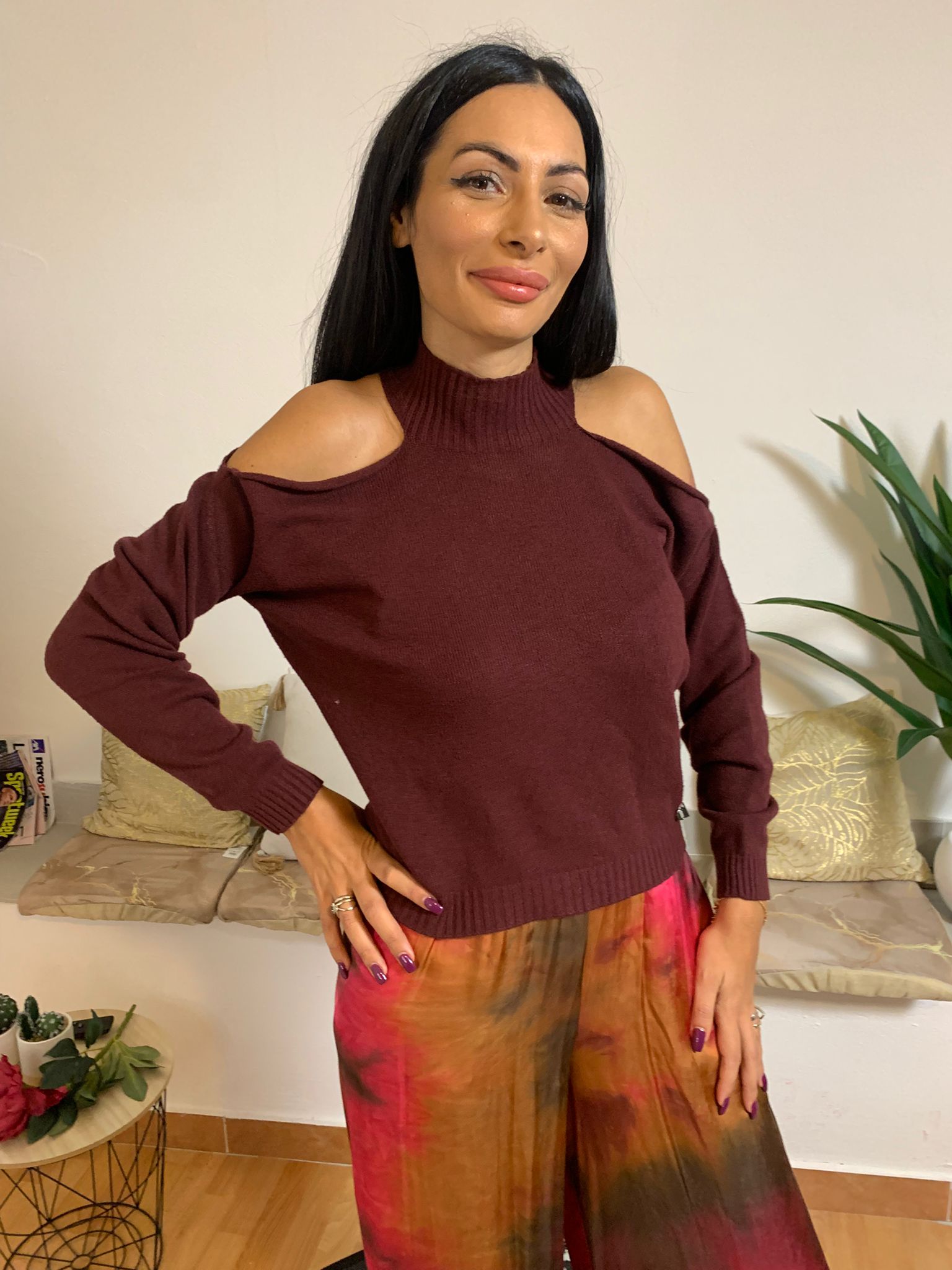 La maglia Vittoria Key è un capo nero realizzato in tessuto morbido, caratterizzato da un'apertura laterale sulle spalle e da un colletto di altezza media. Il modello che la indossa è alto 170 cm e pesa 62 kg.