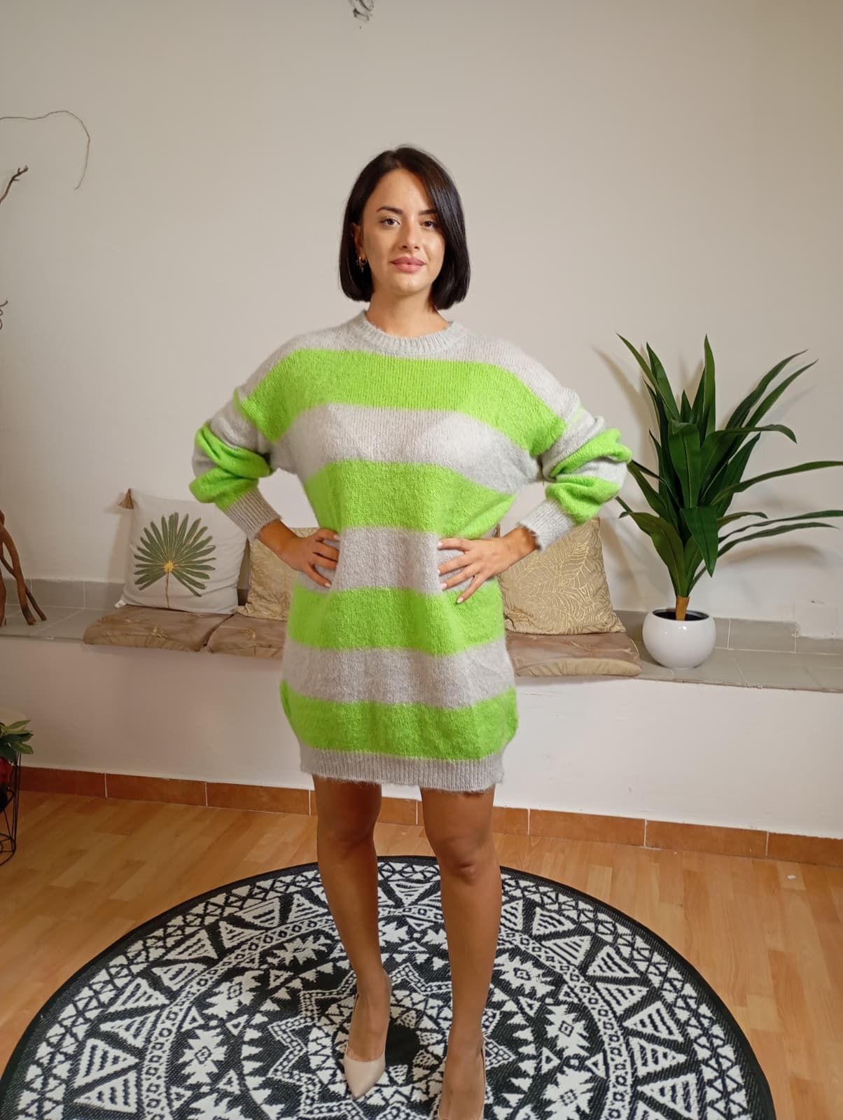 Vicolo ha creato un maxipull di grande qualità, con un tessuto particolarmente morbido al tatto. L’accostamento di questi due colori è distintivo e versatile, abbinabile facilmente a diversi look. Questo capo si adatta perfettamente sia a collant che a leggings. La modella, alta 170 cm e con un peso di 62 kg, indossa una taglia unica.