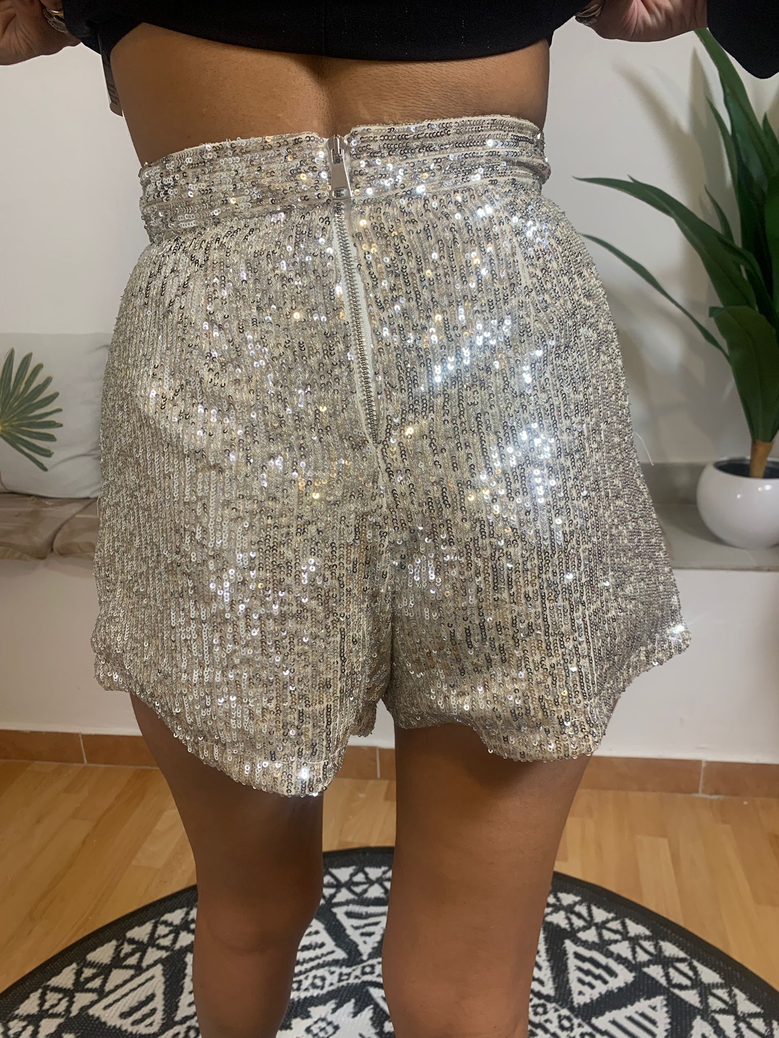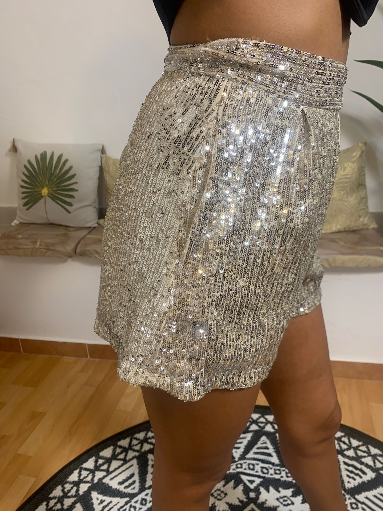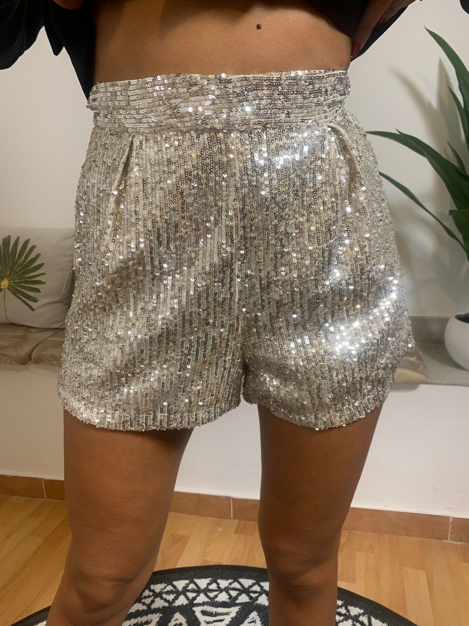 Vicolo propone un pantaloncino corto interamente rivestito di paillettes, con chiusura posteriore e due sottili pince sulla parte anteriore e posteriore, che donano una linea raffinata. La modella, alta 175 cm e del peso di 54 kg, indossa una taglia XS.