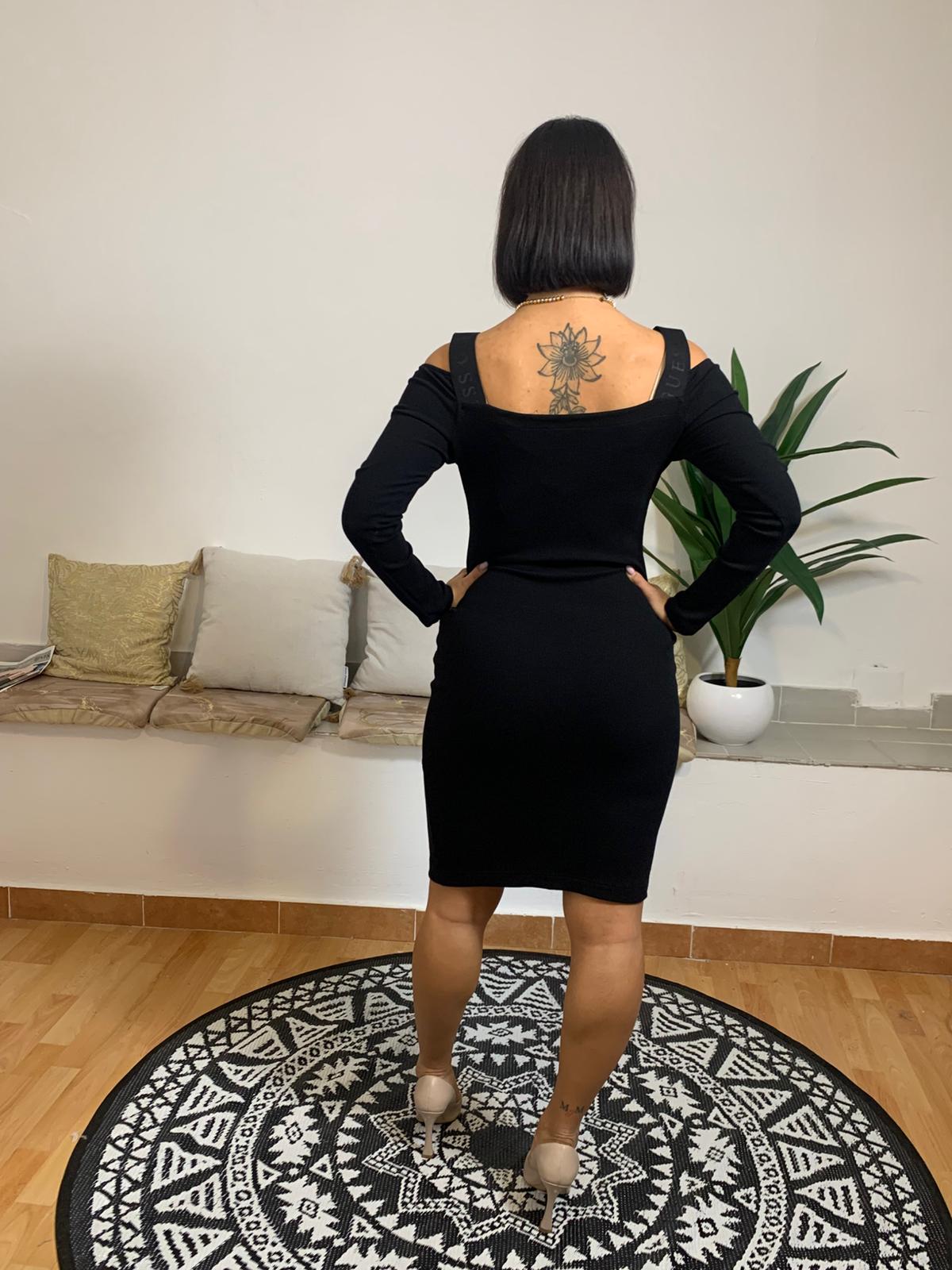 Elegant lungo vestito nero Guess in tessuto a costine, caratterizzato da maniche lunghe e spalle scoperte, sostenuto da doppie bretelle sulle spalle. Realizzato in 94% viscosa e 6% elastane per un comfort ottimale e una vestibilità aderente. Indossato da una modella di 170 cm e 62 kg.