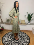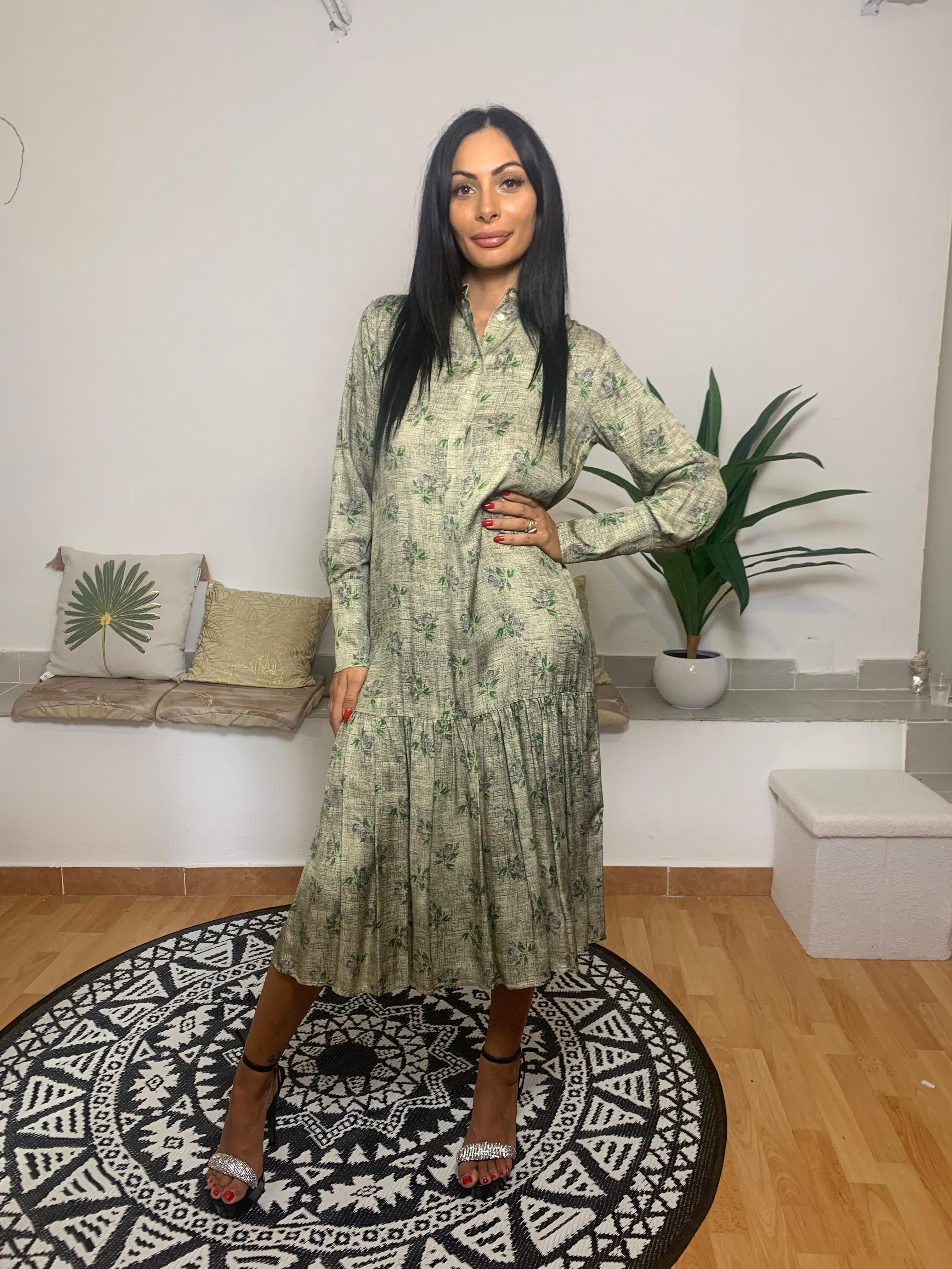 L’abito Beatrice B. Grazionso è caratterizzato da un collo camicia con bottoncini che si estendono quasi fino a metà, mantenendo una linea dritta che si interrompe presso la gonna, dove si crea un delicato arricciamento a balza. I polsini lunghi sono impreziositi da quattro bottoni. La fantasia esclusiva richiama l’effetto di un dipinto artistico. La modella, alta 175 cm e 54 kg, indossa una taglia 38. Realizzato al 100% in viscosa, assicura una vestibilità confortevole e una caduta elegante.
