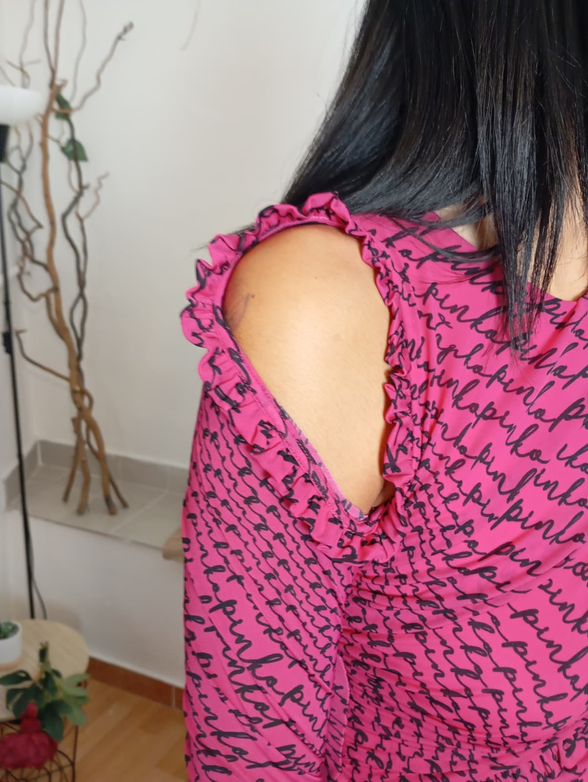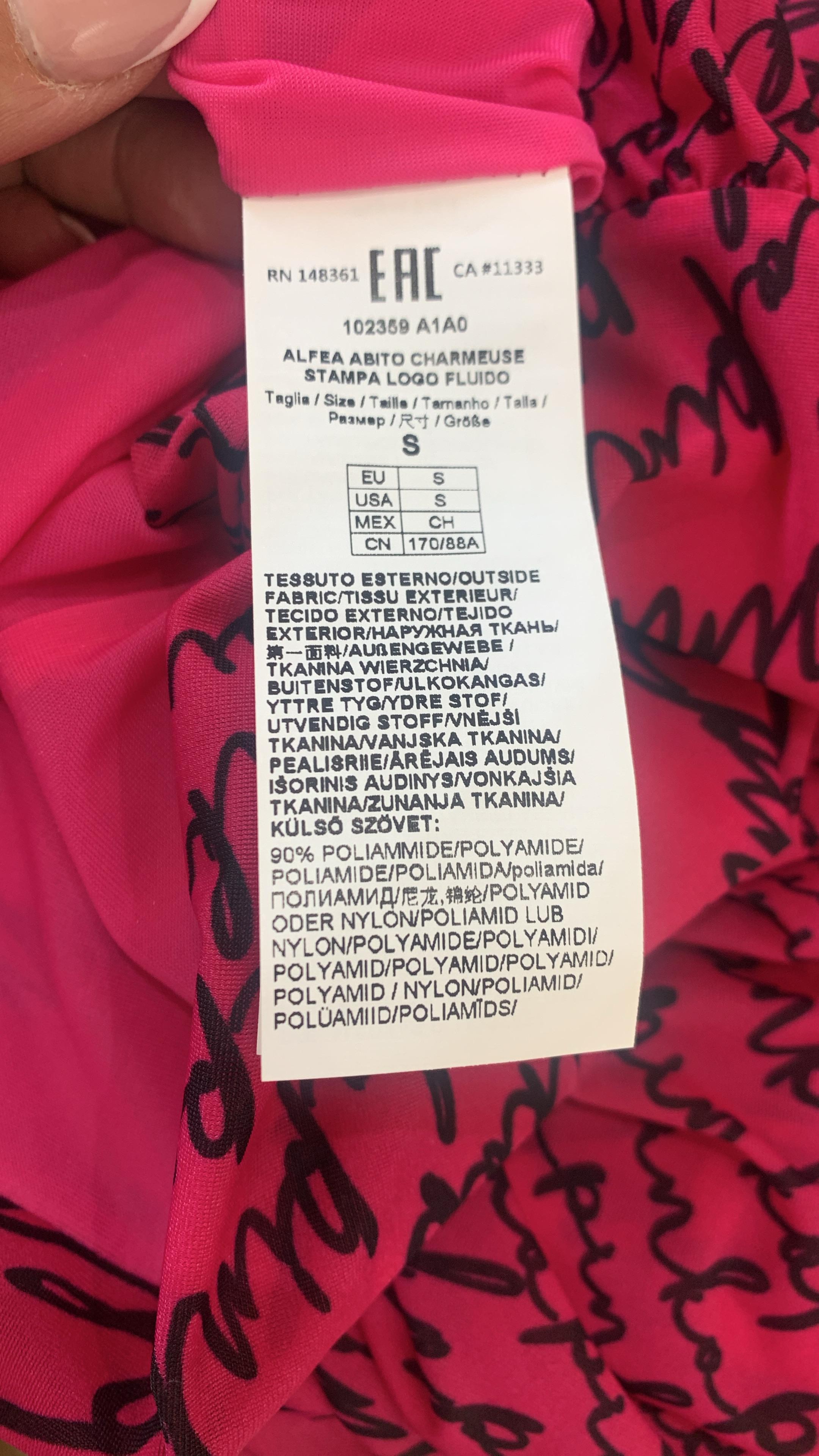 PINKO. Miniabito in tessuto elasticizzato e morbido, caratterizzato da una zip frontale con arricciatura, da una seconda arricciatura sotto il seno e da un'apertura sulla spalla. Il capo è decorato con scritte Pinko che coprono l'intera superficie. La modella indossa una taglia S, è alta 175 cm e pesa 54 kg. Composizione: 90% poliammide, 10% elastan.