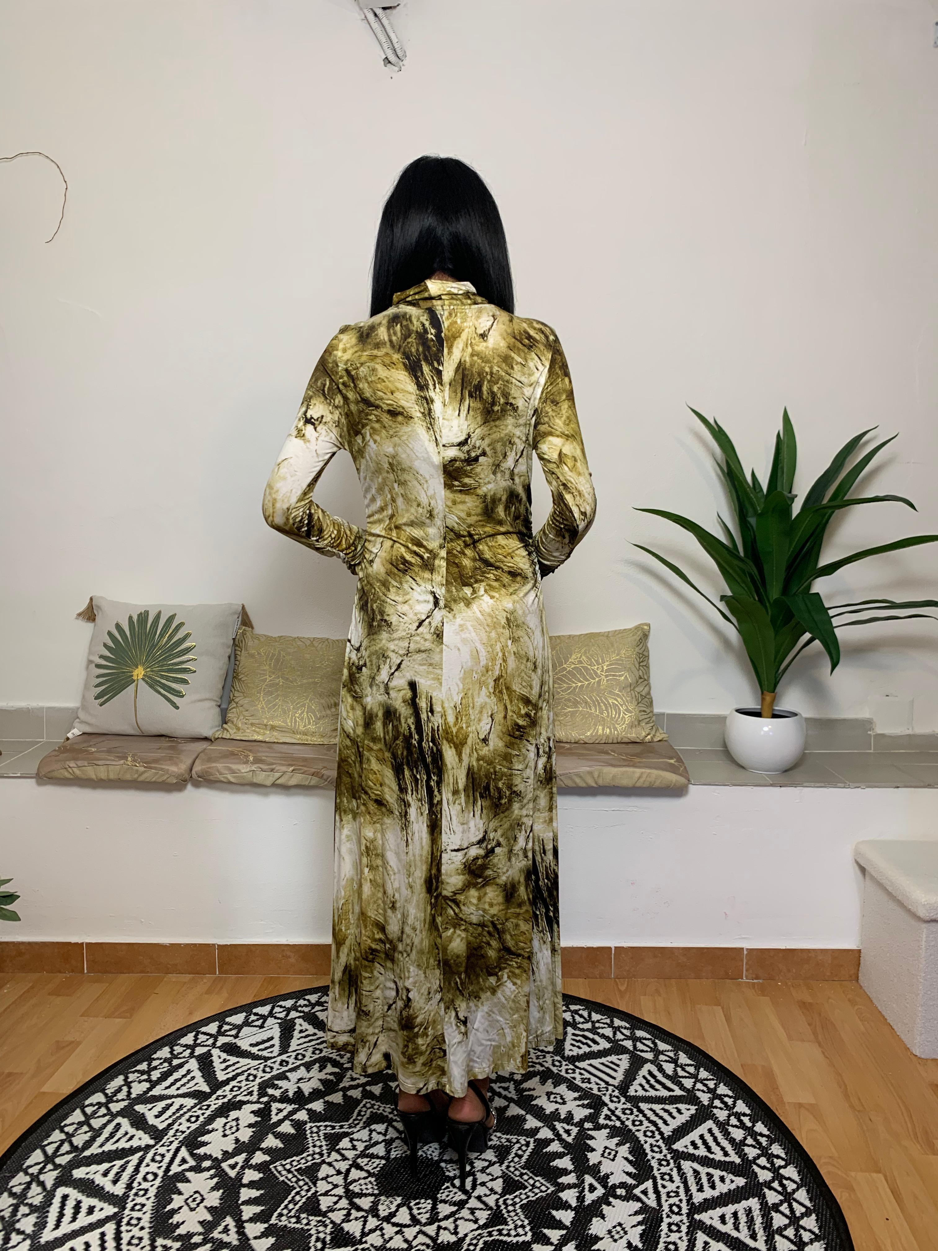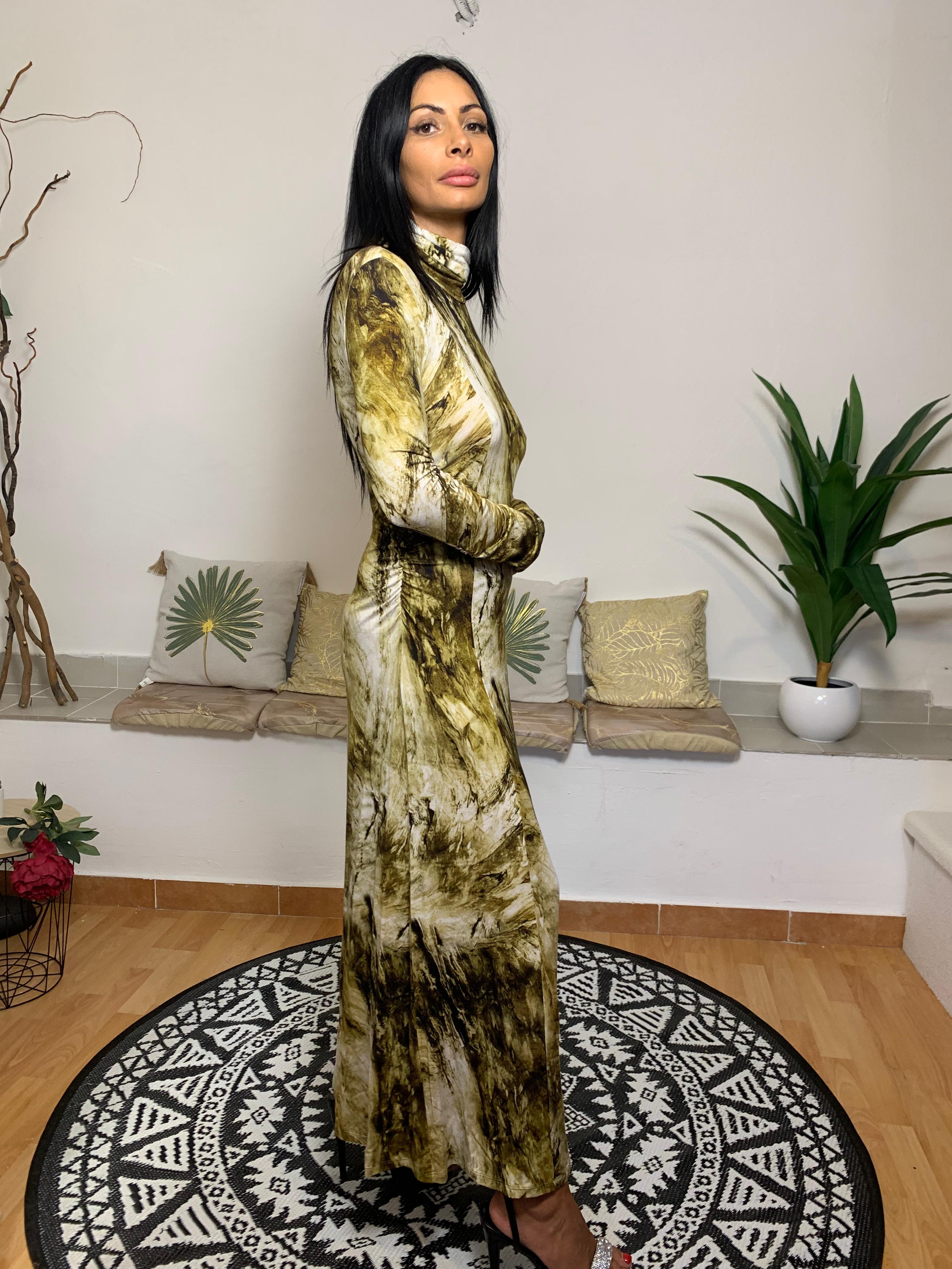 L’abito di Beatrice B. presenta un design avvolgente ed elegante, con un taglio curato caratterizzato da collo alto e maniche lunghe. Il drappeggio su entrambi i fianchi e la linea leggermente svasata esaltano la femminilità. La stampa sfumata con effetto mal tinte conferisce un tocco sofisticato. La modella, alta 175 cm e con peso di 54 kg, indossa una taglia L. Composizione: 97% viscosa, 3% elastan.