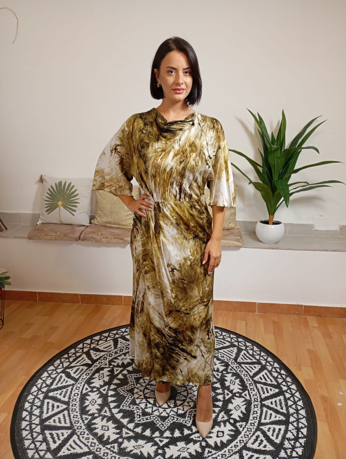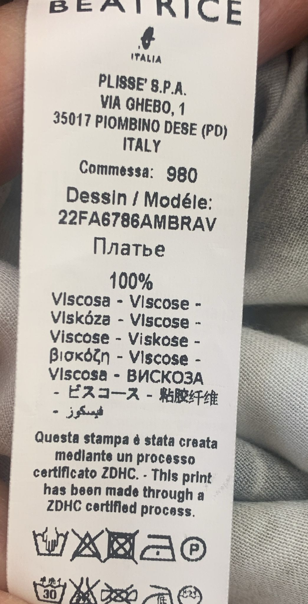 Beatrice B. propone un abito caratterizzato da un taglio distintivo, collo morbido e maniche a mezz’aria dal profilo fluido simile a quelle a pipistrello. La vestibilità prevede un taglio in vita che si apre leggermente con una gonna leggermente svasata. La modella, alta 170 cm e del peso di 62 kg, indossa una taglia 46. Realizzato interamente in viscosa al 100%.
