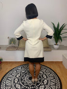 CLIPS presenta un abitino con maniche a tre quarti, caratterizzate da una fascia nera sul fondo, richiamata anche sull’orlo della gonna. La scollatura a girocollo è arricchita da due anelli decorativi color oro. La chiusura posteriore è dotata di una zip. La modella, alta 170 cm e con un peso di 62 kg, indossa una taglia 42. Composizione: 63% poliestere, 33% viscosa, 4% elastan.