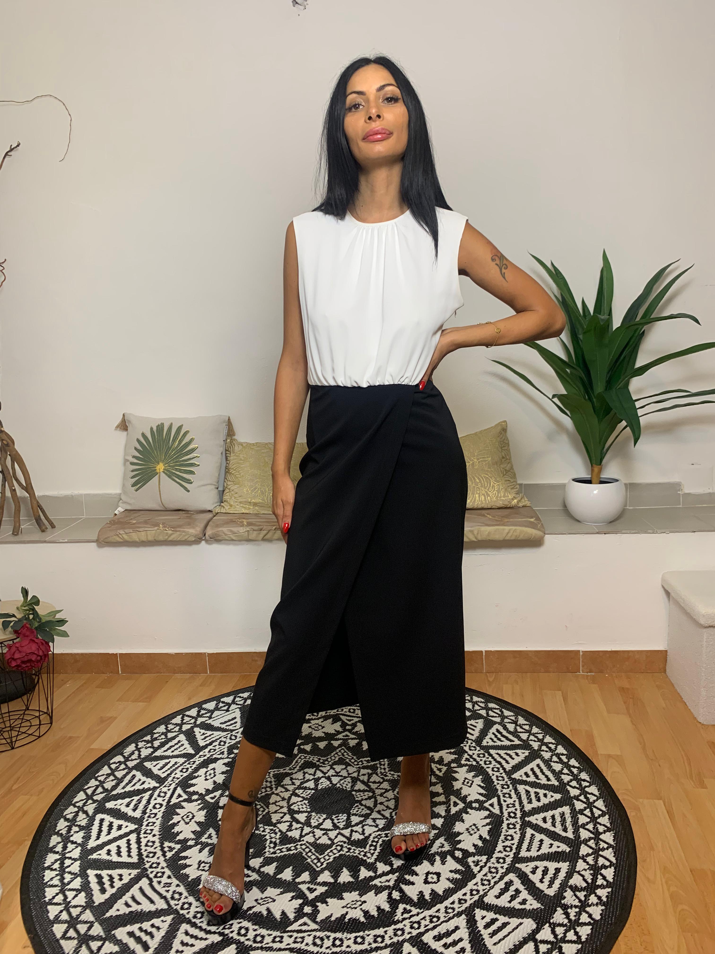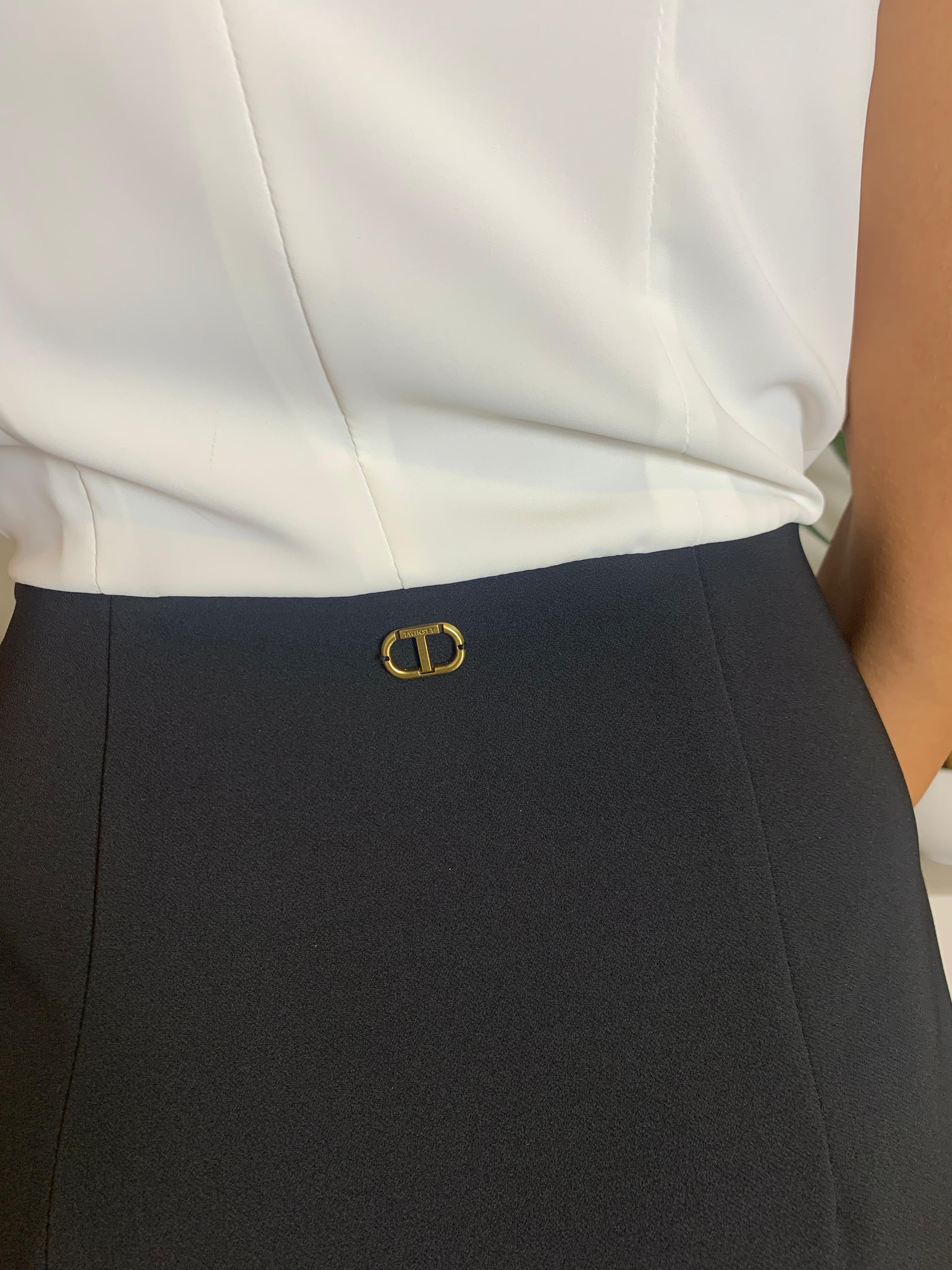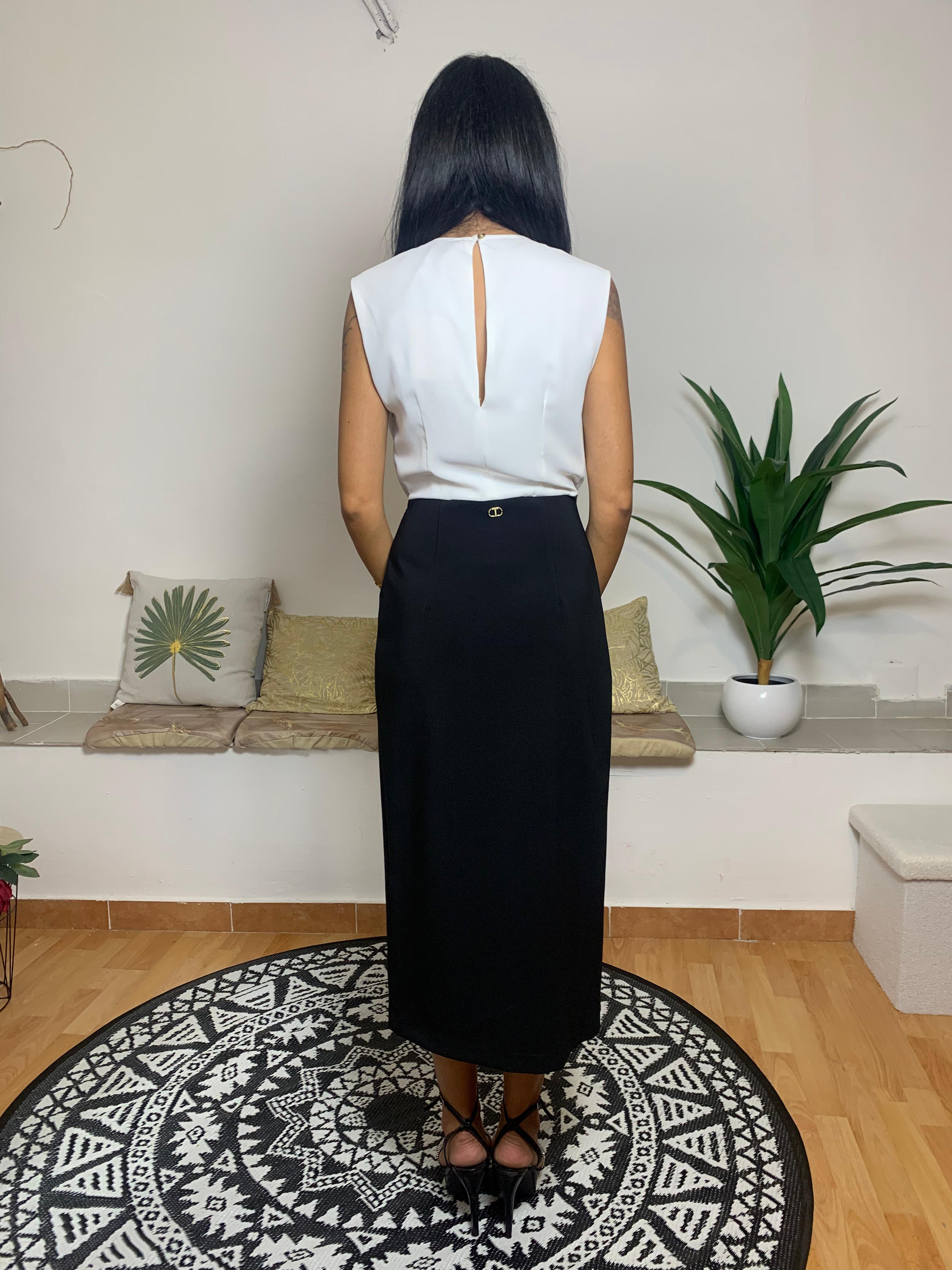 L’eleganza essenziale prende forma in questo abito Twinset Milano, caratterizzato da un raffinato gioco di bianco e nero. La parte superiore, in bianco, si distingue per un taglio semplice con chiusura posteriore, mentre la gonna nera presenta una linea a portafoglio con spacco che ne valorizza la silhouette. Sul retro spicca il logo metallico del brand, dettaglio distintivo. Il tessuto combina poliestere ed elastan, garantendo comfort e vestibilità. La modella, alta 175 cm e di 54 kg, indossa una taglia 42.