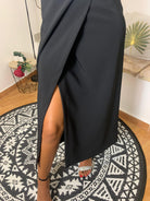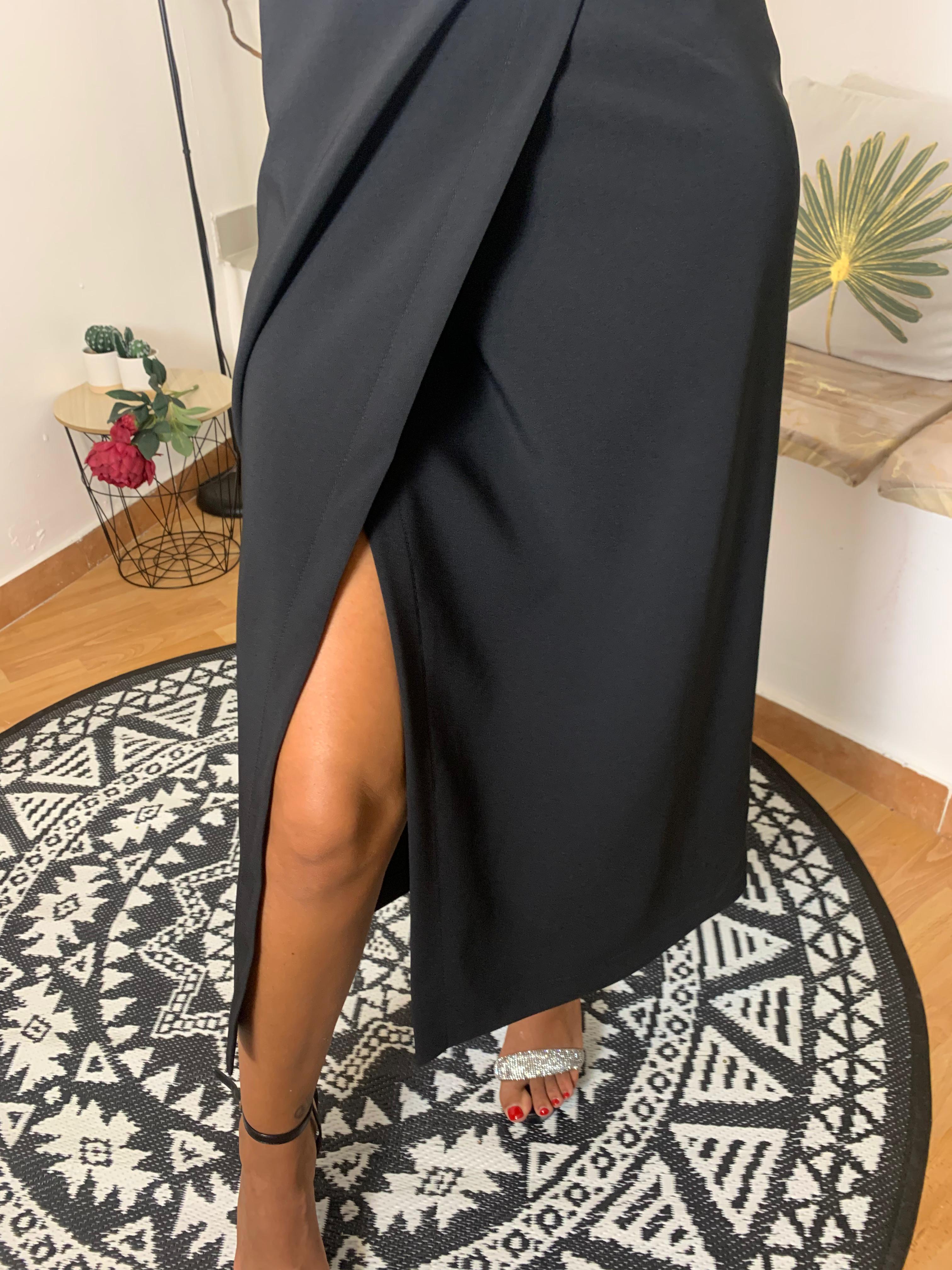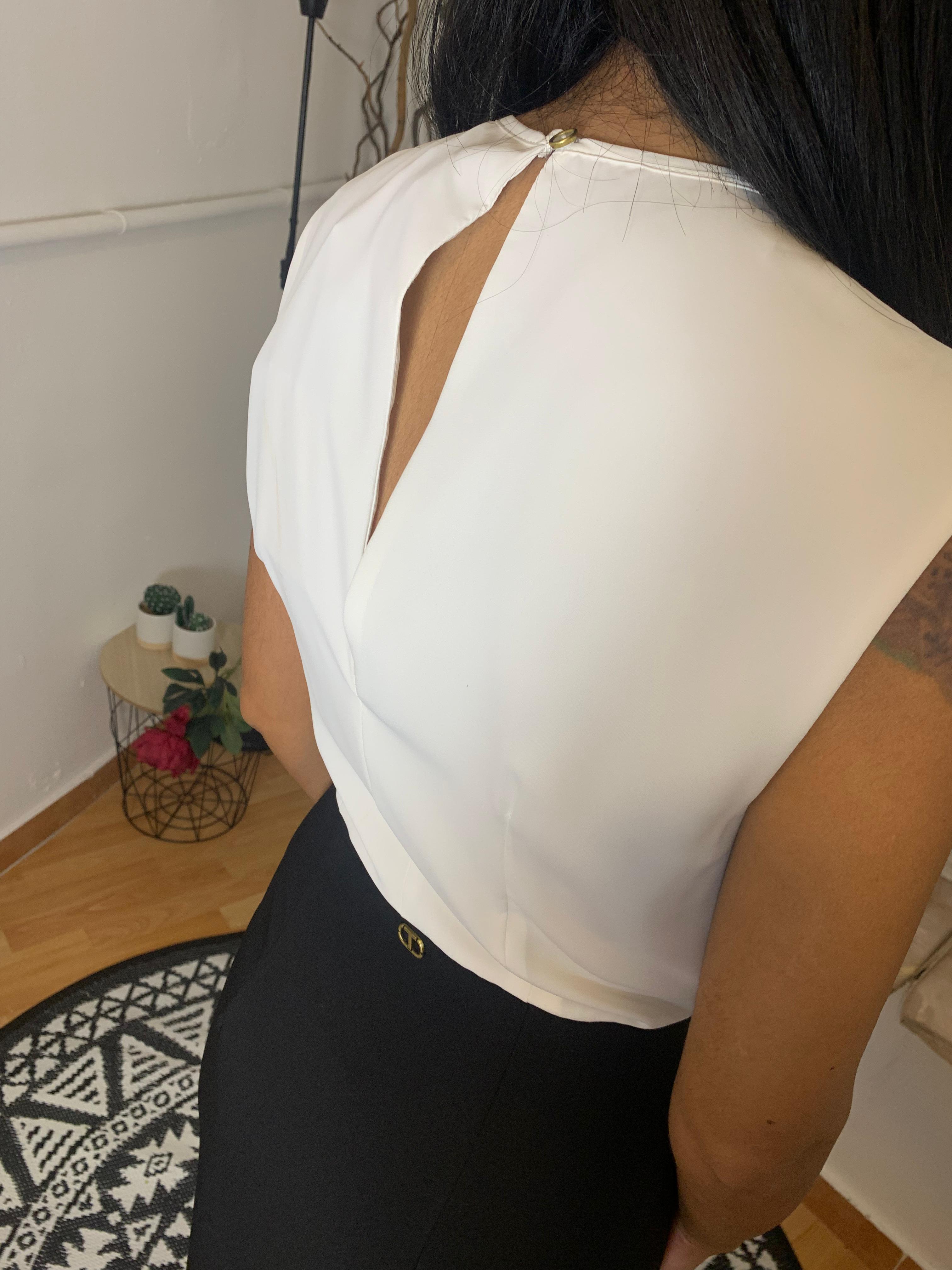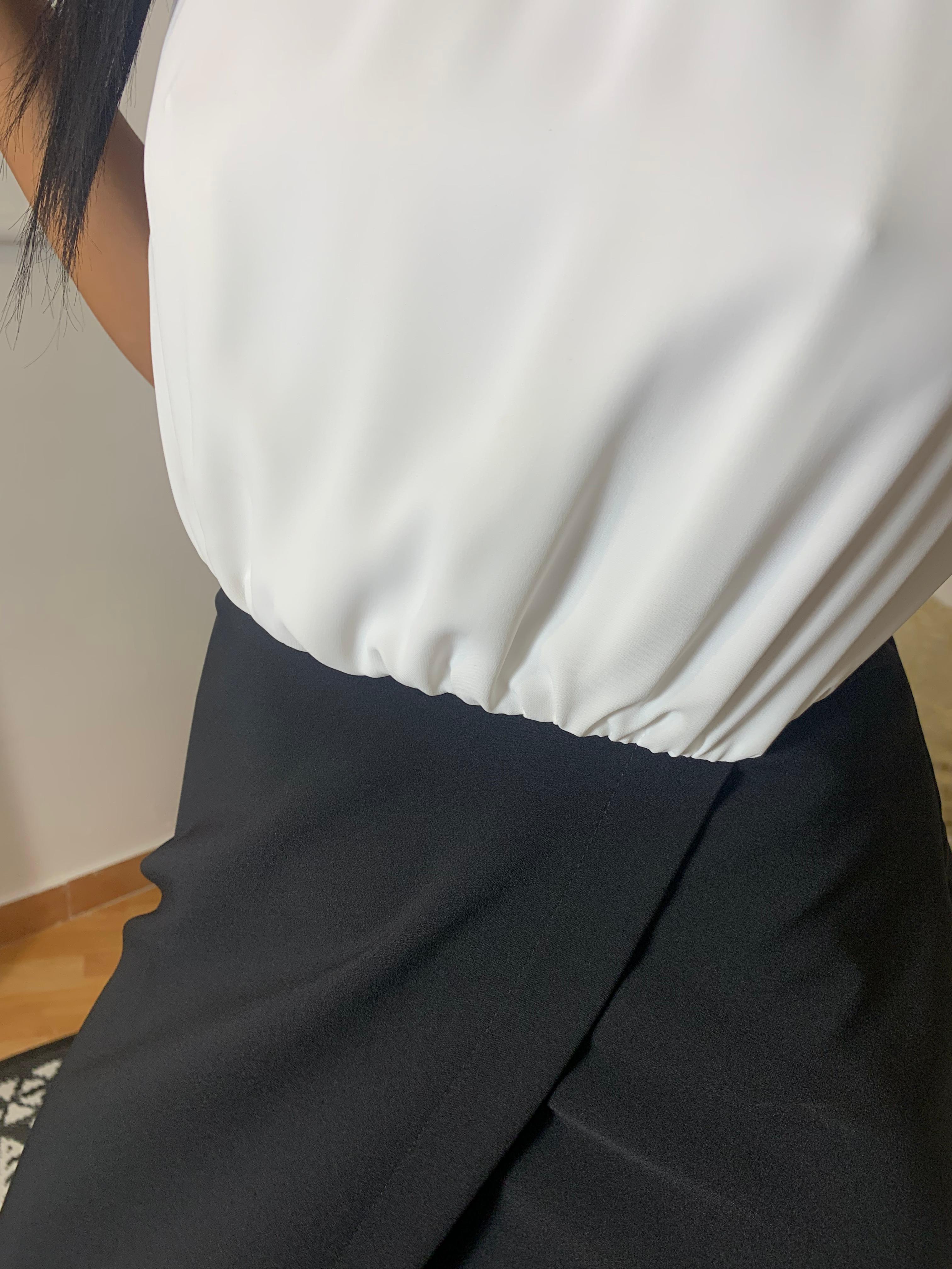 L’eleganza essenziale prende forma in questo abito Twinset Milano, caratterizzato da un raffinato gioco di bianco e nero. La parte superiore, in bianco, si distingue per un taglio semplice con chiusura posteriore, mentre la gonna nera presenta una linea a portafoglio con spacco che ne valorizza la silhouette. Sul retro spicca il logo metallico del brand, dettaglio distintivo. Il tessuto combina poliestere ed elastan, garantendo comfort e vestibilità. La modella, alta 175 cm e di 54 kg, indossa una taglia 42.