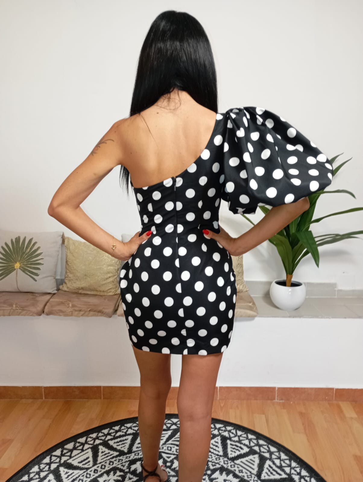 Pinko presenta un elegante abito monospalla caratterizzato da una manica a palloncino drappeggiata su un lato, con una base nera decorata da pois bianchi. Il modello, alto 175 cm e con un peso di 54 kg, indossa una taglia 40. Realizzato interamente in poliestere, unisce stile e comfort con una lavorazione raffinata.
