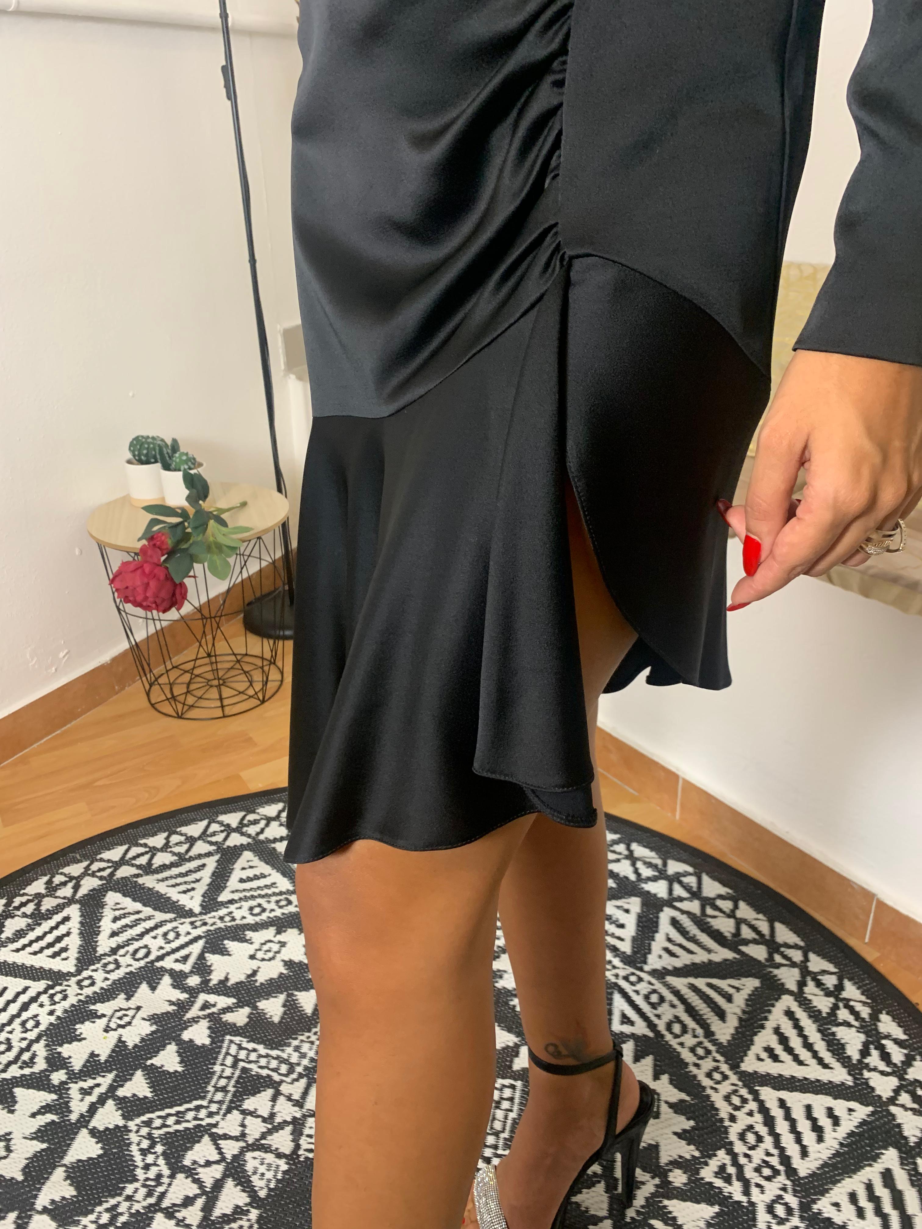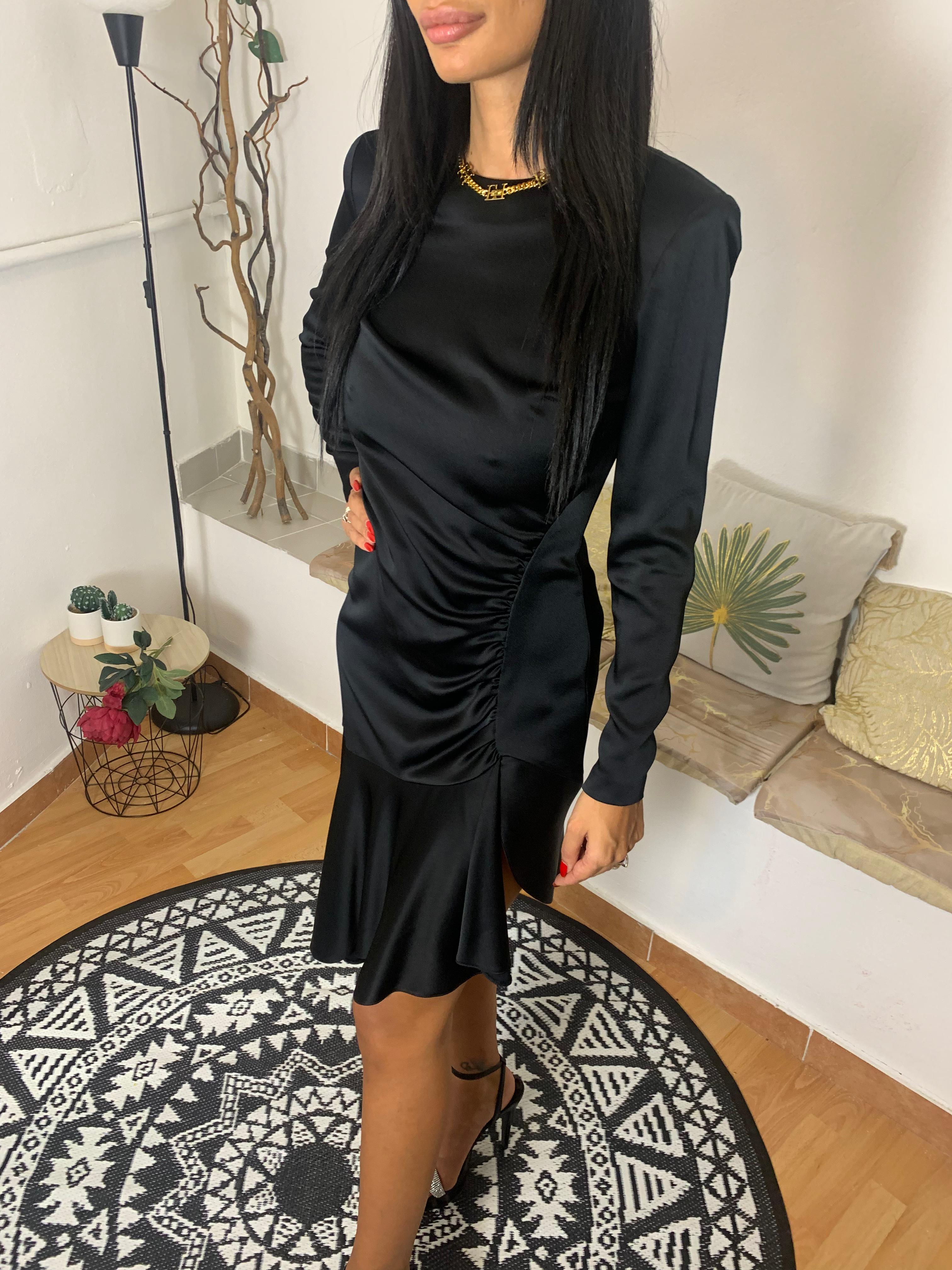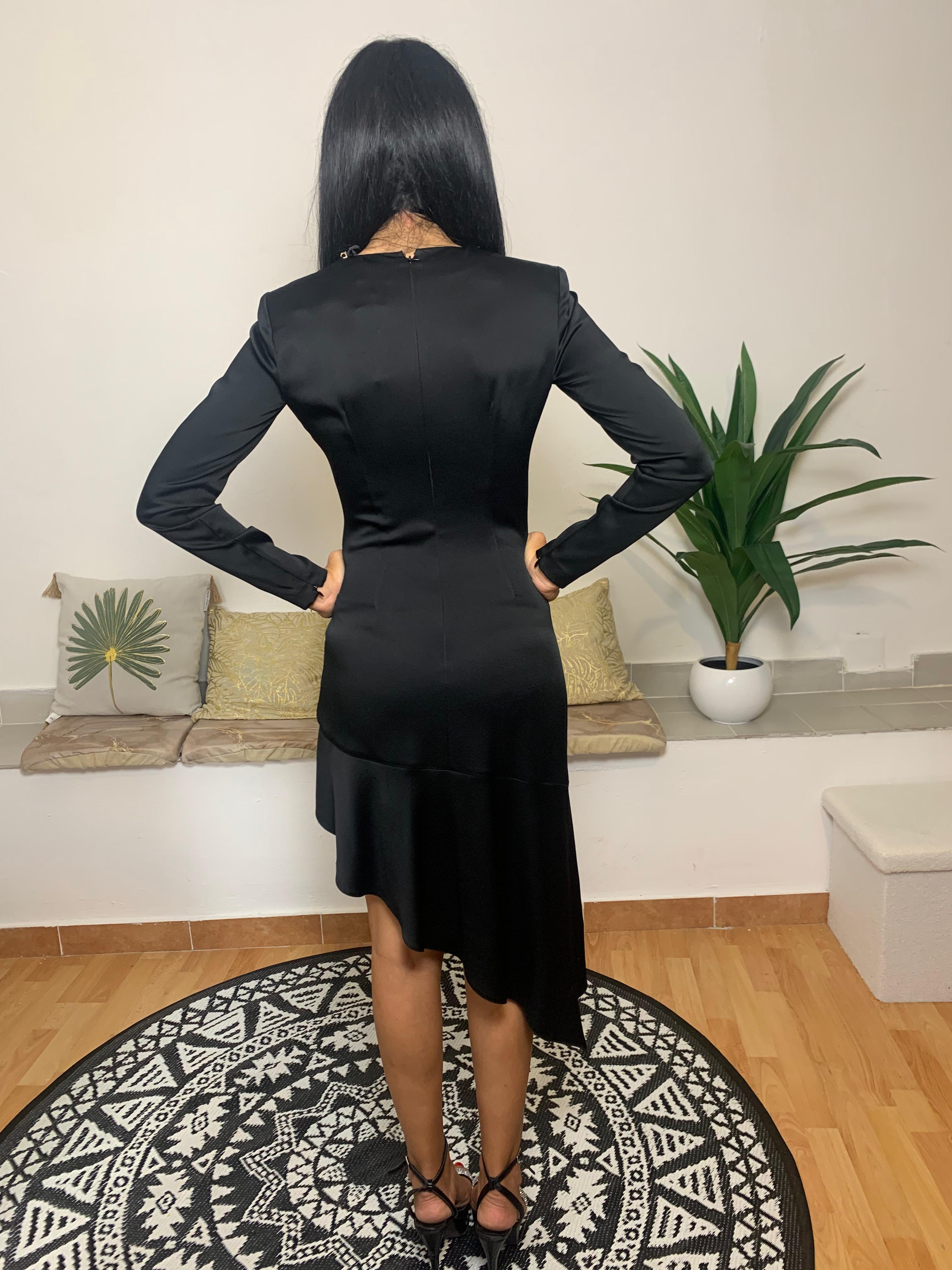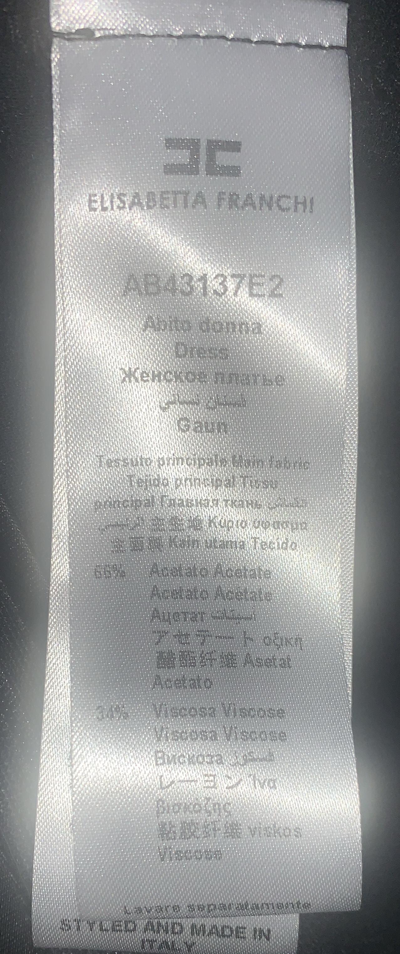 Elisabetta Franchi è una stilista capace di esaltare forme e sensualità con un abito come questo. Il modello presenta un girocollo arricchito da una collana che ne segue la linea, decorata con le iniziali della stilista. Il taglio asimmetrico si caratterizza per uno drappeggio su un lato e uno spacco sul fondo, mentre la gonna svasata si chiude con un delicato volant. La modella indossa una taglia 40, è alta 175 cm e pesa 54 kg. Composizione: 66% acetato, 34% viscosa.