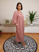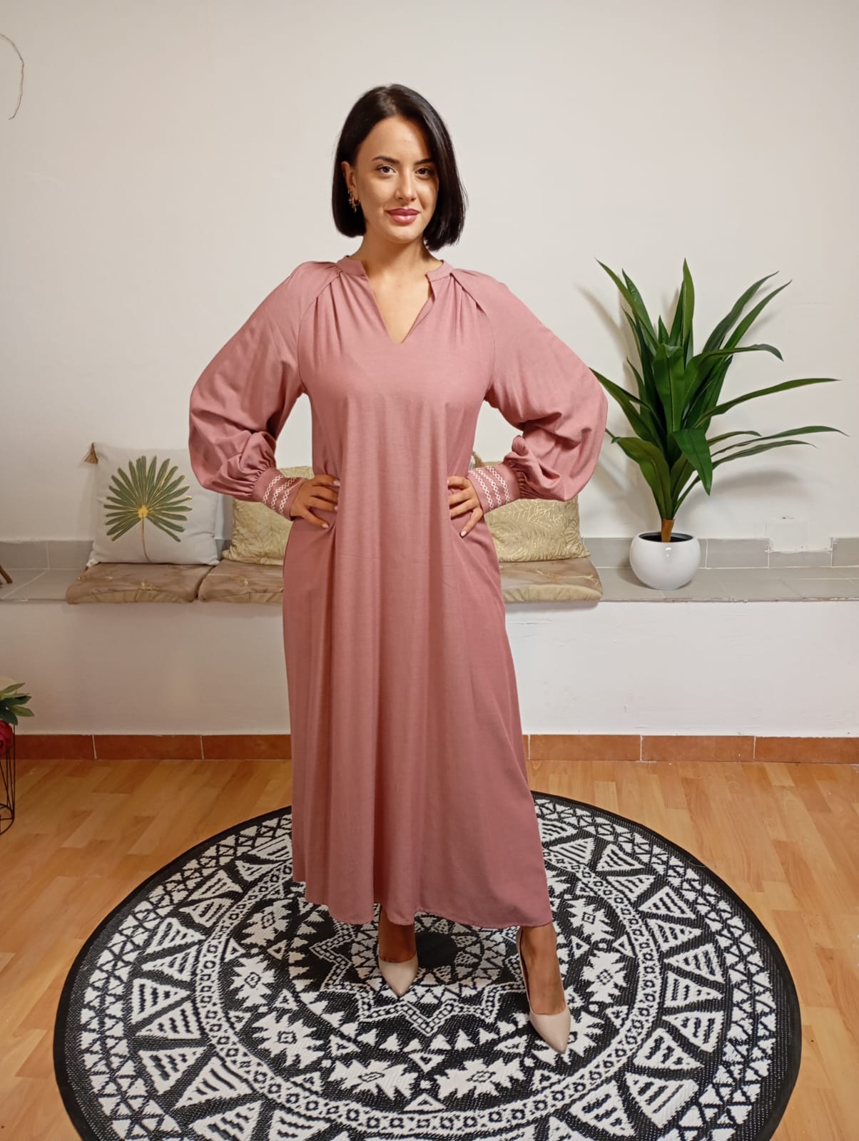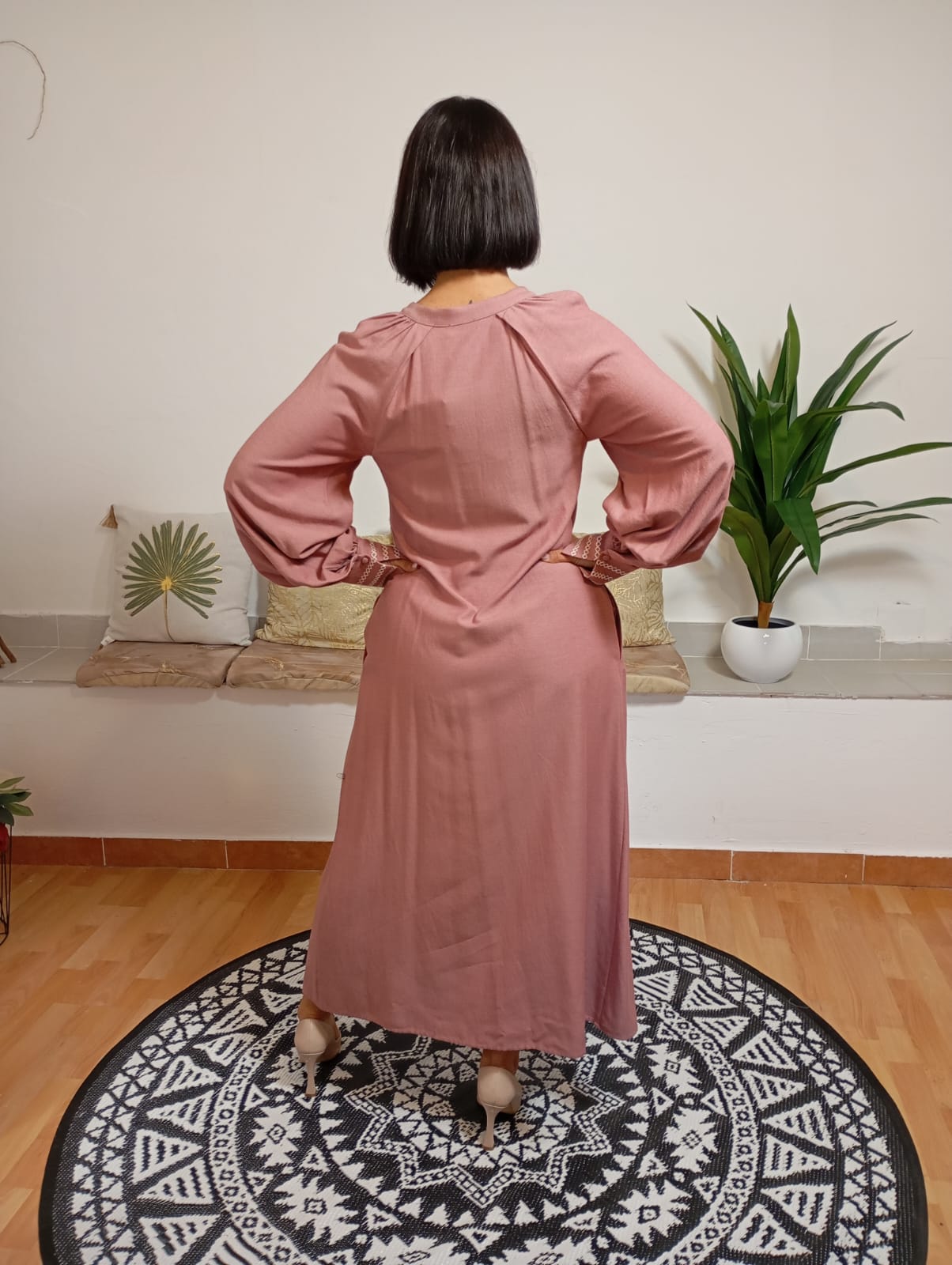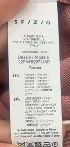 Questa creazione di Sfizio offre una linea straordinaria con dettagli minimalisti ma di grande effetto: un design senza collo con chiusura a lecchetto. Le maniche a sbuffo sono completate da polsini ricamati con bottoncini raffinati. La modella, alta 170 cm e con un peso di 62 kg, indossa una taglia 42. Il tessuto è composto dall’88% di viscosa e dal 12% di lana vergine.