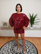 Aniye B presenta un elegante abito dalla vestibilità aderente nella parte della gonna, ma con un tessuto soffice. Si distingue per una profonda scollatura posteriore, chiusa da un sottile laccetto. La sua vera particolarità risiede nella copertura di paillettes cucite con estrema precisione, che valorizzano la sua bellezza. La modella, alta 170 cm e del peso di 62 kg, indossa una taglia 42.