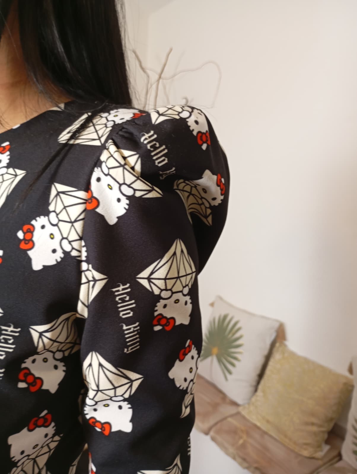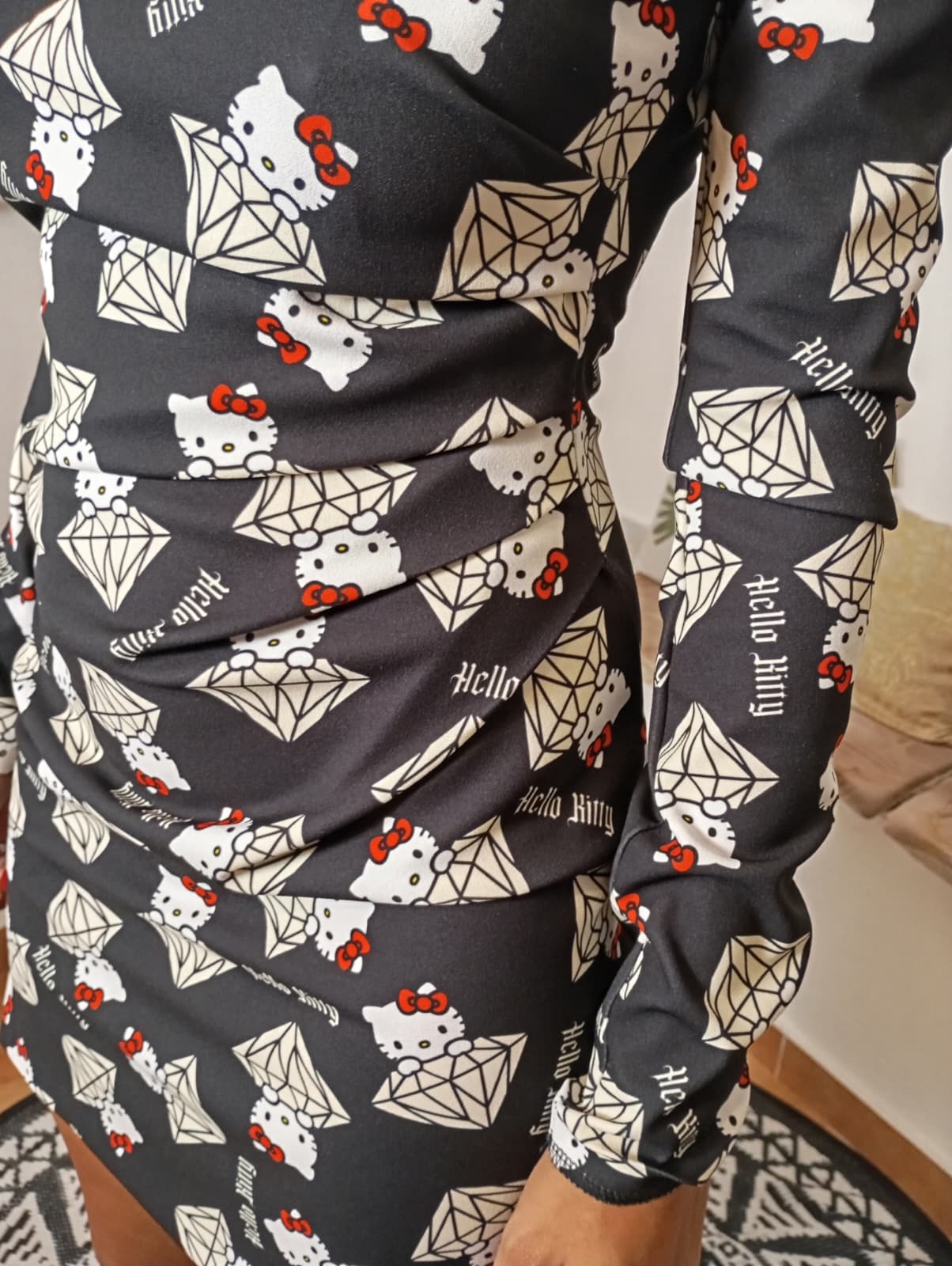 Aniye By presenta l'abito Kitty Diamon, un modello firmato Hello Kitty. Questo vestito aderente è arricciato sul lato sinistro con uno spacco nella parte inferiore. Le spalline sottili e l'arricciatura sulle spalle creano un delicato effetto balloon. La modella indossa la taglia 42, con un’altezza di 175 cm e un peso di 54 kg. Realizzato in 95% poliestere e 5% elastan, garantisce comfort e vestibilità.