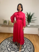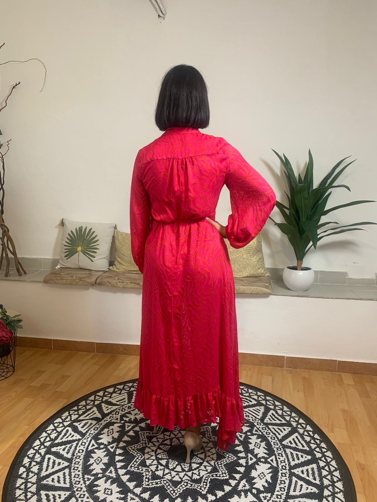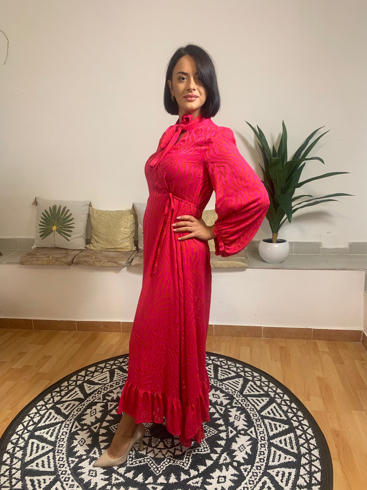 Beatrice B propone un abito lungo dal grande impatto, caratterizzato da un nodo al collo e uno scollo che simula un effetto incrociato. Anche in vita è presente un dettaglio che richiama l’incrocio con un laccetto, ma tutto il capo è cucito su misura. La parte inferiore dell’abito si conclude con una delicata balza. La modella, alta 170 cm e con un peso di 62 kg, indossa una taglia 42. Il tessuto è composto per il 65% da viscosa e per il 35% da poliestere, mentre la fodera interna è in 100% viscosa.