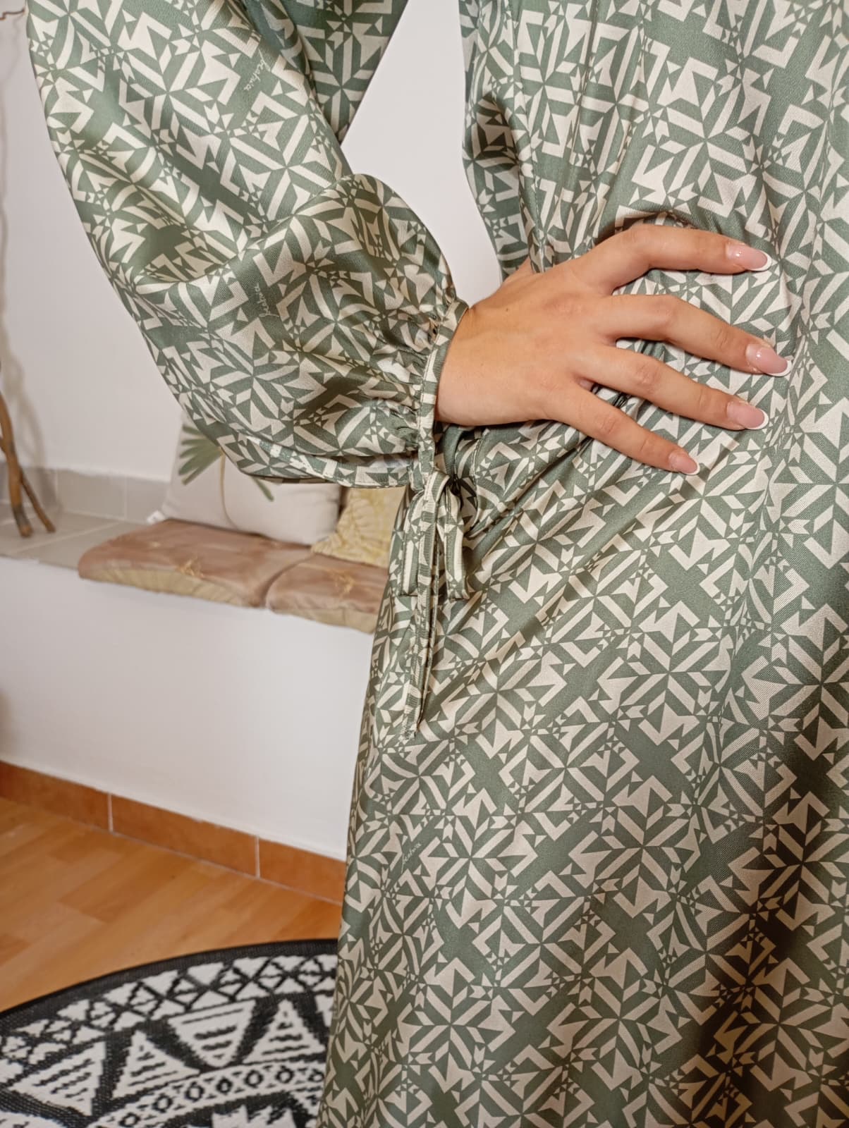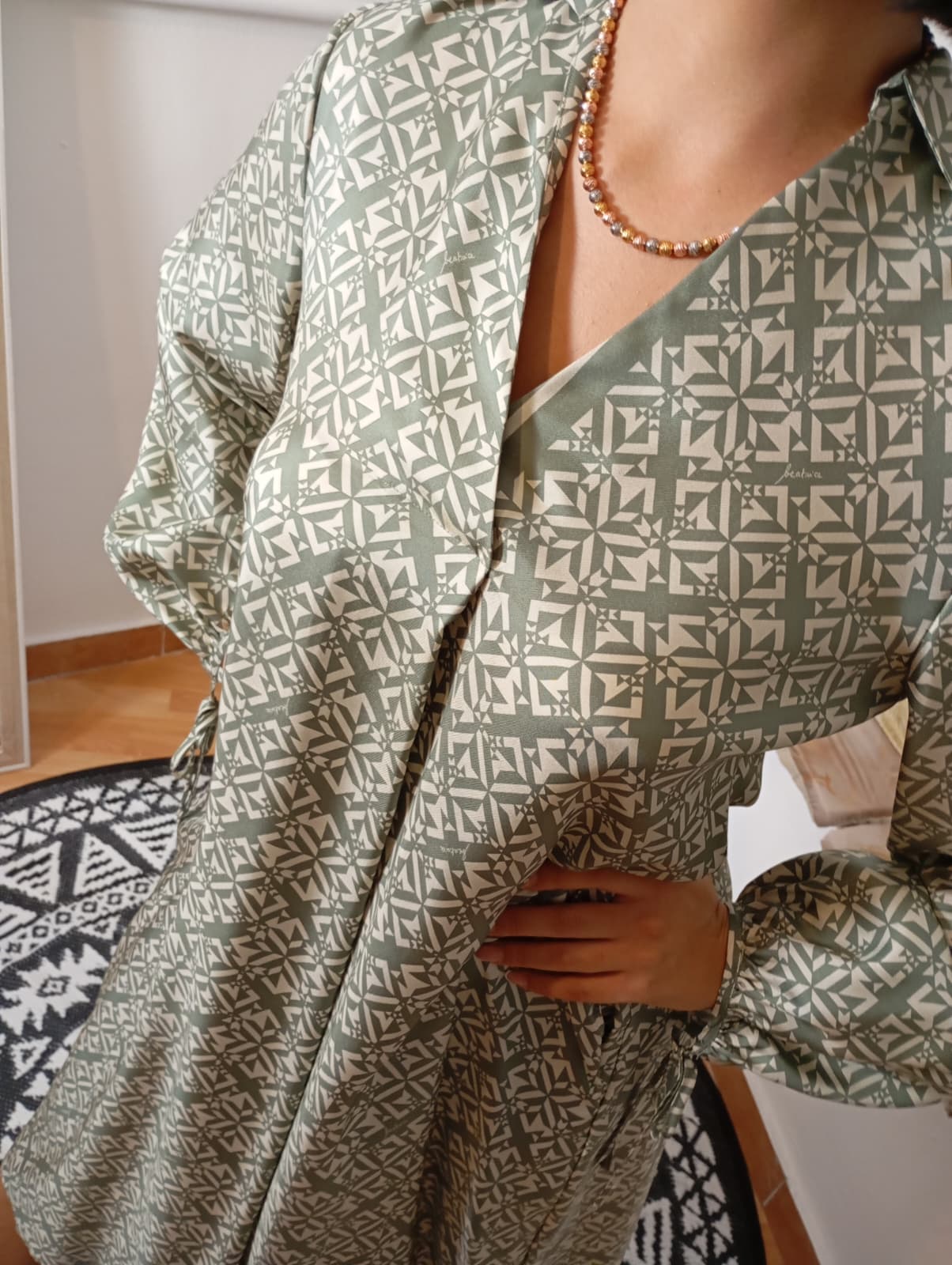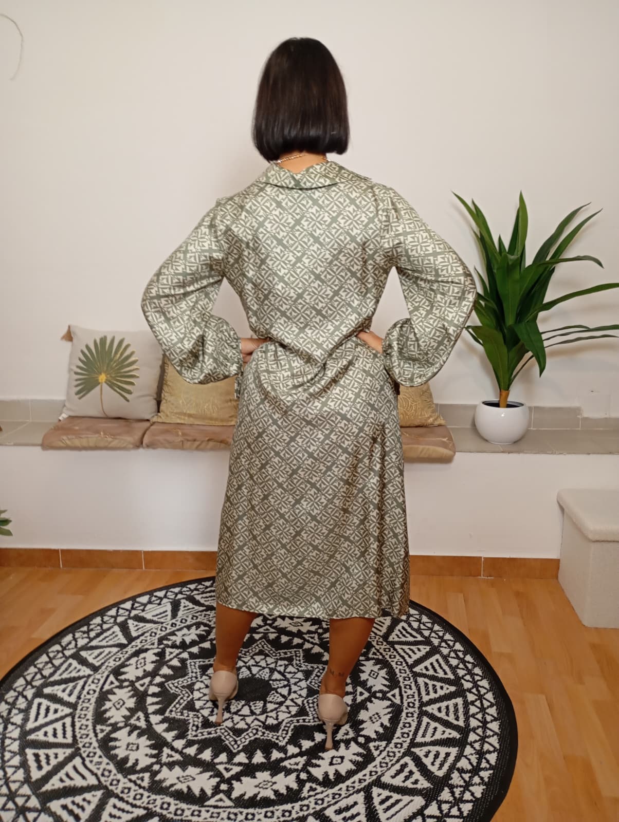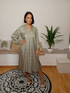 L'abito Beatrice B. presenta una silhouette morbida e regolare, caratterizzata da una fantasia e una combinazione di colori studiate nei toni salvia e champagne. Il modello ha un collo a camicia con scollo a V, tasche invisibili e lacci ai polsini. La modella, alta 170 cm e con un peso di 62 kg, indossa una taglia 42. Realizzato al 100% in seta, garantisce comfort e qualità superiore.
