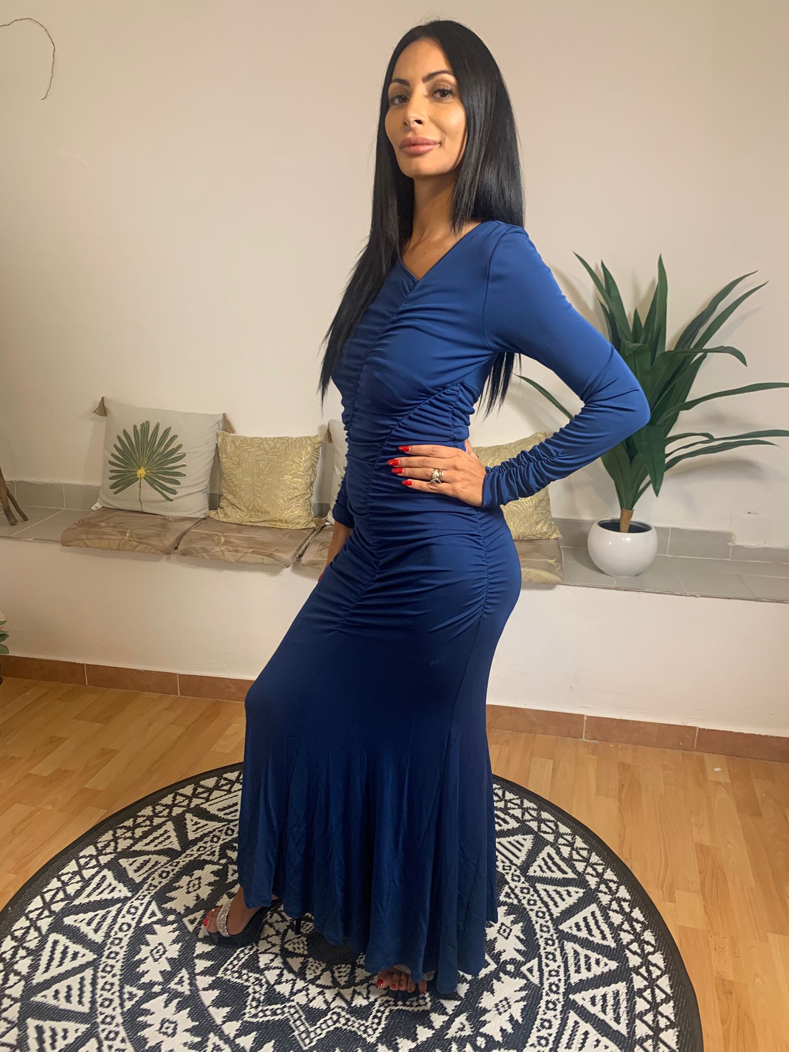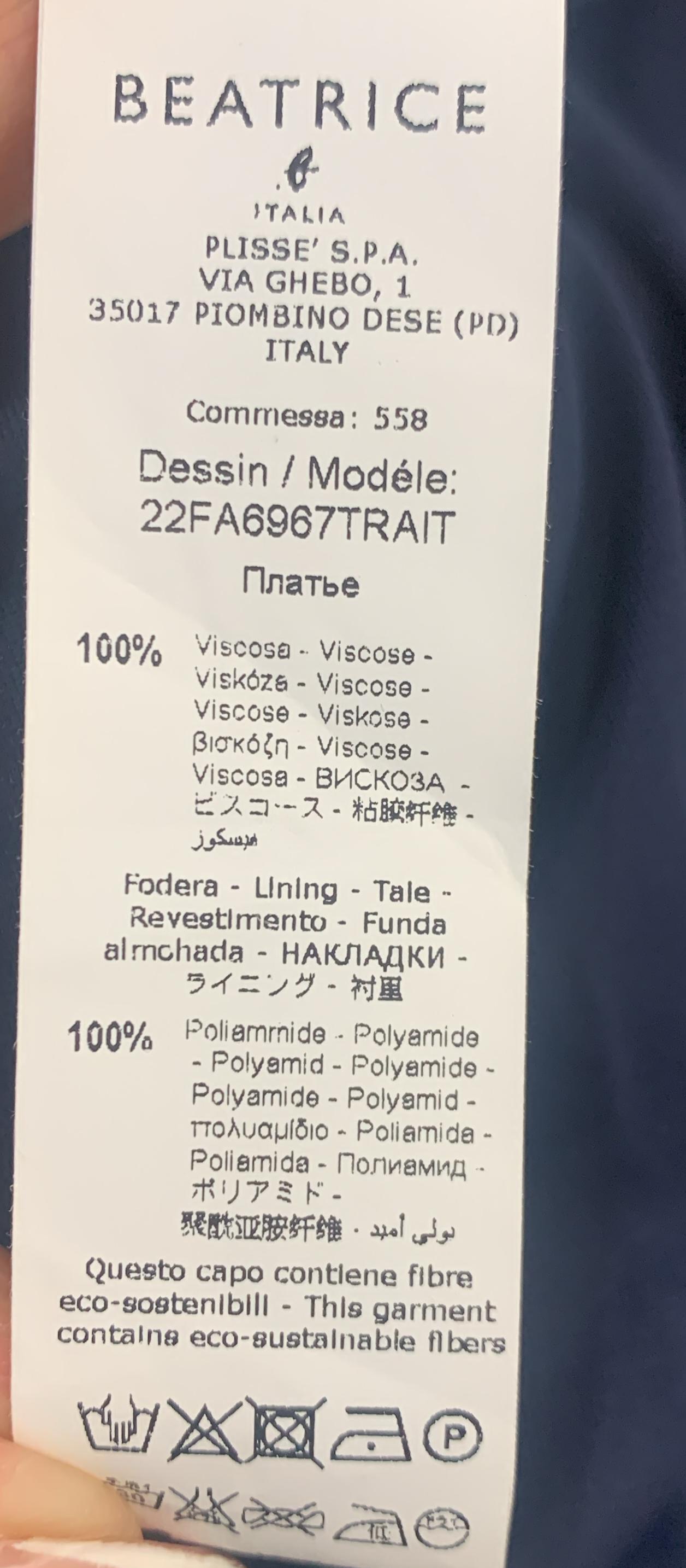 L'abito Beatrice B. presenta una linea avvolgente con finiture a sirena e uno scollo asimmetrico drappeggiato sia sul davanti che sul retro. Questo capo esalta elegantemente la silhouette femminile, valorizzandone la sensualità. La modella, alta 175 cm e con un peso di 54 kg, indossa una taglia 42. Realizzato al 100% in viscosa, garantisce comfort e morbidezza.