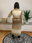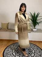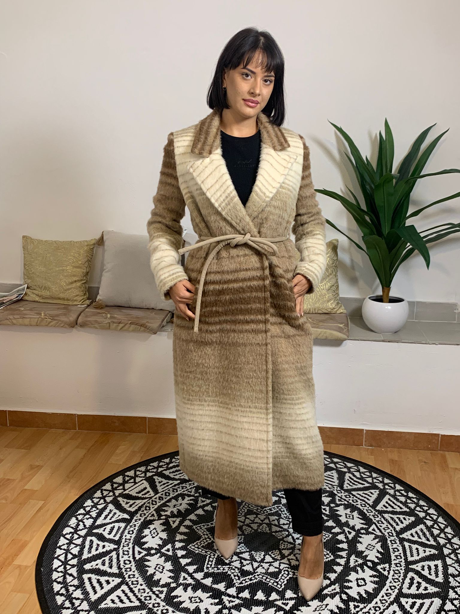 Il cappotto Sfizio è dotato di una cintura in tessuto che valorizza la silhouette evidenziando il punto vita. Realizzato completamente in viscosa al 100%, presenta un tessuto Rock interamente Made in Italy e viene prodotto con un approccio eco-friendly. La modella indossa una taglia S, pesa 62 kg ed è alta 170 cm.