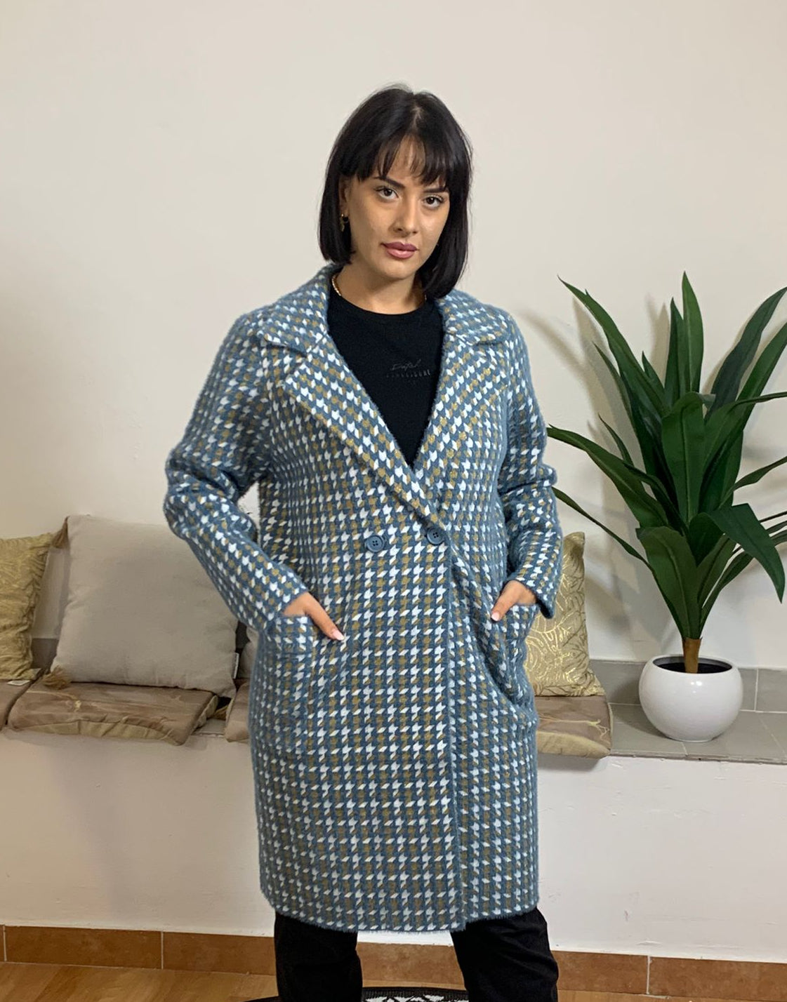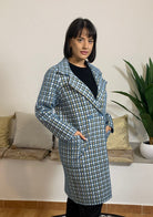 PEGGY HO offre un cappotto decorato con una fantasia a piccoli quadretti frammentati in stile pied de poule azzurro. Il capo presenta una struttura a doppio petto e due ampie tasche frontali. È confezionato in maglia con il 70% di poliammide, 20% di poliestere e 10% di fibra metallizzata. La modella, alta 170 cm e del peso di 62 kg, indossa una taglia L.