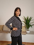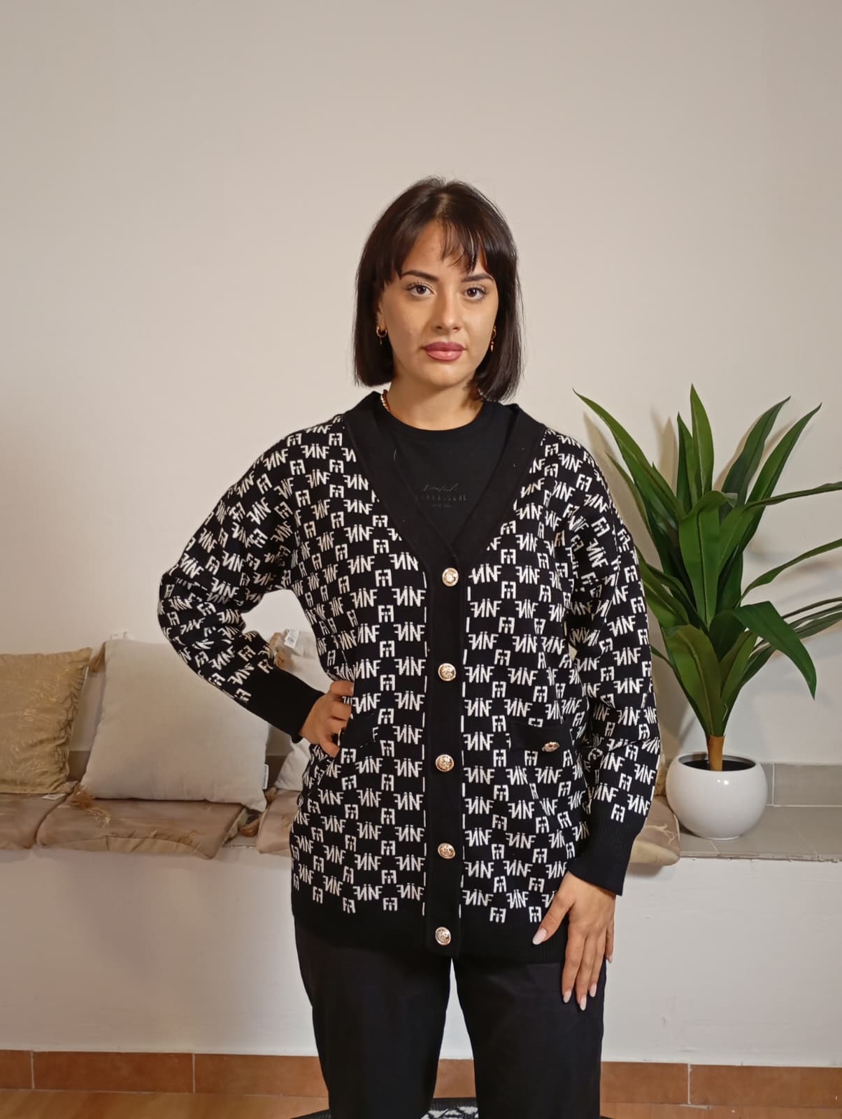 INFLUENCER presenta un cardigan di media lunghezza, caratterizzato da una raffinata morbidezza e da dettagli esclusivi di grande tendenza. L’intera superficie della maglia è decorata con le iniziali del marchio, mentre il bordo a contrasto crea un effetto distintivo. I bottoni color oro e con logo, completano il design elegante. La modella, alta 172 cm e del peso di 62 kg, indossa una taglia S. Composizione: 50% viscosa, 30% poliammide, 20% poliestere.