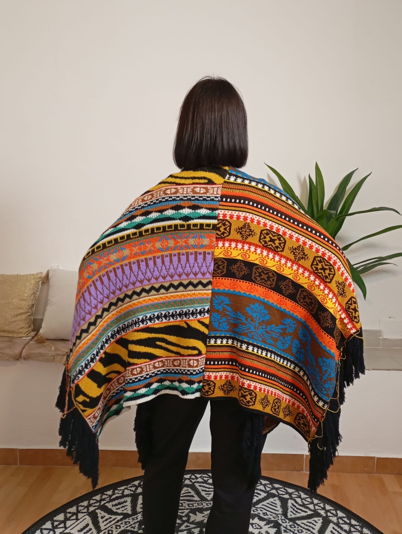 PONCHO AKEP. Vivace e arricchito da frange che riprendono le tonalità del capo, offre un mix caldo e soffice composto da 36% lana merino, 32% acrilico, 16% poliammide e 16% alpaca. Indossato da una modella alta 170 cm e con un peso di 62 kg, garantisce una vestibilità confortevole e raffinata.