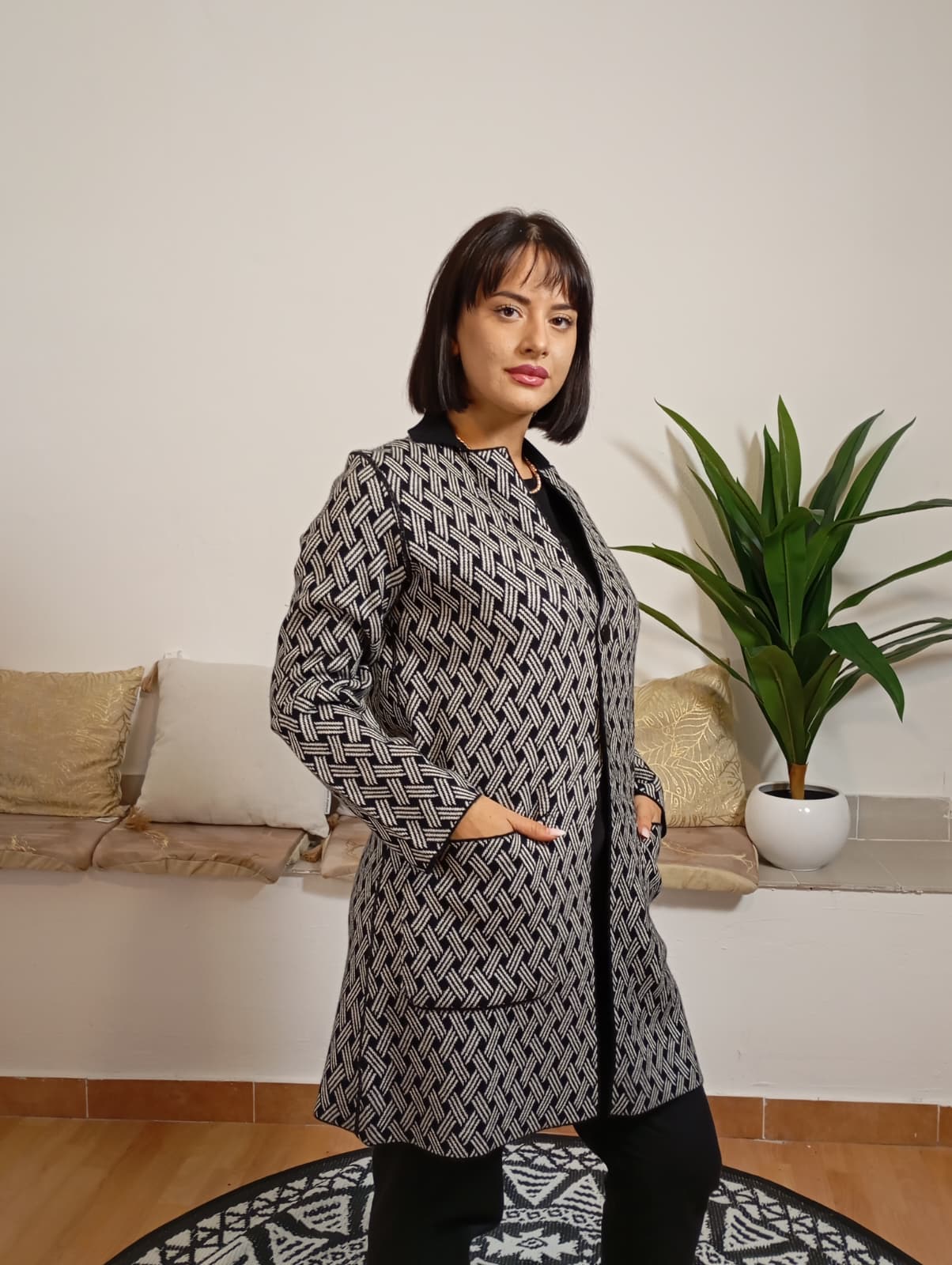 Il cardigan Maidamila, privo di cappuccio, è caratterizzato da tasche funzionali e un colletto alto. Il capo presenta dettagli unici distribuiti su tutta la superficie. Realizzato in un mix di 40% lana, 30% acrilico e 30% poliammide, offre equilibrio tra calore e resistenza. La modella indossa una taglia adatta a un'altezza di 170 cm e un peso di 62 kg.