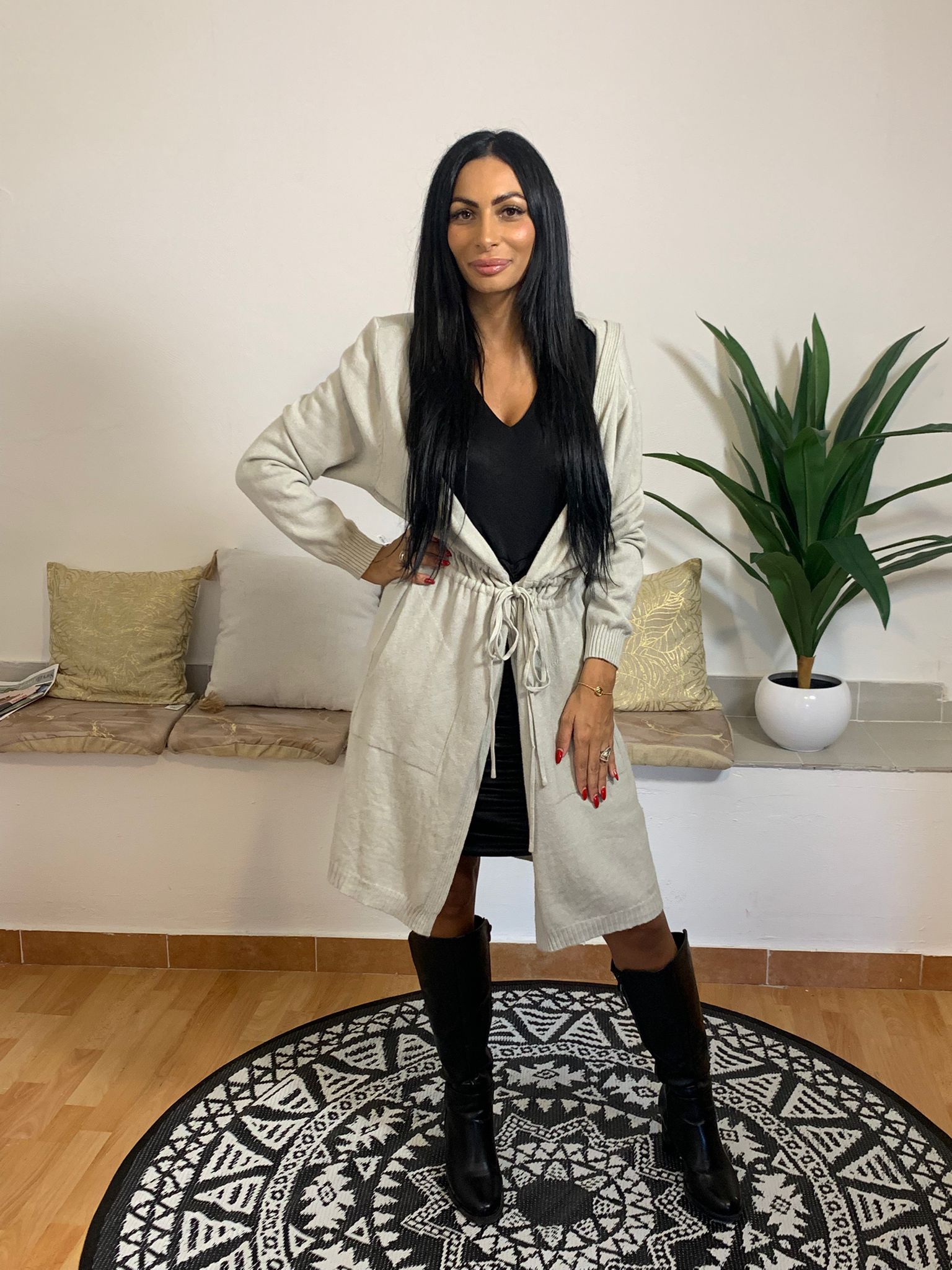 CARDIGAN TOY G. CARDIGAN TOY G GRIGIO CON PRESENZA DI CAPPUCCIO TASCHE E CINTURA CHE STRINGENDOLA FA ARRICCIARE IL CENTRO DEL CARDIGAN 56% VISCOSA 28% POLIESTERE 16% POLIAMMIDE. LA MODELLA CHE LO INDOSSA