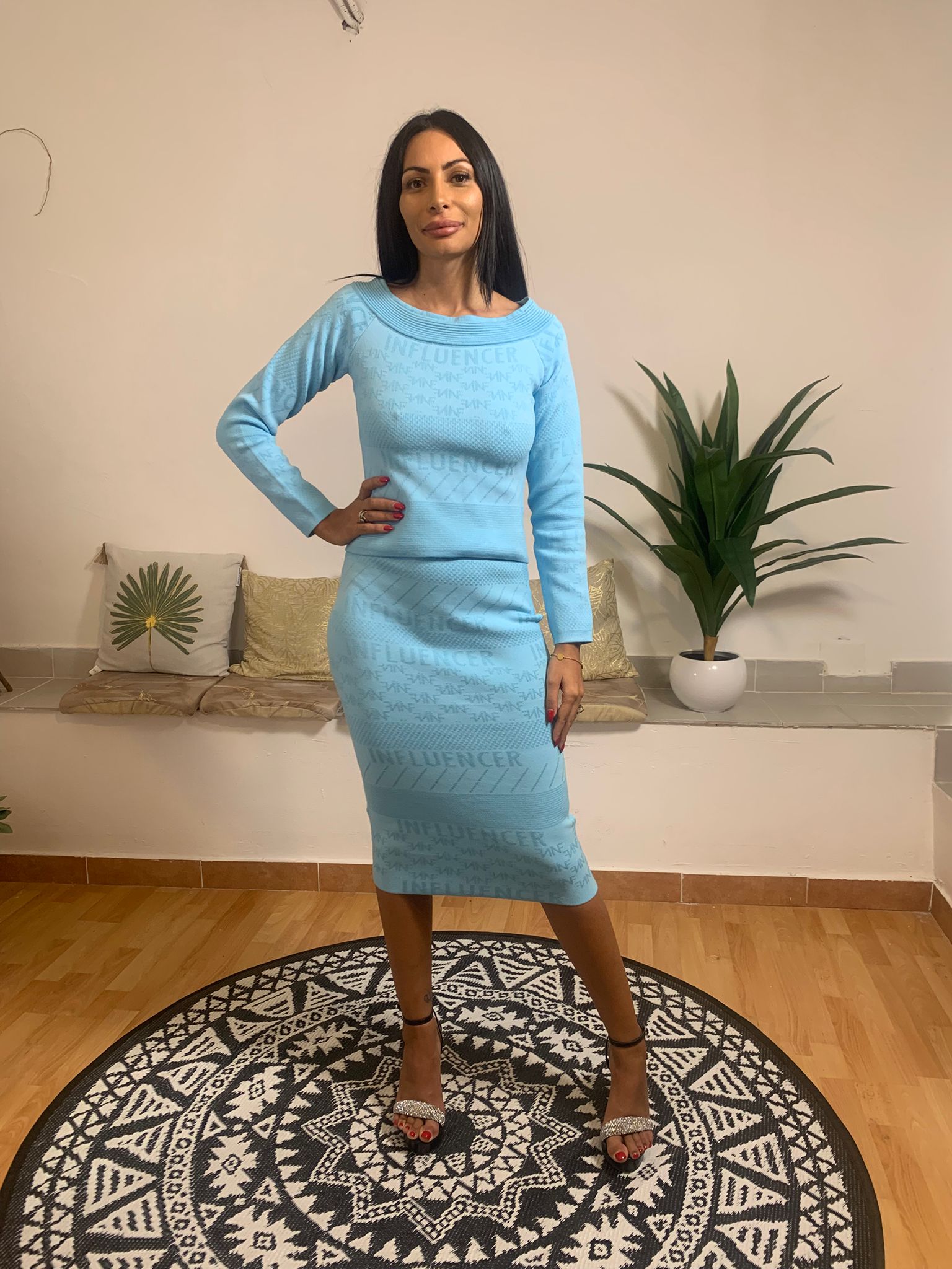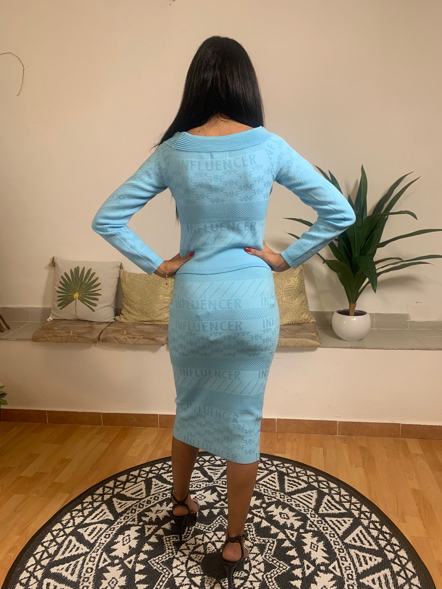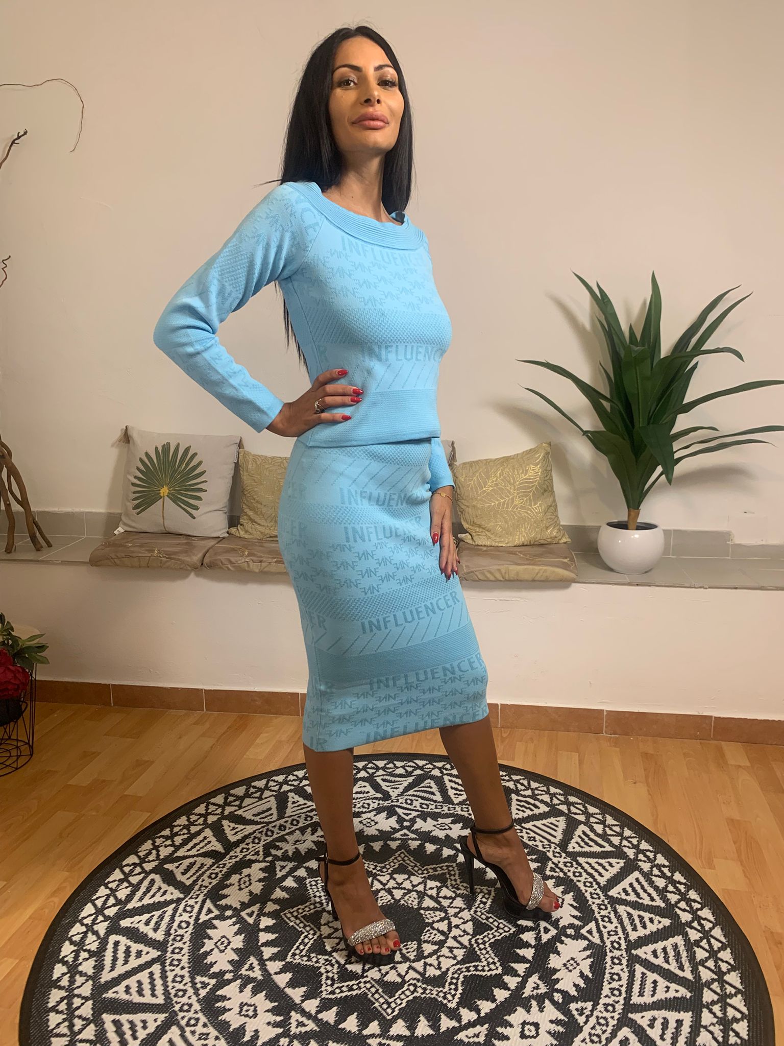 INFLUENCER ha creato questo raffinato coordinato formato da una maglia con scollo a barca e una gonna aderente realizzata completamente in maglina senza zip. Entrambi i capi presentano il motivo del nome del brand lavorato su tutta la superficie. La modella, alta 175 cm e con un peso di 54 kg, indossa una taglia M. Il tessuto è composto da 72% viscosa e 28% poliammide.