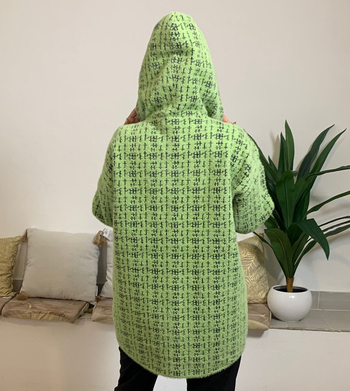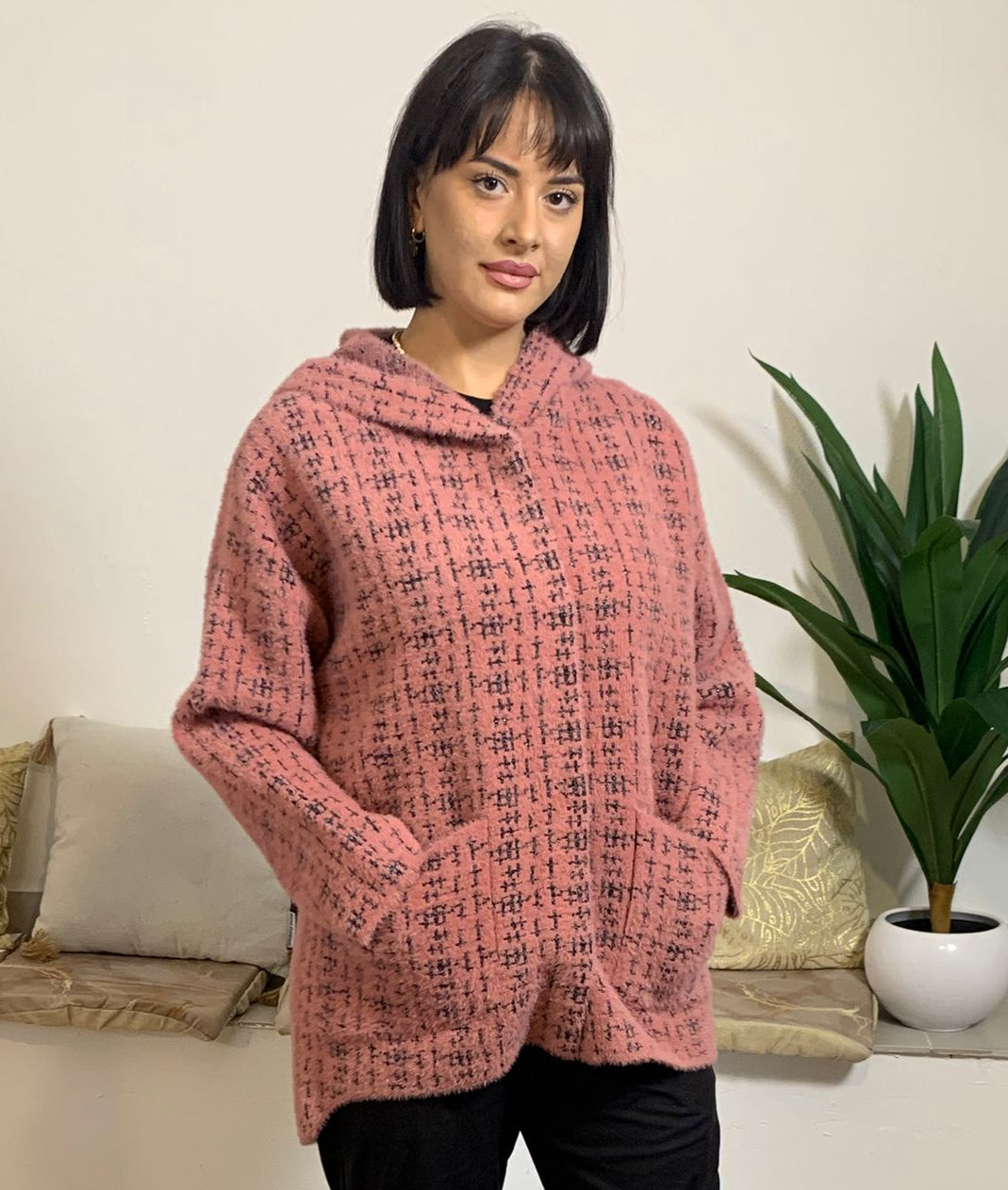 PEGGY HO propone un giubbino corto in maglia caratterizzato da bottoni a pressione e un cappuccio, impreziosito da una fantasia vivace. La modella alta 175 cm e con un peso di 54 kg indossa la taglia S nella tonalità verde menta, mentre la modella di 170 cm e 62 kg sceglie la taglia L nei colori verde salvia e rosa cipria. Realizzato in un mix di 70% poliammide e 30% poliestere, assicura comfort e durata nel tempo.