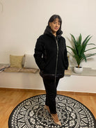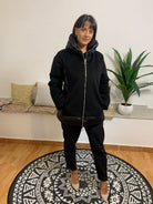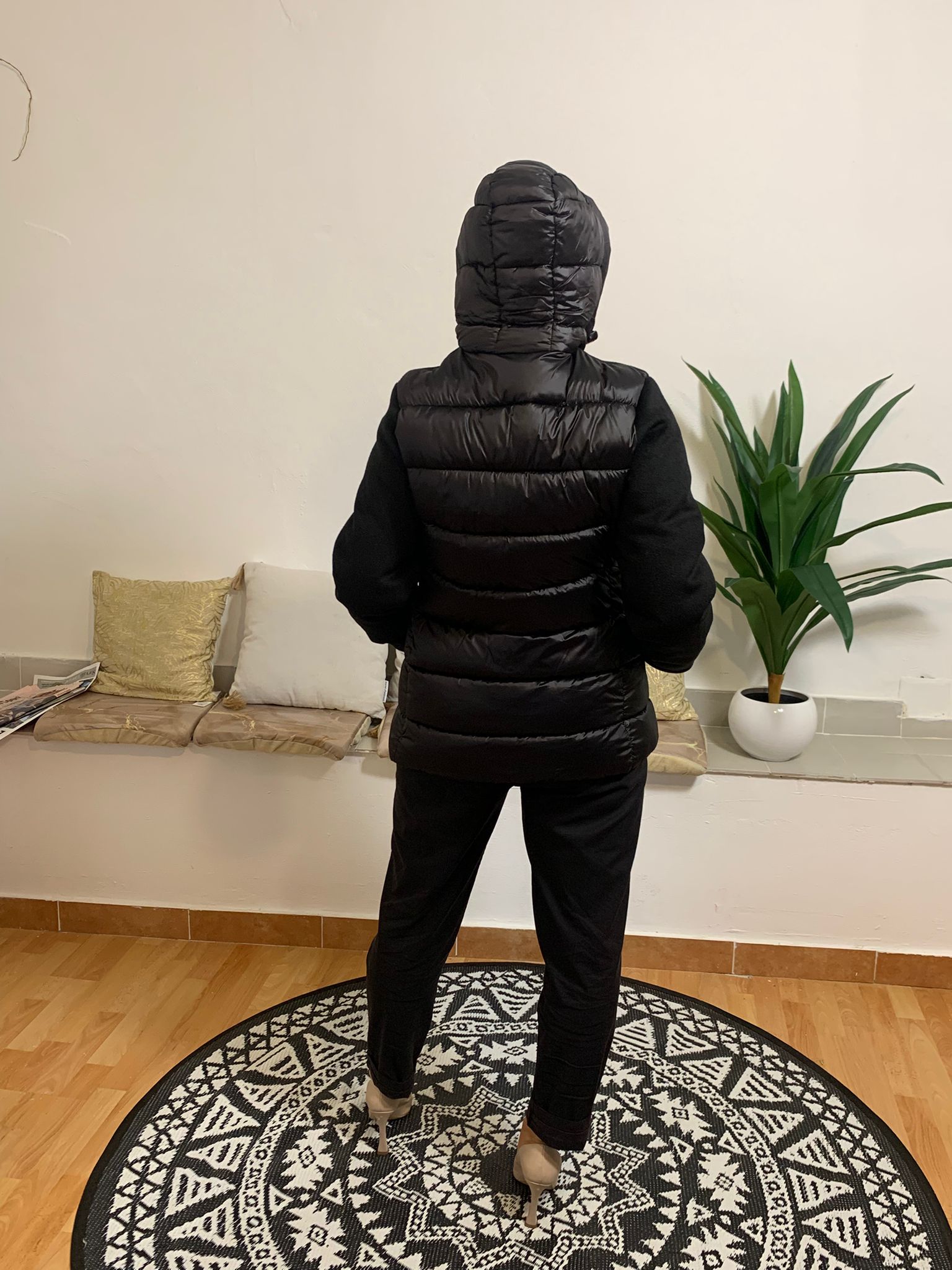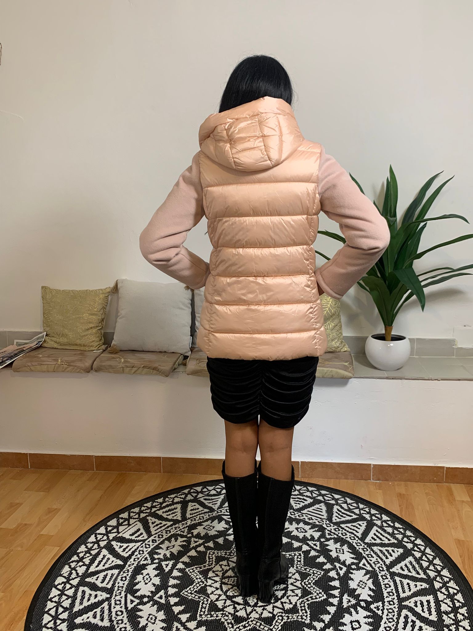 Il GIUBBINO PEGGY HO è un capo invernale con piumino sul retro e tessuto tecnico sul davanti. È dotato di cappuccio e di tasche con chiusura a zip, impreziosite da un ciondolo argentato a forma di cerchio. L’interno è composto da 65% acrilica e 35% cotone, mentre l’esterno è realizzato al 100% in poliammide. La modella indossa una taglia adatta alla sua altezza di 175 cm e peso di 54 kg.