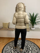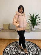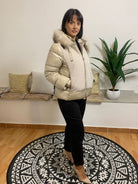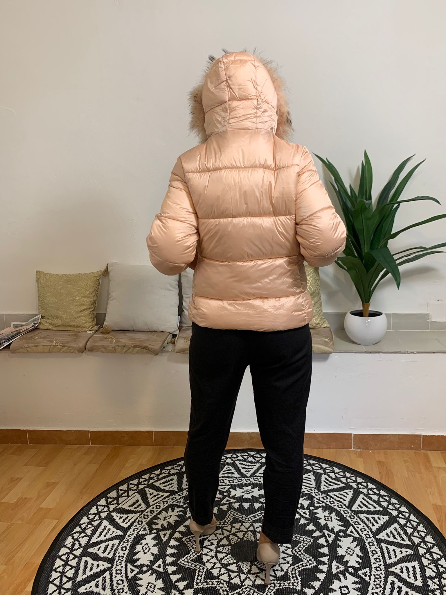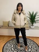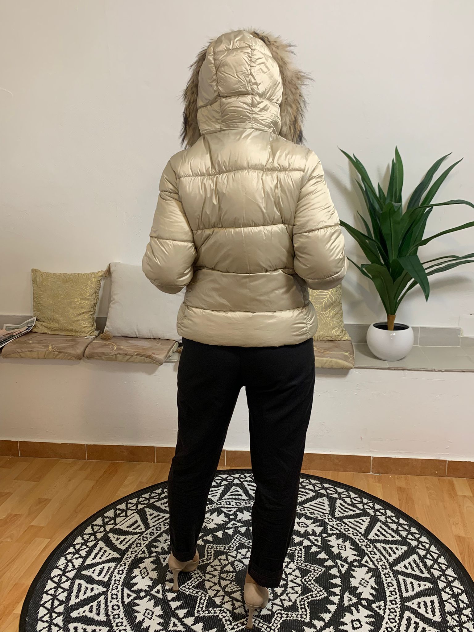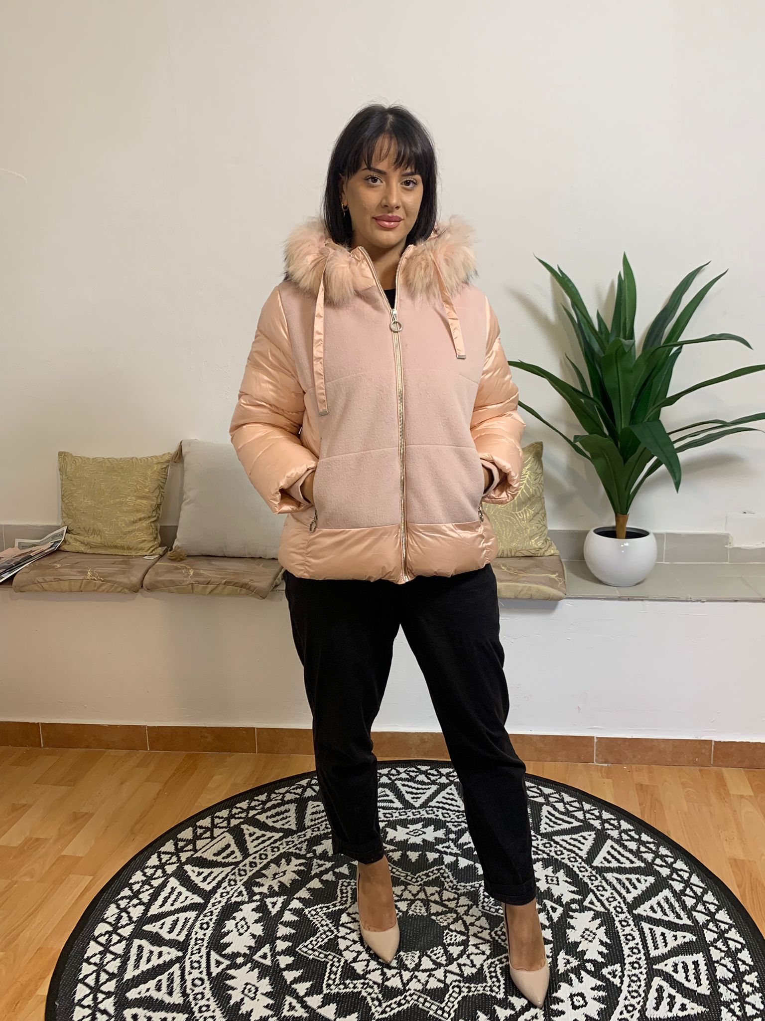 Il giubbino Toy G presenta pratiche tasche e un cappuccio rifinito con pelliccia, variabile in base al colore del capo. Dotato di lacci per la regolazione del cappuccio, combina due tessuti: esterno in 100% poliammide e interno in una miscela di 65% acrilica e 35% cotone. Le zip sono arricchite da anelli dorati che impreziosiscono il design. La modella indossa una taglia adatta alla sua altezza di 170 cm e peso di 62 kg.