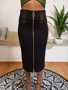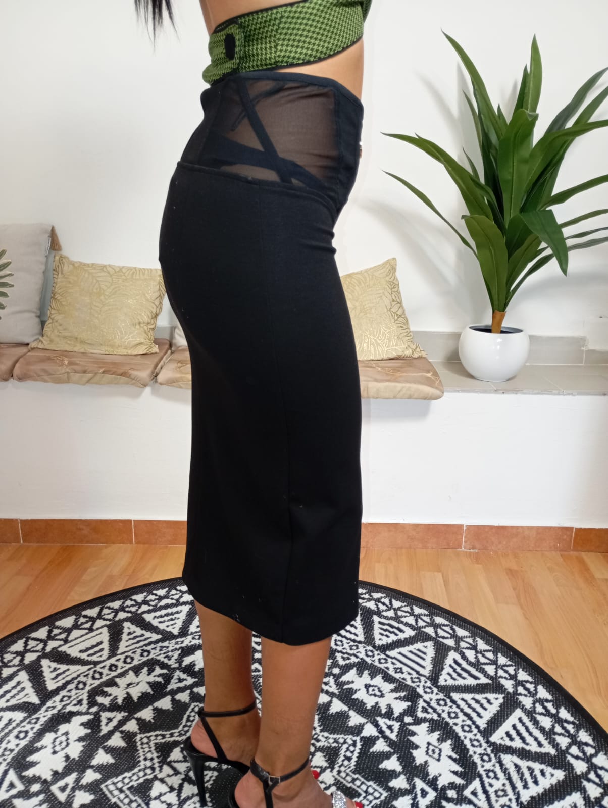 Pinko presenta una gonna lunga che si distingue per il design unico con zip frontale. I fianchi trasparenti si combinano con un tessuto morbido e modellante, garantendo comfort e una vestibilità perfetta. Il capo è indossato da una modella alta 175 cm, taglia 40, peso 54 kg. Realizzata in 67% viscosa, 28% poliammide e 5% elastan, unisce stile e qualità nei dettagli.
